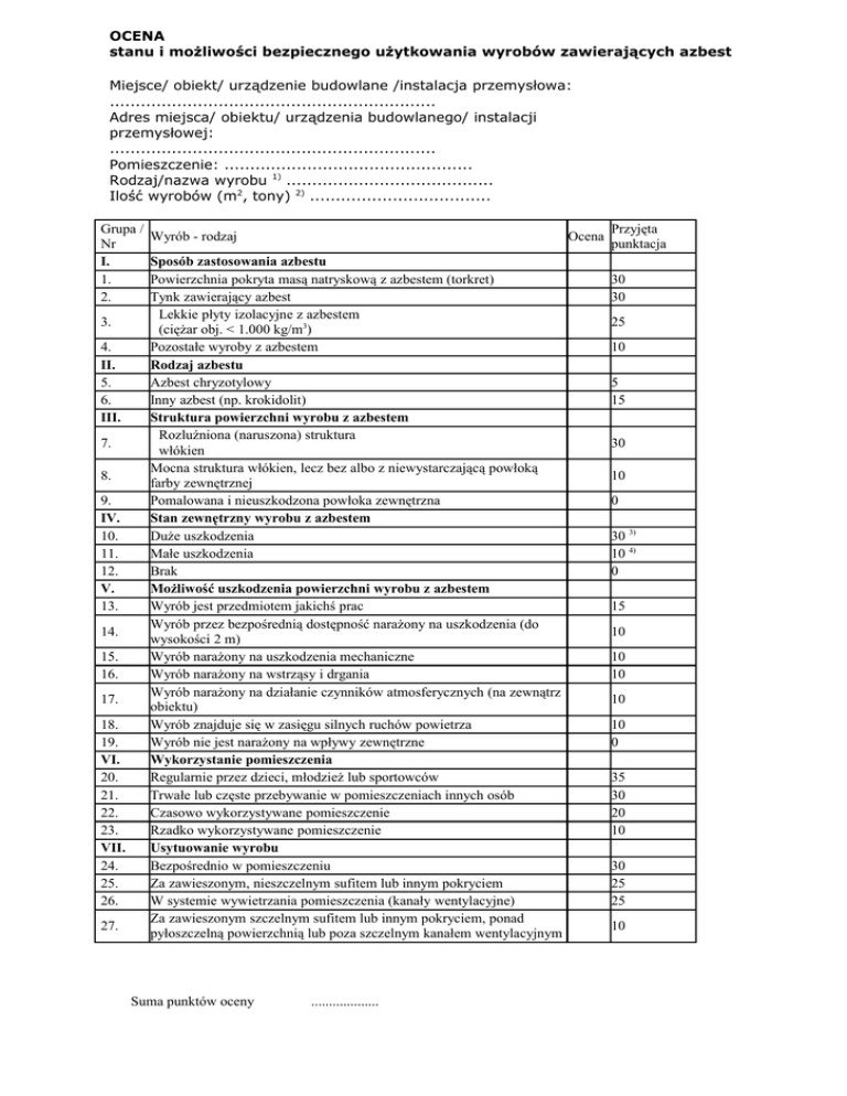 OCENA stanu i możliwości bezpiecznego użytkowania wyrobów zawierających azbest Miejsce/ obiekt/ urządzenie budowlane /instalacja przemysłowa: ............................................................... Adres miejsca/ obiektu/ urządzenia budowlanego/ instalacji przemysłowej: ............................................................... Pomieszczenie: ................................................ Rodzaj/nazwa wyrobu 1) ........................................ Ilość wyrobów (m2, tony) 2) ................................... Grupa / Nr I. 1. 2. 3. 4. II. 5. 6. III. 7. 8. 9. IV. 10. 11. 12. V. 13. 14. 15. 16. 17. 18. 19. VI. 20. 21. 22. 23. VII. 24. 25. 26. 27. Wyrób - rodzaj Ocena Sposób zastosowania azbestu Powierzchnia pokryta masą natryskową z azbestem (torkret) Tynk zawierający azbest Lekkie płyty izolacyjne z azbestem (ciężar obj. < 1.000 kg/m3) Pozostałe wyroby z azbestem Rodzaj azbestu Azbest chryzotylowy Inny azbest (np. krokidolit) Struktura powierzchni wyrobu z azbestem Rozluźniona (naruszona) struktura włókien Mocna struktura włókien, lecz bez albo z niewystarczającą powłoką farby zewnętrznej Pomalowana i nieuszkodzona powłoka zewnętrzna Stan zewnętrzny wyrobu z azbestem Duże uszkodzenia Małe uszkodzenia Brak Możliwość uszkodzenia powierzchni wyrobu z azbestem Wyrób jest przedmiotem jakichś prac Wyrób przez bezpośrednią dostępność narażony na uszkodzenia (do wysokości 2 m) Wyrób narażony na uszkodzenia mechaniczne Wyrób narażony na wstrząsy i drgania Wyrób narażony na działanie czynników atmosferycznych (na zewnątrz obiektu) Wyrób znajduje się w zasięgu silnych ruchów powietrza Wyrób nie jest narażony na wpływy zewnętrzne Wykorzystanie pomieszczenia Regularnie przez dzieci, młodzież lub sportowców Trwałe lub częste przebywanie w pomieszczeniach innych osób Czasowo wykorzystywane pomieszczenie Rzadko wykorzystywane pomieszczenie Usytuowanie wyrobu Bezpośrednio w pomieszczeniu Za zawieszonym, nieszczelnym sufitem lub innym pokryciem W systemie wywietrzania pomieszczenia (kanały wentylacyjne) Za zawieszonym szczelnym sufitem lub innym pokryciem, ponad pyłoszczelną powierzchnią lub poza szczelnym kanałem wentylacyjnym Suma punktów oceny ................... Przyjęta punktacja 30 30 25 10 5 15 30 10 0 30 3) 10 4) 0 15 10 10 10 10 10 0 35 30 20 10 30 25 25 10 Stopień pilności I (wymiana lub naprawa wymagana 65 i więcej punktów bezzwłocznie) Stopień pilności II (ponowna ocena wymagana w czasie powyżej 35 do 60 do 1 roku) punktów Stopień pilności III (ponowna ocena w terminie do 5 lat) do 35 punktów UWAGA: podkreślić należy tylko jedną pozycję w grupie, jeśli wystąpi więcej niż jedna, podkreślić należy najwyższą punktację. Zsumować ilość punktów, ustalić ocenę końcową i stopień pilności. ............................. ......................... Oceniający nazwisko i imię Właściciel / Zarządca ......................... Adres data .............. 1) Według klasyfikacji wyrobów przyjętych w sprawozdaniu rocznym - załącznik nr 2 do rozporządzenia Ministra Gospodarki, Pracy i Polityki Społecznej z dnia 23 października 2003r. w sprawie wymagań w zakresie wykorzystywania i przemieszczania azbestu oraz wykorzystywania i oczyszczania instalacji lub urządzeń, w których był lub jest wykorzystywany azbest (Dz. U. Nr 192, poz. 1876). 2) Zgodnie z inwentaryzacją i sprawozdaniem rocznym - § 7 wymienionego w odnośniku 1 rozporządzenia. 3) Duże uszkodzenia - widoczne pęknięcia lub ubytki na powierzchni równej lub większej niż 3 % powierzchni wyrobu. 4) Małe uszkodzenia - brak widocznych pęknięć, a ubytki na powierzchni mniejszej niż 3 % powierzchni wyrobu.