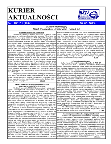 KURIER AKTUALNOŚCI Nr 18/ 15 / (1104) 20. 05. 2015 r. Biuletyn Informacyjny NSZZ Pracowników ArcelorMittal Poland SA Problemy w Spółkach hutniczych Sytuacja w Spółkach około - hutniczych z dnia na dzień staje się coraz trudniejsza. Brak decyzji o remoncie WP, a także nie kończące się negocjacje płacowe w AMP SA przekładają się na złą kondycję Spółek. Oczekiwanie na strategiczną decyzję dotyczącą części Surowcowej w Krakowie jest dla wielu Spółek z gatunku być albo nie być. Spółki, dla których AMP SA jest największym odbiorcą remontów i usług wstrzymują zakupy materiałów i sprzętu, który może być wykorzystany w sytuacji działalności krakowskiej Huty w pełnym cyklu produkcyjnym. Do tego dochodzą jeszcze ciągłe naciski o oszczędności i obniżenie kosztów w Spółkach. Nie trzeba wspominać o nastrojach panujących wśród pracowników Spółek, gdzie poza wyjątkami takimi jak AMDS (Strony ustaliły wzrost wynagrodzeń) brak rozmów o podwyżkach. Spółki zależne takie jak np. Kolprem oczekują na decyzje w AMP SA. Niestety są też Spółki hutnicze, gdzie trudna sytuacja może nie pozwolić na dokonanie przez Pracodawcę podwyżek płac. W tych Spółkach załoga wręcz obawia się o miejsca pracy z powodu niewielkich zamówień. W dwóch Spółkach odlewniczych (Metalodlew i Krakodlew) sytuacja jest zmienna, okresy dobre przekładają się z mniejszymi zamówieniami. Niejasna jest sytuacja w Spółce HUT - PUS SA, gdzie do dnia dzisiejszego nie ma podpisanej umowy na żywienie i sprzątanie z AMP SA. Decydenci powinni zdawać sobie sprawę jakie nastroje panują wśród pracowników Spółek i jaki mają one wpływ na jakość pracy i przede wszystkim na BHP. Oczekujemy na szybkie i pozytywne decyzje bowiem cierpliwość pracowników Spółek około hutniczych ma swoje granice. T. Ziołek Wicepremier Janusz Piechociński optymistą w sprawie remontu WP w Krakowie. W ubiegły czwartek, 14.05.2015 roku, gościem władz rządowych i samorządowych województwa małopolskiego był wicepremier RP, minister gospodarki, Pan Janusz Piechociński. Gospodarzem spotkania, które odbyło się w Urzędzie Wojewódzkim, był wojewoda małopolski Pan Jerzy Miller. W części rozmów dotyczących przyszłości naszej dzielnicy, huty stali, a w szczególności części surowcowej w Krakowie, uczestniczyli również prezes AMP S.A. Pan Sanjay Samaddar oraz prezydent m. Krakowa Pan Jacek Majchrowski. Na spotkaniu z dziennikarzami wicepremier powiedział: „Mogę tylko powiedzieć, że perspektywa nie tylko modernizacji wielkiego pieca w Krakowie staje się pewna - mówił Janusz Piechociński i zaznaczał, że jest w tej sprawie optymistą. Zwracając się do dziennikarzy użył też następującego sformułowania: „ Nie ulegajcie presji, kiedy jesteśmy na etapie negocjacji i rozmów, bo każdy się targuje i chciałby za rządowe wsparcie zrobić to co musi w ramach modernizacji tego biznesu. Pamiętajmy o tym, że w Polsce w ubiegłym roku był 17 % wzrost sprzedaży stali, w związku tym Mittal na polskim rynku jest nie tylko szanowanym inwestorem, znanym wytwórcą, ale także ma określone zyski. Już wkrótce Pani premier ogłosi program dla Śląska i Zachodniej Małopolski, związany z modernizacją terenów poprzemysłowych, w tym górniczych. I w tym programie znajdzie się tez, jak sądzę, duży akapit poświęcony Nowej Hucie”. Chcielibyśmy tą drogą zwrócić uwagę Panu wicepremierowi, że z tego 17 % wzrostu sprzedaży stali w roku 2014, aż 10 % stanowił import. Wicepremier Piechociński poinformował również, że przemysł hutniczy będzie uwzględniony w tzw. ustawie modernizacyjnej, która ma ratować zagrożone firmy przemysłowe i promować nowe inwestycje. Jako pierwsze mogą skorzystać z niej woj. śląskie i małopolskie. Ustawa, która zostać przedstawiona do końca maja br. będzie jednym z elementów planu inwestycyjnego dla Europy (tzw. planu Junckera). Plan ten ma uruchomić publiczne i prywatne inwestycje rzędu co najmniej 315 mld euro w ciągu najbliższych trzech lat (2015-2017). W rozmowie z dziennikarką prowadzącą „Tematy dnia” w TVP Regionalna wicepremier J. Piechociński potwierdził jeszcze raz, że hutnicy z Nowej Huty doczekają się remontu wielkiego pieca. Przekazał widzom informację, że trwają w tej sprawie negocjacje i uzgodnienia, w jaki sposób, dopuszczalnymi formami wsparcia, może wspomóc ten proces państwo polskie. Na zakończenie audycji telewizyjnej w TVP Kraków powiedział: „ dla hutników z AMP S.A. O/Kraków będę miał dobrą wiadomość, jak wkrótce wrócę z Londynu”. Trzymamy za słowo Panie wicepremierze i mamy nadzieję, ze nie są to tylko kolejne, niespełnione, obietnice przedwyborcze tego rządu. K. Bąk Informacja z posiedzenia Małopolskiej Komisji Świadczeń Socjalnych AMP SA W dniu 20.03.2015 r., odbyło się posiedzenie Małopolskiej Komisji Świadczeń Socjalnych, które prowadziła Przewodnicząca Pani Jadwiga Radowiecka. Przewodnicząca przedstawiła wykorzystanie środków ZFŚS - Kraków wg danych na dzień 30.04.2015r, następnie omówiła temat przyznawania pożyczek na cele mieszkaniowe. Wnioski w roku bieżącym złożyło 275 pracowników, w tym 25 pracowników ubiega się o pożyczki na zakup lub budowę lokalu mieszkalnego, 4 pracowników, którzy złożyli wnioski posiada zadłużenie, 1 ma zawieszone świadczenia, 1 posiada umowę o pracę na czas określony do końca roku. Przyjęto jeszcze jeden wniosek złożony po terminie z powodu długiego „chorobowego” pracownika. Po analizie sytuacji dochodowej pracowników istnieją wątpliwości co do możliwości spłaty pożyczek i te wnioski będą wymagały uzgodnień. Temat przydziału pożyczek zostanie omówiony na następnym posiedzeniu. Następnie Komisja rozpatrzyła wnioski o zapomogi dla: -byłych pracowników EiR, pracowników Zakładu Stalowni PSK2, pracowników zakładu K
