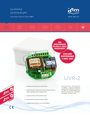 systemy automatyki www.dtm.pl dwukanałowy odbiornik radiowy UVR-2 Odbiorniki zdalnego sterowania Nadajniki zdalnego sterowania Sterowniki do automatyki bramowej Akcesoria do automatyki bramowej Siłowniki do automatyki bramowej Kontrola dostępu DWA ODSEPAROWANE WYJŚCIA O DUŻEJ OBIĄŻALNOŚCI ZASILANIE BEZPOŚREDNIO Z SIECI 230V UVR-2 ch: ja ers y pn ww stę do obudowa natynkowa lub podtynkowa zaawansowane możliwości i proste programowanie dzięki sygnalizacyjnym diodom LED regulacja czasu podtrzymania wyjść TI UL M maksymalne obciążenie wyjścia 600W współpracuje z pilotami serii DTM433MHz Wszechstronne zastosowanie w zdalnym i ręcznym sterowaniu urządzeniami zasilanymi napięciem do 230V AC i maksymalnej mocy pobieranej 600W jak: oświetlenie, wentylacja, nawadnianie itp. dwukanałowy odbiornik radiowy UVR-2 Parametry podstawowe zasilanie: maksymalny pobór prądu: pojemność pamięci: temperatura pracy (min./max.): gabaryty zewnętrzne obudowy (szer. x głęb. x wys.): sposób montażu: 230V AC 5VA 35 pilotów, każdy o indywidualnym numerze w pamięci -20°C /+55°C 89x89x52mm (obudowa natynkowa) obudowa natynkowa lub puszka instalacyjna o średnicy 70mm i głębokości 40mm waga: 170g Elementy wykonawcze wyjścia przekaźnikowe (typ / ilość / maksymalne obciążenie): NO lub NC / 2 / 600W 230V AC tryby pracy wyjść: monostabilny, bistabilny lub chwilowy regulacja czasu podtrzymania wyjścia w trybie monostabilnym: 0,5 sek., od 1 do 127 sek. z rozdzielczością 1 sek., oraz od 1 min. do 127 min. z rozdzielczością 1 min. wejścia ręcznego sterowania wyjściami odbiornika: 2 typu NO Parametry radiowe moduł radiowy: zintegrowany, superheterodynowy, zapewniający wysoką niezawodność, powtarzalność i odporność na zakłócenia radiowe zabezpieczenie transmisji: 64 - bitowy kod dynamicznie zmienny Keeloq® rodzaj modulacji / częstotliwość: ASK / 433,92MHz impedancja wejściowa anteny: 50 Ω antena: wewnętrzna, zaciski do podłączenia anteny zewnętrznej Pozostałe parametry komórka pamięci: zawiera dane na temat każdego pilota i jego konfiguracji (przypisanie funkcji do przycisków) pamięć konfiguracji urządzenia: nieulotna, zawarta wewnątrz mikrokontrolera ochrona przed krytycznymi zdarzeniami: układy: Watch Dog, Brown Out Detect, Power On Reset Funkcjonalność interfejs użytkownika: sprzętowy interfejs na sześciu diodach i dwóch przyciskach, obsługujących proste menu konfiguracja pilota: możliwość przypisania dowolnego z dwóch kanałów odbiornika do dowolnego przycisku możliwość kasowania całej pamięci: tak możliwość kasowania pojedynczego pilota: tak, konieczność posiadania usuwanego pilota Odbiorniki zdalnego sterowania Nadajniki zdalnego sterowania Sterowniki do automatyki bramowej Akcesoria do automatyki bramowej systemy automatyki DTM System, ul. Brzeska 7, 85-145 Bydgoszcz, tel./fax +48 52 340 15 83, e-mail: [email protected] www.dtm.pl Siłowniki do automatyki bramowej Kontrola dostępu