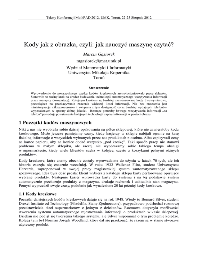 Teksty Konferencji MathPAD 2012, UMK, Toruń, 22-25 Sierpnia 2012 Kody jak z obrazka, czyli: jak nauczyć maszynę czytać? Marcin Gąsiorek [email protected] Wydział Matematyki i Informatyki Uniwersytet Mikołaja Kopernika Toruń Streszczenie Wprowadzenie do powszechnego użytku kodów kreskowych zrewolucjonizowało pracę sklepów. Stanowiło to ważny krok na drodze budowania technologii automatycznego wczytywania informacji przez maszyny (komputery). Kolejnym krokiem są bardziej zaawansowane kody dwuwymiarowe, pozwalające na przekazywanie znacznie większej ilości informacji. Nie bez znaczenia jest miniaturyzacja mikroprocesorów i związana z tym dostępność coraz bardziej wydajnych telefonów wyposażonych w aparaty dobrej jakości. Rosnące potrzeby łatwego wczytywania informacji „na telefon” powoduje powstawanie kolejnych technologii zapisu informacji w postaci obrazu. 1 Początki kodów maszynowych Nikt z nas nie wyobraża sobie dzisiaj opakowania na półce sklepowej, które nie zawierałoby kodu kreskowego. Może jeszcze pamiętamy czasy, kiedy kasjerzy w sklepie nabijali ręcznie na kasę fiskalną informacje o wszystkich wybranych przez nas produktach z osobna. Albo zapisywali ceny na kartce papieru, aby na koniec dodać wszystko „pod kreskę”. Taki sposób pracy nie stanowi problemu w małym sklepiku, ale raczej nie wyobrażamy sobie takiego tempa obsługi w supermarkecie, kiedy wielu klientów czeka w kolejce, często z koszykami pełnymi różnych produktów. Kody kreskowe, które znamy obecnie zostały wprowadzone do użycia w latach 70-tych, ale ich historia zaczęła się znacznie wcześniej. W roku 1932 Wallence Flint, student Uniwersytetu Harvarda, zaproponował w swojej pracy magisterskiej system zautomatyzowanego sklepu spożywczego. Idea była dość prosta: klient wybiera z katalogu sklepu karty perforowane opisujące wybrane produkty. Następnie kasjer wprowadza karty do systemu i na tej podstawie system automatycznie przekazuje produkty z magazynu, drukuje rachunek i uaktualnia stan magazynu. Pomysł wyprzedził swoje czasy, podobnie jak wynalezione 20 lat później kody kreskowe. 1.1 Kody kreskowe Początki dzisiejszych kodów kreskowych datuje się na rok 1948. Wtedy to Bernard Silver, student Drexel Institute od Technology (Filadelfia, Stany Zjednoczone), przypadkowo podsłuchał rozmowę przedstawiciela sieci supermarketów z jednym z dziekanów. Rozmowa dotyczyła możliwości stworzenia systemu automatycznego rejestrowania informacji o produktach w kasie sklepowej. Dziekan nie podjął się tworzenia takiego systemu, ale Silver wspomniał o tym problemie koledze. Kolegą tym był Norman Joseph Woodland, który dał się przekonać, że razem są w stanie stworzyć użyteczny produkt. Teksty Konferencji Mathpad 2012, UMK, Toruń, 22-25 Sierpnia 2012 Inspiracją dla Woodlanda był alfabet Morse'a, który zapisuje się w formie serii kropek i kresek. Jeśli rozciągniemy je w pionie zobaczymy pasek przypominający dzisiejszy kod kreskowy. Pomysłem Silvera, który miał usprawnić odczyt kodu pod dowolnym kątem było zawinięcie go do postaci okręgu, który przypominał tarczę strzelniczą. Rysunek 1: Schemat pierwszego kodu kreskowego opatentowanego w 1952 roku Silver i Woodland 20 października 1949 roku złożyli wniosek patentowy, który został pomyślnie rozpatrzony i trzy lata później otrzymali patent na swoje rozwiązanie. Niestety natrafili na bardzo poważny problem: nie umieli skonstruować małego urządzenia, które mogłoby go odczytywać. Sprzedali patent firmie Philco, zakupionej następnie przez RCA, która do wygaśnięcia patentu w 1969 roku bezskutecznie próbowała wprowadzić rozwiązanie na rynek. Sieci handlowe zainteresowały się na poważnie pomysłem automatycznego odczytywania informacji o produktach dopiero na początku lat siedemdziesiątych. Prace nad pierwszym standardem kodu kreskowego na potrzeby sklepów detalicznych (USA i Kanada) zakończyły się w roku 1973, kiedy to oficjalnie zatwierdzono standard kodu kreskowego UPC (Universal Product Code). Przygotowała go firma IBM, a konkretniej zespół kierowany przez Woodlanda. Tak powstał standard kodu kreskowego który znamy dzisiaj. 2 Teksty Konferencji Mathpad 2012, UMK, Toruń, 22-25 Sierpnia 2012 Rysunek 2: Notka dla historyków: wszystko zaczęło się od gumy do żucia. 26 czerwca 1974 roku, o godzinie 8:01 rano w supermarkecie Marsh w Troy, w stanie Ohio, po raz pierwszy zeskanowany został kod UPC. Kupującym był Clyde Dawson, natomiast kasjerką Sharon Buchanan. 1.2 Europejski Kod Towarowy W 1976 roku stworzony został EAN (European Article Number) – europejski standard kodów kreskowych. Dokładnie ten sam standard wykorzystywany jest dzisiaj w większości krajów świata. Wraz z wprowadzeniem na inne rynki niż Europejski nazwą zmieniono na International Article Number (jednakże ciągle wykorzystuje się skrót EAN). Kody kreskowe EAN do złudzenia przypominają wyglądem kody UPC wprowadzone w Stanach Zjednoczonych. Różnica tkwi w interpretacji zawartości kodu: kiedy przygotowywano kod EAN już na wstępie wiadomo było, że będzie on wykorzystywany w wielu krajach i musi zezwalać na opisanie większej ilości produktów. Większość produktów oznakowana jest kodem w standardzie EAN-13, krótszy EAN-8 spotykany jest na czasopismach oraz produktach posiadających małe opakowania. Rysunek 3: Przykładowe kody kreskowe w standardzie EAN. Numer zapisany w kodzie to GTIN (Global Trade Item Number). 2 Kody dwuwymiarowe Kody kreskowe znakomicie sprawdziły się w sklepach. Firmy zaczęły je wykorzystywać do śledzenia procesu produkcyjnego w fabrykach. Każdą część można oznaczyć i monitorować jej położenie. Po pewnym czasie pojawił się problem ograniczonej pojemności kodu kreskowego. Radzono sobie z nim początkowo wydłużając kod czy też zapisując kilka kodów jeden nad drugim. 3 Teksty Konferencji Mathpad 2012, UM