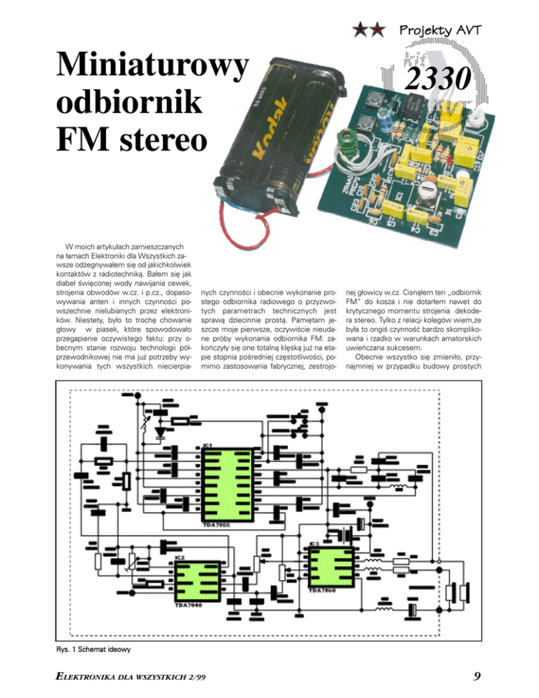 Projekty AVT Miniaturowy odbiornik FM stereo W moich artykułach zamieszczanych na łamach Elektroniki dla Wszystkich za− wsze odżegnywałem się od jakichkolwiek kontaktów z radiotechniką. Bałem się jak diabeł święconej wody nawijania cewek, strojenia obwodów w.cz. i p.cz., dopaso− wywania anten i innych czynności po− wszechnie nielubianych przez elektroni− ków. Niestety, było to trochę chowanie głowy w piasek, które spowodowało przegapienie oczywistego faktu: przy o− becnym stanie rozwoju technologii pół− przewodnikowej nie ma już potrzeby wy− konywania tych wszystkich niecierpia− nych czynności i obecnie wykonanie pro− stego odbiornika radiowego o przyzwoi− tych parametrach technicznych jest sprawą dziecinnie prostą. Pamiętam je− szcze moje pierwsze, oczywiście nieuda− ne próby wykonania odbiornika FM: za− kończyły się one totalną klęską już na eta− pie stopnia pośredniej częstotliwości, po− mimo zastosowania fabrycznej, zestrojo− 2330 nej głowicy w.cz. Cisnąłem ten „odbiornik FM“ do kosza i nie dotarłem nawet do krytycznego momentu strojenia dekode− ra stereo. Tylko z relacji kolegów wiem,że była to ongiś czynność bardzo skompliko− wana i rzadko w warunkach amatorskich uwieńczana sukcesem. Obecnie wszystko się zmieniło, przy− najmniej w przypadku budowy prostych Rys. 1 Schemat ideowy ELEKTRONIKA DLA WSZYSTKICH 2/99 9 Projekty AVT odbiorników radiowych o niezbyt „wyśrubowanych“ parametrach. Propo− nowany dzisiaj układ będzie zawierał tylko jedną strojoną indukcyjność: fabry− cznie wykonaną cewkę, którą zestroić będziemy mogli „na słuch“, starając się uzyskać maksymalną liczbę odbieranych stacji. Drugim elementem strojeniowym będzie potencjometr montażowy służący do wyregulowania dekodera stereo. Tak− że tę czynność będziemy mogli z powo− dzeniem wykonać bez jakichkolwiek ko− sztownych przyrządów pomiarowych, kierując się jedynie oceną jakości odbie− ranego sygnału stereofonicznego. A teraz wielka prośba do moich Czytel− ników: nie patrzcie jeszcze na rysunek przedstawiający płytkę obwodu drukowa− nego naszego odbiornika FM stereo i cier− pliwie wysłuchajcie, co mam Wam do po− wiedzenia. Proponowany układ wykonany jest z wykorzystaniem trzech układów scalonych, w tym z dwóch zrealizowa− nych w technologii SMD! Wiem, że nie− których z Was ogarnęło przerażenie, ale zupełnie niesłusznie. Z pewnością każdy z Was poradzi sobie z przylutowaniem tych dwóch układów, oczywiście pod warun− kiem przestrzegania zawartych w dalszej części artykułu wskazówek. Nie odwróci− my biegu czasu i postępu w technologii budowy układów elektronicznych: mon− taż w technice SMD istnieje, staje się co− raz bardziej popularny i prędzej czy później musimy się nim zająć! Starałem się zresztą za pierwszym razem „oszczędzić“ moich Czytelników i zastosowałem tylko te dwa układy scalone w technologii SMD. Pozostała część układu będzie montowana tradycyjnie, pomimo że spo− wodowało to znaczne zwiększenie wy− miarów płytki obwodu drukowanego. Opracowany przeze mnie układ odbior− nika FM jest, poza wspomnianymi wyżej elementami SMD, bardzo łatwy w monta− żu i nie wymaga jakiegokolwiek urucha− miania. Dlatego też jego wykonanie mogę z czystym sumieniem polecić nawet zu− pełnie początkującym elektronikom, któ− rzy powinni być dumni z pierwszego włas− noręcznie wykonanego radioodbiornika. Opis Schemat elektryczny układu odbiorni− ka FM stereo został pokazany na rysunku 1. Możemy podzielić go, podobnie jak schematy większości odbiorników radio− wych, na trzy bloki funkcjonalne: blok tu− nera UKF zrealizowany na układzie scalo− nym TDA7088, blok dekodera sygnału stereo wykonany w oparciu o układ TDA7040 i wzmacniacz wyjściowy, które− go rolę pełni podwójny scalony wzmac− niacz mocy TDA7050. Omówimy teraz kolejno działanie poszczególnych bloków, rozpoczynając od tunera. 10 Każdy nowoczesny tuner (odbiornik ra− strajania odbiornika, który w momencie diowy pozbawiony układów wyjścio− odebrania sygnału stacji jest przerywany wych) musi składać się z następu przez sygnały pochodzące z układu wyciszania − „mute“. Następnie jest uru− jących elementów: 1. Układu wejściowego zawierającego chamiany układ ARCz, utrzymujący war− tość napięcia przestrajającego na poziomie obwód antenowy i wzmacniacz w.cz. 2. Układu generatora lokalnego (hete− odpowiadającym dostrojeniu do tej właś− rodyny) generującego częstotliwość nie stacji. Stan ten trwa do momentu po− równą częstotliwości fali nośnej odbiera− nownego naciśnięcia przełącznika urucha− nej stacji radiowej powiększoną lub pom− miającego układ poszukiwania stacji. Po− niejszoną o wartość częstotliwości poś− ziom napięcia na kondensatorze ograniczo− ny jest do zakresu 0...1,8V, co jest wartoś− redniej. 3. Układu mieszacza i wzmacniacza cią znacznie niższą od minimalnego napię− p.cz. (pośredniej częstotliwości), którego cia zasilania całego układu. Dioda pojem− zadaniem jest zmieszanie ze sobą prze− nościowa powinna być tak dobrana, by u− biegu pochodzącego z radiostacji z prze− możliwiała przestrojenie całego zakresu biegiem tworzonym przez generator lo− VHF przy zmianie napięcia w przedziale kalny, a następnie wzmocnienie sygnału 0...1,8V. Naciśnięcie przełącznika zerujące− będącego efektem zdudnienia dwóch go układ poszukiwania stacji powoduje roz− ładowanie kondensatora i rozpoczęcie częstotliwości. 4. Mniej lub bardziej skomplikowane− przeszukiwania od dołu pasma. Pewnym go układu przestrajania generatora lokal− mankamentem układu TDA7088 jest fakt, że nie jest on w stanie zapamiętać częstot− nego. 5. ARCz (automatycznej regulacji liwości odebranych