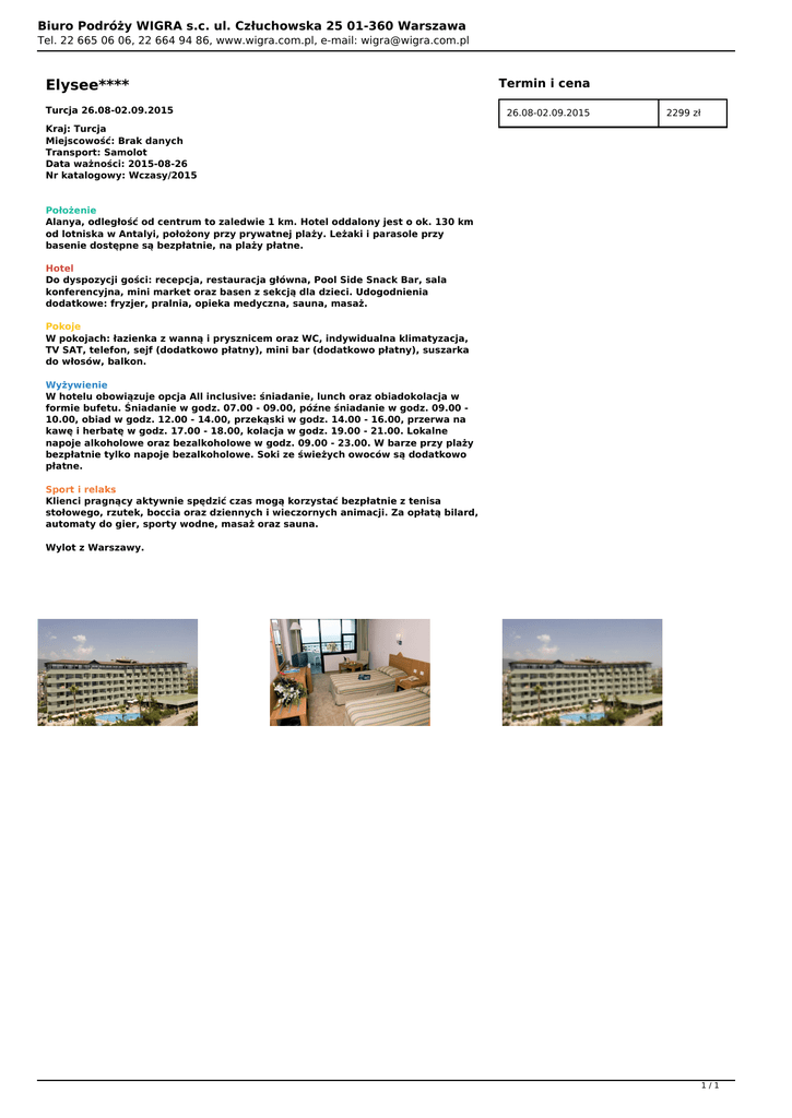 Biuro Podróży WIGRA s.c. ul. Człuchowska 25 01-360 Warszawa Tel. 22 665 06 06, 22 664 94 86, www.wigra.com.pl, e-mail: [email protected] Elysee**** Turcja 26.08-02.09.2015 Termin i cena 26.08-02.09.2015 2299 zł Kraj: Turcja Miejscowość: Brak danych Transport: Samolot Data ważności: 2015-08-26 Nr katalogowy: Wczasy/2015 Położenie Alanya, odległość od centrum to zaledwie 1 km. Hotel oddalony jest o ok. 130 km od lotniska w Antalyi, położony przy prywatnej plaży. Leżaki i parasole przy basenie dostępne są bezpłatnie, na plaży płatne. Hotel Do dyspozycji gości: recepcja, restauracja główna, Pool Side Snack Bar, sala konferencyjna, mini market oraz basen z sekcją dla dzieci. Udogodnienia dodatkowe: fryzjer, pralnia, opieka medyczna, sauna, masaż. Pokoje W pokojach: łazienka z wanną i prysznicem oraz WC, indywidualna klimatyzacja, TV SAT, telefon, sejf (dodatkowo płatny), mini bar (dodatkowo płatny), suszarka do włosów, balkon. Wyżywienie W hotelu obowiązuje opcja All inclusive: śniadanie, lunch oraz obiadokolacja w formie bufetu. Śniadanie w godz. 07.00 - 09.00, późne śniadanie w godz. 09.00 10.00, obiad w godz. 12.00 - 14.00, przekąski w godz. 14.00 - 16.00, przerwa na kawę i herbatę w godz. 17.00 - 18.00, kolacja w godz. 19.00 - 21.00. Lokalne napoje alkoholowe oraz bezalkoholowe w godz. 09.00 - 23.00. W barze przy plaży bezpłatnie tylko napoje bezalkoholowe. Soki ze świeżych owoców są dodatkowo płatne. Sport i relaks Klienci pragnący aktywnie spędzić czas mogą korzystać bezpłatnie z tenisa stołowego, rzutek, boccia oraz dziennych i wieczornych animacji. Za opłatą bilard, automaty do gier, sporty wodne, masaż oraz sauna. Wylot z Warszawy. 1/1 Powered by TCPDF (www.tcpdf.org)