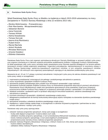 Powiatowy Urząd Pracy w Kłodzku http://pup.klodzko.pl/strona/powiatowa-rada-rynku-pracy/145 Powiatowa Rada Rynku Pracy Skład Powiatowej Rady Rynku Pracy w Kłodzku na kadencję w latach 2015-2019 ustanowiony na mocy Zarządzenia nr 75/2015 Starosty Kłodzkiego z dnia 22 września 2015 roku ● ● ● ● ● ● ● ● ● ● ● ● ● ● Monika Wielichowska – Przewodniczący Piotr Marchewka - Wiceprzewodniczący Sebastian Borecki Irena Foremnik Tomasz Kiliński Halina Kowalewska Tomasz Korczak Joanna Kraj-Plenkiewicz Hubert Krech Maciej Machela Antoni Muskała Mirosław Niemczura Urszula Osiadacz Elżbieta Ulatowska Powiatowa Rada Rynku Pracy jest organem opiniodawczo-doradczym Starosty Kłodzkiego w sprawach polityki rynku pracy oraz organem stanowiącym w zakresie ustalania priorytetów wydatkowania środków z Krajowego Funduszu Szkoleniowego. W skład powiatowej rady rynku pracy wchodzą osoby powoływane przez Starostę spośród działających na terenie powiatu terenowych struktur każdej organizacji związkowej i organizacji pracodawców, reprezentatywnych w rozumieniu ustawy o Radzie Dialogu Społecznego, społeczno-zawodowych organizacji rolników, w tym związków zawodowych rolników indywidualnych i izb rolniczych oraz organizacji pozarządowych zajmujących się statutowo problematyką rynku pracy. Stosownie do art. 22 ust. 5-7 ustawy o promocji zatrudnienia i instytucjach rynku pracy do zakresu działania powiatowych rad rynku pracy należy w szczególności: 1. 2. 3. 4. 5. 6. 7. 8. 9. inspirowanie przedsięwzięć zmierzających do pełnego i produktywnego zatrudnienia w powiecie; ocena racjonalności gospodarki środkami Funduszu Pracy; opiniowanie projektu powiatowego planu działań oraz okresowych sprawozdań z jego realizacji; opiniowanie kryteriów podziału środków Funduszu Pracy na finansowanie programów dotyczących promocji zatrudnienia i finansowanie innych fakultatywnych zadań oraz opiniowanie opracowanych przez powiatowy urząd pracy propozycji przeznaczenia środków Funduszu Pracy będących w dyspozycji samorządu powiatu i sprawozdań z ich wykorzystania; składanie wniosków i wydawanie opinii w sprawach dotyczących kierunków kształcenia, szkolenia zawodowego oraz zatrudnienia w powiecie; ocenianie okresowych sprawozdań z działalności powiatowego urzędu pracy; delegowanie przedstawicieli do komisji konkursowej dokonującej wyboru kandydata na stanowisko dyrektora powiatowego urzędu pracy; opiniowanie wniosków o odwołanie dyrektora powiatowego urzędu pracy; współpraca z radami dialogu społecznego, w szczególności w zakresie inicjowania programów i partnerstwa na rzecz wzrostu zatrudnienia i rozwoju rynku pracy. Powiatowe rady rynku pracy opiniują także: 1. celowość realizacji programów specjalnych, biorąc pod uwagę w szczególności: liczbę osób objętych programem i kryteria doboru tych osób, zakładane rezultaty programu specjalnego, w tym przewidywaną efektywność kosztową i zatrudnieniową, koszty realizacji programu specjalnego, w tym poszczególnych przedsięwzięć; proponowane przez starostę zmiany realizacji programów specjalnych; 2. celowość realizacji Programu Aktywizacja i Integracja, o którym mowa w art. 62a, biorąc pod uwagę w szczególności: kryteria doboru bezrobotnych, zakładane efekty realizacji Programu Aktywizacja i Integracja. ❍ ❍ ❍ ❍ ❍ ❍