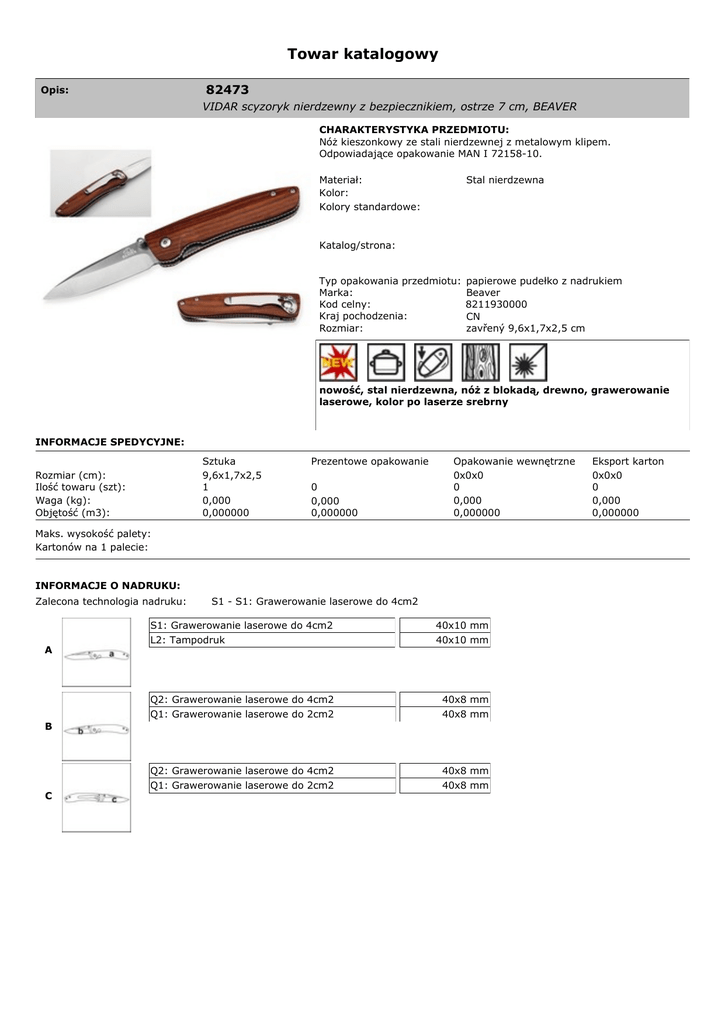 Towar katalogowy 82473 Opis: VIDAR scyzoryk nierdzewny z bezpiecznikiem, ostrze 7 cm, BEAVER CHARAKTERYSTYKA PRZEDMIOTU: Nóż kieszonkowy ze stali nierdzewnej z metalowym klipem. Odpowiadające opakowanie MAN I 72158-10. Stal nierdzewna Materiał: Kolor: Kolory standardowe: Katalog/strona: Typ opakowania przedmiotu: Marka: Kod celny: Kraj pochodzenia: Rozmiar: papierowe pudełko z nadrukiem Beaver 8211930000 CN zavřený 9,6x1,7x2,5 cm nowość, stal nierdzewna, nóż z blokadą, drewno, grawerowanie laserowe, kolor po laserze srebrny INFORMACJE SPEDYCYJNE: Sztuka 9,6x1,7x2,5 1 0,000 0,000000 Rozmiar (cm): Ilość towaru (szt): Waga (kg): Objętość (m3): Prezentowe opakowanie 0 0,000 0,000000 Opakowanie wewnętrzne 0x0x0 0 0,000 0,000000 Maks. wysokość palety: Kartonów na 1 palecie: INFORMACJE O NADRUKU: Zalecona technologia nadruku: S1 - S1: Grawerowanie laserowe do 4cm2 S1: Grawerowanie laserowe do 4cm2 A L2: Tampodruk 40x10 mm 40x10 mm Q2: Grawerowanie laserowe do 4cm2 Q1: Grawerowanie laserowe do 2cm2 40x8 mm 40x8 mm Q2: Grawerowanie laserowe do 4cm2 Q1: Grawerowanie laserowe do 2cm2 40x8 mm 40x8 mm B C Eksport karton 0x0x0 0 0,000 0,000000