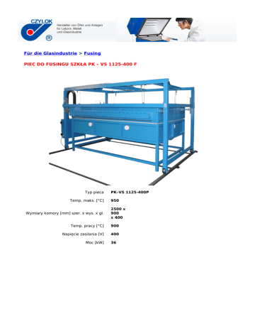 Für die Glasindustrie > Fusing PIEC DO FUSINGU SZKŁA PK – VS 1125-400 F Typ pieca Temp. maks. [°C] Wymiary komory [mm] szer. x wys. x gł. PK–VS 1125-400P 950 2500 x 900 x 400 Temp. pracy [°C] 900 Napięcie zasilania [V] 400 Moc [kW] 36 POZOSTAŁE WYKONANIA PIECA Typ pieca Wykonanie Opis wykonania F K PK – VS 1125-400 M P Uchylna pokrywa (pokrywa oraz stół stanowią całość) Uchylna pokrywa, przejezdny stół Unoszona pokrywa, przejezdny stół Unoszona przejezdna pokrywa, stacjonarny stół Bei Fragen nehmen Sie mit uns Kontakt auf: Tel. 32 47 07 495 Tel./Fax. 32 47 07 502 e-mail: [email protected]