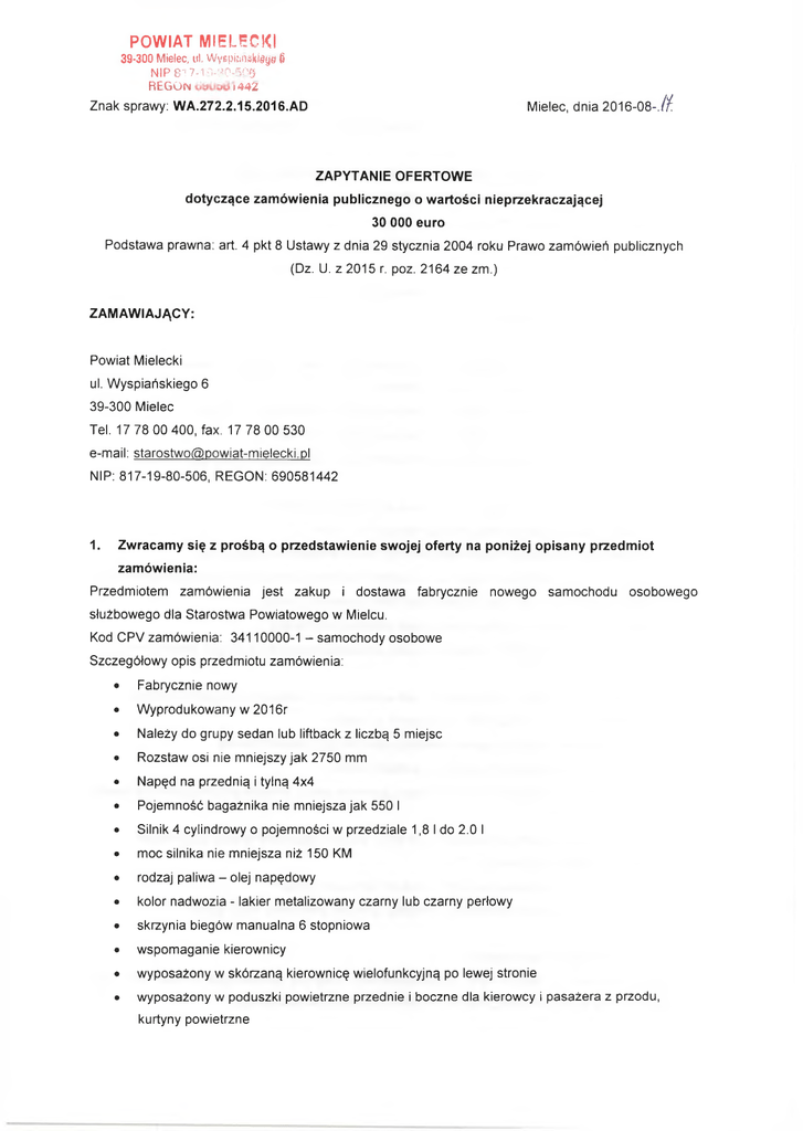 PO W IAT M IELECKI 39-300 Mielec, ul. Wyspl&itekiSgS § NIP 8'l7-19-80-500 REGON 1442 Znak sprawy: WA.272.2.15.2016.AD Mielec, dnia 2016-08 -If. ZAPYTANIE OFERTOWE dotyczące zamówienia publicznego o wartości nieprzekraczającej 30 000 euro Podstawa prawna: art. 4 pkt 8 Ustawy z dnia 29 stycznia 2004 roku Prawo zamówień publicznych (Dz. U. z 2015 r. poz. 2164 ze zm.) ZAMAWIAJĄCY: Powiat Mielecki ul. Wyspiańskiego 6 39-300 Mielec Tel. 17 78 00 400, fax. 17 78 00 530 e-mail: [email protected] NIP: 817-19-80-506, REGON: 690581442 1. Zwracamy się z prośbą o przedstawienie swojej oferty na poniżej opisany przedmiot zamówienia: Przedmiotem zamówienia jest zakup i dostawa fabrycznie nowego samochodu osobowego służbowego dla Starostwa Powiatowego w Mielcu. Kod CPV zamówienia: 34110000-1 - samochody osobowe Szczegółowy opis przedmiotu zamówienia: • Fabrycznie nowy • Wyprodukowany w 2016r • Należy do grupy sedan lub liftback z liczbą 5 miejsc • Rozstaw osi nie mniejszy jak 2750 mm • Napęd na przednią i tylną 4x4 • Pojemność bagażnika nie mniejsza jak 550 I • Silnik 4 cylindrowy o pojemności w przedziale 1,8 I do 2.0 I • moc silnika nie mniejsza niż 150 KM • rodzaj paliwa - olej napędowy • kolor nadwozia - lakier metalizowany czarny lub czarny perłowy • skrzynia biegów manualna 6 stopniowa • wspomaganie kierownicy • wyposażony w skórzaną kierownicę wielofunkcyjną po lewej stronie • wyposażony w poduszki powietrzne przednie i boczne dla kierowcy i pasażera z przodu, kurtyny powietrzne • wyposażony w min. 4 drzwi • wyposażony w fabryczne przednie reflektory wykonane w technologii ksenonowej, biksenonowej lub LED • wyposażony w światła do jazdy dziennej wykonane w technologii LED • wyposażony w przednie światła przeciwmgłowe • wyposażony w czujnik deszczu • wyposażony w hamulce tarczowe z przodu i z tyłu • wyposażony w ABS • wyposażony w system elektronicznej stabilizacji toru jazdy • wyposażony w immobiliser • wyposażony w tempomat • wyposażony w pięć bezwładnościowych 3-punktowych pasów bezpieczeństwa z regulacją wysokości i napinaczami dla siedzeń przednich • wyposażony w fabryczny centralny zamek ze zdalnym sterowaniem - 2 piloty • wyposażony w fabryczny autoalarm wraz z czujnikami wnętrza • wyposażony w co najmniej tylne czujniki parkowania - system kontroli odstępu podczas parkowania • wyposażony w klimatyzację automatyczną co najmniej dwustrefową • wyposażony w podgrzewaną elektrycznie przednią szybę • wyposażony w elektrycznie podnoszone i opuszczane szyby z przodu i z tyłu • wyposażony w elektrycznie regulowane lusterka zewnętrzne wraz z systemem podgrzewania • elektrycznie sterowany fotel kierowcy oraz fotel pasażera z przodu • podgrzewane fotele przednie i zewnętrzne miejsca tylnej kanapy • wyposażony w fabrycznie montowane rolety przeciwsłoneczne szyb tylnych bocznych i szyby tylnej • wyposażony w fabrycznie montowany radioodtwarzacz z tunerem fm rds wraz z mp3 lub wejściem na kartę SD lub USB - minimum 6 głośników • Wyposażony w fabryczny system nawigacji satelitarnej z mapami Europy • wyposażony w tapicerkę materiałową, wnętrze czarne • wyposażony w komplet kół (4 szt.) - letnie ogumienie wraz z fabrycznymi obręczami ze stopów lekkich 18” lub 19" • wyposażony w dodatkowy komplet kół (4 szt.) - zimowe ogumienie wraz z oryginalnymi obręczami ze stopów lekkich 17” 2. • wyposażony w koło zapasowe ulokowane we fabrycznej wnęce • wyposażony w trójkąt odblaskowy, apteczkę, gaśnicę, podnośnik, klucz do kół Inne istotne warunki zamówienia: 1) Siedziba serwisu, w którym będą przeprowadzane przeglądy gwarancyjne i inne, nie może znajdować się w większej odległości niż 70 km od siedziby Zamawiającego. 2) Podstawą wystawienia faktury przez Wykonawcę jest protokół końcowy odbioru przedmiotu zamówienia. 3) Płatność za przedmiot umowy nastąpi na podstawie przedłożonej faktury VAT, w terminie 14 dni od daty przedłożenia Zamawiającemu prawidłowo wystawionej faktury. 4) Wymagany okres gwarancji: a) gwarancja podstawowa: minimum 2 lata bez limitu kilometrów, b) gwarancja na perforację nadwozia minimum: 12 lat, c) gwarancja na powłokę lakierniczą minimum: 3 lata. 3. Termin i miejsce realizacji zamówienia: 1) Zamówienie musi być zrealizowane w terminie nie dłuższym niż 90 dni od dnia podpisania umowy. 2) Odbiór samochodu w siedzibie (salonie) Wykonawcy. Jeżeli siedziba Wykonawcy, którego oferta uznana zostanie za najkorzystniejszą będzie znajdowała się w odległości większej niż 100 km do siedziby Zamawiającego, Wykonawca dostarczy przedmiot zamówienia na własny koszt. 4. Opis warunków udziału w postępowaniu oraz dokumenty wymagane w ofercie: 1) Warunki udziału w postępowaniu: O zamówienie mogą ubiegać się Wykonawcy, którzy spełniają następujące warunki: a) posiadają uprawnienia do wykonywania określonej działalności lub czynności, jeżeli ustawy nakładają obowiązek posiadania takich uprawnień. Zamawiający nie stawia szczegółowych wymagań w zakresie spełniania tego warunku. Wykonawca potwierdza spełnianie warunku poprzez złożenie oświadczenia. b) posiadają niezbędną wiedzę i doświadczenie oraz dysponują potencjałem technicznym i osobami zdolnymi do wykonania zamówienia. Zamawiający nie stawia szczegółowych wymagań w zakresie spełniania tego warunku. Wykonawca potwierdza spełnianie warunku poprzez złożenie oświadczenia. 2) Wykonawca powinien przedstawić następujące oświadczenia i dokumenty: a) ofertę należy złożyć na załączonym formularzu oferty - Załącznik nr 1, b) oświadczenie o spełnianiu warunków udziału w postępowaniu - Załącznik nr 2, c) aktualny odpis z właściwego rejestru lub z centralnej ewidencji informacji o działalności gospodarczej wystawiony nie wcześniej niż 6 miesi