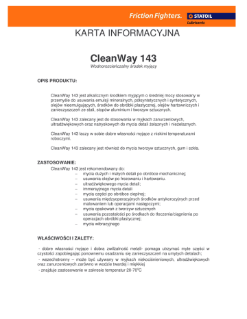 KARTA INFORMACYJNA CleanWay 143 Wodnorozcie czalny rodek myj cy OPIS PRODUKTU: CleanWay 143 jest alkalicznym rodkiem myj cym o redniej mocy stosowany w przemy le do usuwania emulsji mineralnych, półsyntetycznych i syntetycznych, olejów nieemulguj cych, rodków do obróbki plastycznej, olejów hartowniczych i zanieczyszcze ze stali, stopów aluminium i tworzyw sztucznych. CleanWay 143 zalecany jest do stosowania w myjkach zanurzeniowych, ultrad wi kowych oraz natryskowych do mycia detali elaznych i nie elaznych. CleanWay 143 łaczy w sobie dobre własno ci myj ce z niskimi temperaturami roboczymi. CleanWay 143 zalecany jest równie do mycia tworzyw sztucznych, gum i szkła. ZASTOSOWANIE: CleanWay 143 jest rekomendowany do: − mycia du ych i małych detali po obróbce mechanicznej; − usuwania olejów po frezowaniu i hartowaniu. − ultrad wi kowego mycia detali; − immersyjnego mycia detali − mycia cz ci po obróbce cieplnej; − usuwania mi dzyoperacyjnych rodków antykorozyjnych przed malowaniem lub operacjami nast pczymi; − mycia opakowa z tworzyw sztucznych − usuwania pozostało ci po rodkach do tłoczenia/ci gnienia po operacjach obróbki plastycznej; − mycia wibracyjnego WŁA CIWO CI I ZALETY: - dobre własno ci myj ce i dobra zwil alno metali- pomaga utrzyma myte cz ci w czysto ci zapobiegaj c ponownemu osadzaniu si zanieczyszcze na umytych detalach; - wszechstronny – mo e by u ywany w myjkach niskoci nieniowych, ultrad wi kowych oraz zanurzeniowych zarówno w wodzie twardej i mi kkiej - znajduje zastosowanie w zakresie temperatur 20-70oC SPOSÓB U YCIA: CleanWay 143 mo e by mieszany z wi kszo ci rodzajów wody. Wła ciwe st enie zale e b dzie od metody aplikacji, temperatury, czasu u ytkowania, intensywno ci procesu mycia i rodzaju zanieczyszcze . Zalecane st enia pocz tkowe Rodzaj mycia Mycie zanurzeniowe ( immersyjne) Mycie ultrad wi kowe Mycie Natryskowe ( niskoci nieniowe) Zalecane st enie 4 % - 10% 4% - 10% 2% - 4% Zalecana temperatura pracy 20 – 70 oC 20 – 70 oC 50-70 oC Współczynnik refraktometru wynosi 5,0 PARAMETRY FIZYKO-CHEMICZNE: WYGL D ZAPACH CI AR WŁA CIWY pH ( r-r 5%) jasny płyn łagodny 1,06 w 20°C 11,5 PRZEWÓZ I MAGAZYNOWANIE: Chroni przed mrozem. Przechowywa w temperaturze od 5 do 35°C. OPAKOWANIE: 20, 208 litrów KARTA BEZPIECZE STWA PRODUKTU: Wszystkie informacje dotycz ce Zdrowia, Bezpiecze stwa i rodowiska oraz inne specyficzne informacje powinny by zaczerpni te z Karty Charakterystyki Substancji Niebezpiecznej i Preparatu Niebezpiecznego.