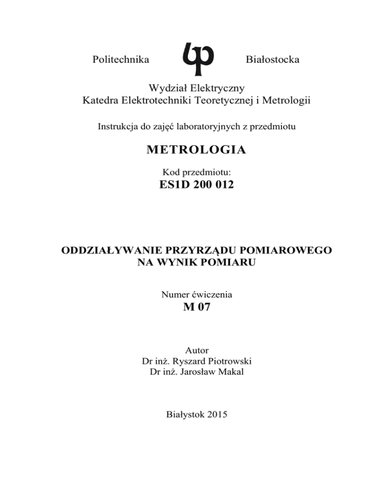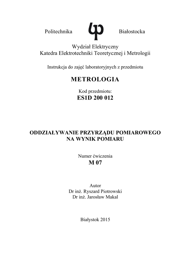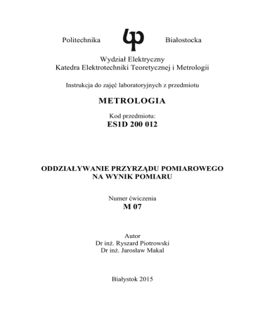Białostocka Politechnika Wydział Elektryczny Katedra Elektrotechniki Teoretycznej i Metrologii Instrukcja do zajęć laboratoryjnych z przedmiotu METROLOGIA Kod przedmiotu: ES1D 200 012 ODDZIAŁYWANIE PRZYRZĄDU POMIAROWEGO NA WYNIK POMIARU Numer ćwiczenia M 07 Autor Dr inż. Ryszard Piotrowski Dr inż. Jarosław Makal Białystok 2015 Celem niniejszego ćwiczenia jest nabycie umiejętności definiowania mezurandu w eksperymencie pomiarowym oraz uwzględniania wpływu przyrządów pomiarowych na wynik pomiaru. 1. Wprowadzenie ddziaływanie elektrycznych przyrządów pomiarowych na obiekt badany (sieć elektryczną) polega na zmianie rozkładu napięć i rozpływu prądów, jaką wywołuje włączenie tych przyrządów do sieci. Włączenie przyrządu pomiarowego oznacza pojawienie się w sieci/obwodzie dodatkowej impedancji (rezystancji) i w rezultacie zniekształceniu ulega także wartość wielkości, którą zamierzaliśmy zmierzyć. Zmiany te mogą być w niektórych wypadkach pomijalnie małe, w innych bardzo wyraźne, zawsze jednak istnieją. Planując pomiar, należy wybrać taką metodę oraz takie narzędzia pomiarowe, które wspomniane zniekształcenie sprowadzą do pomijalnie małych rozmiarów. Gdy jednak jest to niemożliwe, należy ustalić wartość poprawki, jaka powinna być wniesiona do wyniku pomiaru. Wartość tej poprawki jest równa różnicy pomiędzy wartością faktycznie mierzoną, a wartością mezurandu (wartość wielkości, którą chcemy zmierzyć). O Należy w każdym zadaniu pomiarowym umieć zdefiniować dokładnie wielkość, którą powinniśmy zmierzyć (tzw. mezurand) i wielkość, którą w rzeczywistości mierzymy. Niekiedy celem pomiaru nie jest określenie wartości rzeczywistej mierzonej wielkości, lecz kontrola jej stanu. Wystarczy wtedy, aby pomiar wykonywany był za każdym razem tym samym przyrządem, gdyż wtedy stan kontrolowanej wielkości będzie tak samo zniekształcany. Na przykład producenci sprzętu elektronicznego podają na schematach serwisowych swoich urządzeń wartości napięć, jakie powinny wystąpić w najważniejszych punktach obwodu sprawnego urządzenia. Jednocześnie podają informację dotyczącą właściwości woltomierza, którym należy te napięcia mierzyć. Zwykle jest to jego rezystancja wewnętrzna jednostkowa, czyli rezystancja wewnętrzna woltomierza przypadająca na jeden wolt zakresu pomiarowego, oznaczana często grecką literą „kappa”, np. κ= 20 000 /V. Ćwicz. M 07 Oddziaływanie przyrządu pomiarowego ... 2 Parametr ten pozwala obliczyć rezystancję wewnętrzną woltomierza dla każdego zakresu, w który jest on wyposażony. Rezystancję wewnętrzną RV oblicza się jako iloczyn zakresu pomiarowego Un i rezystancji wewnętrznej jednostkowej κ, mianowicie RV = κ Un Producenci przyrządów cyfrowych zwykle podają w karcie katalogowej wartość rezystancji obwodu wejściowego danego przyrządu. Problem oddziaływania przyrządów pomiarowych na wynik pomiaru daje się bliżej skonkretyzować. Wynika to z faktu, że podstawowymi przyrządami pomiarowymi są amperomierze i woltomierze. Pozostałe przyrządy można uznać za odmiany tych ostatnich lub ich złożenia (np. watomierz). Amperomierz włączany jest zawsze (lub prawie zawsze) szeregowo z gałęzią sieci, zaś woltomierz równolegle do gałęzi (rys. 1). Włączenie amperomierza powiększa rezystancję 𝑅𝐺 gałęzi, włączenie woltomierza zaś zmniejsza tę rezystancję (dla prostoty ograniczamy rozważania do obwodów prądu stałego). Jeżeli przed włączeniem amperomierza rezystancja gałęzi wynosiła 𝑅𝐺 , to po włączeniu tego przyrządu będzie równa 𝑅𝐺′ 𝑅𝐴 𝑅𝐺′ = 𝑅𝐺 + 𝑅𝐴 = 𝑅𝐺 (1 + ) (1) 𝑅𝐺 gdzie 𝑅𝐴 oznacza rezystancję wewnętrzną amperomierza. Chcąc, aby wpływ amperomierza na sieć był jak najmniejszy, czyli aby 𝑅 𝑅𝐺′ ≈ 𝑅𝐺 , musimy żądać, aby 𝐴 ≪ 1. 𝑅𝐺 Analogicznie, w przypadku woltomierza, jeżeli przed jego włączeniem rezystancja gałęzi wynosiła 𝑅𝐺 , to po włączeniu tego przyrządu wyniesie ona 𝑅𝐺 ∙ 𝑅𝑉 𝑅𝐺 𝑅𝐺′ = = (2) 𝑅𝐺 + 𝑅𝑉 𝑅𝐺 + 1 𝑅𝑉 gdzie RV oznacza rezystancję wewnętrzną woltomierza. Jeżeli chcemy, aby woltomierz jak najmniej zniekształcał pierwotny stan sieci, to znaczy aby 𝑅𝐺′ = 𝑅𝐺 , powinniśmy żądać spełnienia warunku RV RG. Zauważmy, że ograniczyliśmy się tu do badania jednej tylko gałęzi sieci. Jest to wystarczające, bowiem niezmienność parametrów gałęzi „obarczonej” przyrządem pomiarowym gwarantuje niezmienność stanu całej sieci. Ćwicz. M 07 Oddziaływanie przyrządu pomiarowego ... 3 A RA RG V RV RG Rys. 1. Typowe sposoby włączania podstawowych przyrządów pomiarowych Włączenie rzeczywistego przyrządu pomiarowego do obwodu zwykle powoduje, że mierzymy inną wartość wielkości, niż planowaliśmy. Różnica pomiędzy wartością faktyczną, a wartością zmierzoną jest tym większa, im bardziej przyrząd zniekształca pierwotny stan obwodu/sieci. Na podstawie wiadomości z teorii obwodów możemy podać przykłady takiego włączania przyrządów pomiarowych, które znacznie zmniejszają zniekształcenia pierwotnego stanu sieci. Przykład 1. Oblicz, o ile zmieni się prąd płynący przez opornik R1=0,1 Ω i napięcie na nim, jeśli do gałęzi włączymy (szeregowo) amperomierz o rezystancji RA=0,05 Ω. Gałąź jest zasilana z idealnego źródła prądowego DC o wydajności J=1,5 A i rezystancji wewnętrznej Rw=100 Ω. Przykład 2. Oblicz, o ile zmieni się napięcie na oporniku R1=1000 Ω i prąd płynący przez niego, jeśli do gałęzi włączymy (równolegle) woltomierz o rezystancji RV=10000 Ω? Gałąź jest zasilana z idealnego źródła napięciowego DC o sile elektromotorycznej E=15 V i rezystancji wewnętrznej Rw=1 Ω. Na podstawie rozwiązań powyższych przykładów widzimy, że wyb