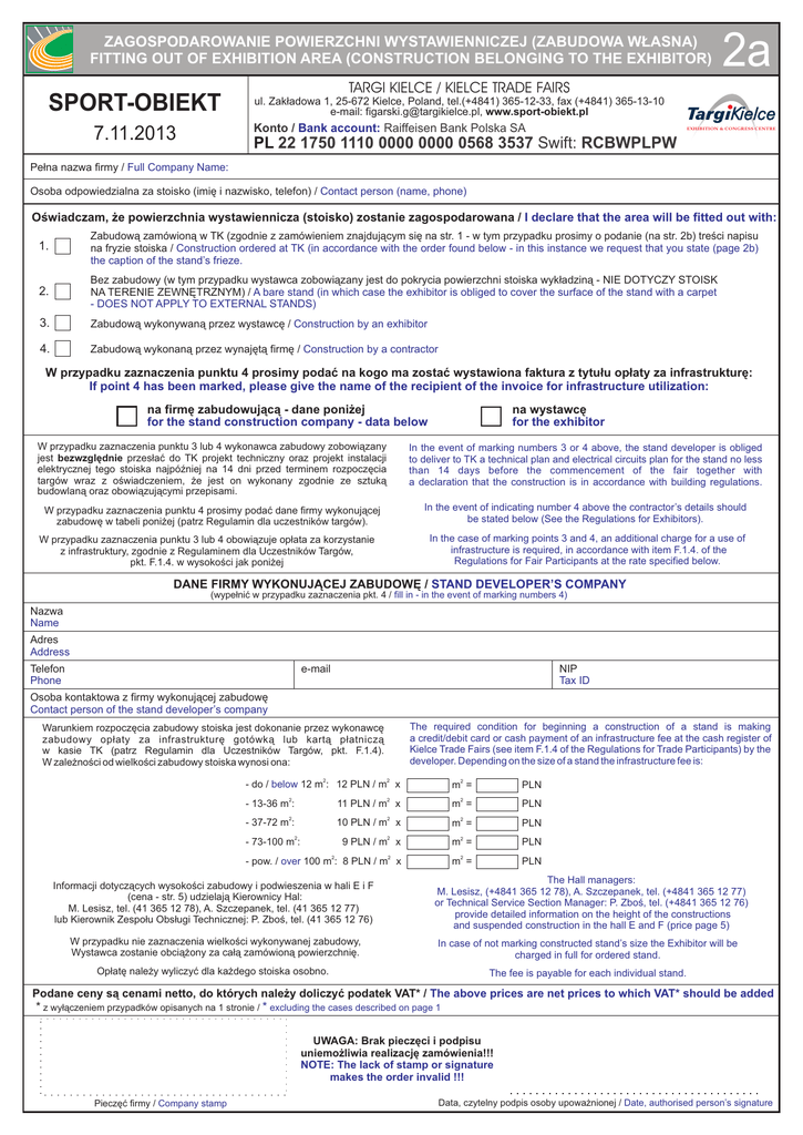 ZAGOSPODAROWANIE POWIERZCHNI WYSTAWIENNICZEJ (ZABUDOWA W£ASNA) FITTING OUT OF EXHIBITION AREA (CONSTRUCTION BELONGING TO THE EXHIBITOR) SPORT-OBIEKT TARGI KIELCE / KIELCE TRADE FAIRS ul. Zak³adowa 1, 25-672 Kielce, Poland, tel.(+4841) 365-12-33, fax (+4841) 365-13-10 e-mail: [email protected], www.sport-obiekt.pl Konto / Bank account: Raiffeisen Bank Polska SA 7.11.2013 2a EXHIBITION & CONGRESS CENTRE PL 22 1750 1110 0000 0000 0568 3537 Swift: RCBWPLPW Pe³na nazwa firmy / Full Company Name: Osoba odpowiedzialna za stoisko (imiê i nazwisko, telefon) / Contact person (name, phone) Oœwiadczam, ¿e powierzchnia wystawiennicza (stoisko) zostanie zagospodarowana / I declare that the area will be fitted out with: 1. Zabudow¹ zamówion¹ w TK (zgodnie z zamówieniem znajduj¹cym siê na str. 1 - w tym przypadku prosimy o podanie (na str. 2b) treœci napisu na fryzie stoiska / Construction ordered at TK (in accordance with the order found below - in this instance we request that you state (page 2b) the caption of the stand’s frieze. 2. Bez zabudowy (w tym przypadku wystawca zobowi¹zany jest do pokrycia powierzchni stoiska wyk³adzin¹ - NIE DOTYCZY STOISK NA TERENIE ZEWNÊTRZNYM) / A bare stand (in which case the exhibitor is obliged to cover the surface of the stand with a carpet - DOES NOT APPLY TO EXTERNAL STANDS) 3. Zabudow¹ wykonywan¹ przez wystawcê / Construction by an exhibitor 4. Zabudow¹ wykonan¹ przez wynajêt¹ firmê / Construction by a contractor W przypadku zaznaczenia punktu 4 prosimy podaæ na kogo ma zostaæ wystawiona faktura z tytu³u op³aty za infrastrukturê: If point 4 has been marked, please give the name of the recipient of the invoice for infrastructure utilization: na firmê zabudowuj¹c¹ - dane poni¿ej for the stand construction company - data below na wystawcê for the exhibitor W przypadku zaznaczenia punktu 3 lub 4 wykonawca zabudowy zobowi¹zany jest bezwzglêdnie przes³aæ do TK projekt techniczny oraz projekt instalacji elektrycznej tego stoiska najpóŸniej na 14 dni przed terminem rozpoczêcia targów wraz z oœwiadczeniem, ¿e jest on wykonany zgodnie ze sztuk¹ budowlan¹ oraz obowi¹zuj¹cymi przepisami. In the event of marking numbers 3 or 4 above, the stand developer is obliged to deliver to TK a technical plan and electrical circuits plan for the stand no less than 14 days before the commencement of the fair together with a declaration that the construction is in accordance with building regulations. W przypadku zaznaczenia punktu 4 prosimy podaæ dane firmy wykonuj¹cej zabudowê w tabeli poni¿ej (patrz Regulamin dla uczestników targów). In the event of indicating number 4 above the contractor’s details should be stated below (See the Regulations for Exhibitors). In the case of marking points 3 and 4, an additional charge for a use of infrastructure is required, in accordance with item F.1.4. of the Regulations for Fair Participants at the rate specified below. W przypadku zaznaczenia punktu 3 lub 4 obowi¹zuje op³ata za korzystanie z infrastruktury, zgodnie z Regulaminem dla Uczestników Targów, pkt. F.1.4. w wysokoœci jak poni¿ej DANE FIRMY WYKONUJ¥CEJ ZABUDOWÊ / STAND DEVELOPER’S COMPANY (wype³niæ w przypadku zaznaczenia pkt. 4 / fill in - in the event of marking numbers 4) Nazwa Name Adres Address e-mail Telefon Phone NIP Tax ID Osoba kontaktowa z firmy wykonuj¹cej zabudowê Contact person of the stand developer’s company The required condition for beginning a construction of a stand is making a credit/debit card or cash payment of an infrastructure fee at the cash register of Kielce Trade Fairs (see item F.1.4 of the Regulations for Trade Participants) by the developer. Depending on the size of a stand the infrastructure fee is: Warunkiem rozpoczêcia zabudowy stoiska jest dokonanie przez wykonawcê zabudowy op³aty za infrastrukturê gotówk¹ lub kart¹ p³atnicz¹ w kasie TK (patrz Regulamin dla Uczestników Targów, pkt. F.1.4). W zale¿noœci od wielkoœci zabudowy stoiska wynosi ona: - do / below 12 m2: 12 PLN / m2 x 2 - 13-36 m : m2 = PLN 2 m2 = PLN 2 2 11 PLN / m x 2 - 37-72 m : 10 PLN / m x m = PLN - 73-100 m2: 9 PLN / m2 x m2 = PLN 2 PLN 2 2 - pow. / over 100 m : 8 PLN / m x Informacji dotycz¹cych wysokoœci zabudowy i podwieszenia w hali E i F (cena - str. 5) udzielaj¹ Kierownicy Hal: M. Lesisz, tel. (41 365 12 78), A. Szczepanek, tel. (41 365 12 77) lub Kierownik Zespo³u Obs³ugi Technicznej: P. Zboœ, tel. (41 365 12 76) m = The Hall managers: M. Lesisz, (+4841 365 12 78), A. Szczepanek, tel. (+4841 365 12 77) or Technical Service Section Manager: P. Zboœ, tel. (+4841 365 12 76) provide detailed information on the height of the constructions and suspended construction in the hall E and F (price page 5) W przypadku nie zaznaczenia wielkoœci wykonywanej zabudowy, Wystawca zostanie obci¹¿ony za ca³¹ zamówion¹ powierzchniê. In case of not marking constructed stand’s size the Exhibitor will be charged in full for ordered stand. Op³atê nale¿y wyliczyæ dla ka¿dego stoiska osobno. The fee is payable for each individual stand. Podane ceny s¹ cenami netto, do których nale¿y doliczyæ podatek VAT* / The above prices are net prices to which VAT* should be added * z wy³¹czeniem przypadków opisanych na 1 stronie / * excluding the cases described on page 1 UWAGA: Brak pieczêci i podpisu uniemo¿liwia realizacjê zamówienia!!! NOTE: The lack of stamp or signature makes the order invalid !!! Pieczêæ firmy / Company stamp Data, czytelny podpis osoby upowa¿nionej / Date, authorised person’s signature