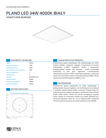 SZCZEGÓŁOWA KARTA PRODUKTU PLANO LED 34W 4000K BIAŁY OŚWIETLENIE BIUROWE PARAMETRY TECHNICZNE CHARAKTERYSTYKA PRODUKTU indeks : 011573 Wszechstronna oprawa oświetleniowa LED charakteryzująca się niskim, Napięcie zasilajace : 230V smukłym profilem i eleganckim wyglądem. Przystosowana do montażu Częstotliwość linii : 50Hz podtynkowego Moc nominalna źródła światła : 34W energooszczędnym panelem LED, wykonana z profilu aluminiowego Klasa energetyczna : A Klasa ochrony : II Wymiary : 595/595/11mm Materiał optyki : PMMA Temperatura barwowa : 4000K Strumień świetlny : 3150lm malowanego w sufitach na kolor modułowych. biały, Oprawa wyposażona z wbudowanym w strukturyzowaną wielowartwową przesłonę PMMA zapewniającą perfekcyjne rozproszenie światła oraz niski stopień olśnienia. Temperatura barwowa 4000K; CRI>80, trwałość paneli LED 50 000 godzin (L70B50) ta= 25ºC. ZASTOSOWANIE Wszechstronna oprawa przeznaczona do użytku wewnętrznego w KRZYWE ŚWIATŁOŚCI PLANO LED 34W 4000K BIAŁY pomieszczeniach biurowych (gabinety, sale konferencyjne) lub użytkowych o charakterze reprezentacyjnym (hotele, restauracje). Unikalny design oraz doskonałe parametry świetlne pozwalają na zastosowanie Plano LED jako główne źródło światła, również przy pracach wymagających skupienia wzroku. Oprawa do zastosowania zarówno przy nowych aplikacjach jak i zamianach tradycyjnych opraw T8 i T5 na energooszczędne rozwiązania LED. Konstrukcja przystosowana do sufitów modułowych typu 600x600. SZCZEGÓŁOWA KARTA PRODUKTU PLANO LED 34W 4000K BIAŁY OŚWIETLENIE BIUROWE TABELA PARAMETRÓW TECHNICZNYCH indeks: 011573 Napięcie zasilajace: 230V Częstotliwość linii: 50Hz Moc nominalna źródła światła: 34W Stopień ochrony IP: IP20 Skuteczność świetlna: 92lm/W Klasa energetyczna: A Klasa ochrony: II Wymiary: 595/595/11mm Waga: 2,25kg Materiał korpusu: Aluminium Materiał optyki: PMMA Temperatura barwowa: 4000K Sposób montażu: Podtynkowy Kolor: Biały Strumień świetlny: 3150lm Kod EAN: 5905963011573 Oznaczenie CE: Tak Materiał klosza: PMMA Rodzaj klosza: Opal Nominalny okres trwałości lampy: 50000h Znamionowa trwałość lampy: 50000h Do zastosowań zewnętrznych: Nie Oddawanie barw: Ra>80 Źródło światła: LED GO! Źródło światła wymienne: Nie Data aktualizacji karty: 2016-07-18 39/2016 www.lenalighting.pl | Strona 2