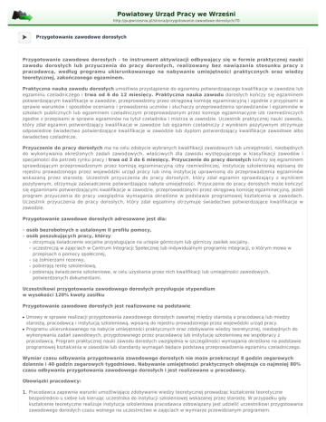 Powiatowy Urząd Pracy we Wrześni http://pupwrzesnia.pl/strona/przygotowanie-zawodowe-doroslych/70 Przygotowanie zawodowe dorosłych Przygotowanie zawodowe dorosłych – to instrument aktywizacji odbywający się w formie praktycznej nauki zawodu dorosłych lub przyuczenia do pracy dorosłych, realizowany bez nawiązania stosunku pracy z pracodawcą, według programu ukierunkowanego na nabywanie umiejętności praktycznych oraz wiedzy teoretycznej, zakończonego egzaminem. Praktyczna nauka zawodu dorosłych umożliwia przystąpienie do egzaminu potwierdzającego kwalifikacje w zawodzie lub egzaminu czeladniczego i trwa od 6 do 12 miesięcy. Praktyczna nauka zawodu dorosłych kończy się egzaminem potwierdzającym kwalifikacje w zawodzie, przeprowadzony przez okręgową komisję egzaminacyjną i zgodnie z przypisami w sprawie warunków i sposobów oceniania i prowadzenia uczniów i słuchaczy przeprowadzenia sprawdzianów i egzaminów w szkołach publicznych lub egzaminem czeladniczym przeprowadzonym przez komisje egzaminacyjne izb rzemieślniczych zgodne z przepisami w sprawie egzaminów na tytuł czeladnika i mistrza w zawodzie. Uczestnik praktycznej nauki zawodu, który zdał egzamin potwierdzający kwalifikacje w zawodzie lub egzamin czeladniczy z wynikiem pozytywnym otrzymuje odpowiednie świadectwo potwierdzające kwalifikacje w zawodzie lub dyplom potwierdzający kwalifikacje zawodowe albo świadectwo czeladnicze. Przyuczenie do pracy dorosłych ma na celu zdobycie wybranych kwalifikacji zawodowych lub umiejętności, niezbędnych do wykonywania określonych zadań zawodowych, właściwych dla zawodu występującego w klasyfikacji zawodów i specjalności dla potrzeb rynku pracy i trwa od 3 do 6 miesięcy. Przyuczenie do pracy dorosłych kończy się egzaminem sprawdzającym przeprowadzonym przez komisję egzaminacyjną izby rzemieślniczej, instytucję szkoleniową wpisaną do rejestru prowadzonego przez wojewódzki urząd pracy lub inną instytucję uprawnioną do przeprowadzenia egzaminów wskazaną przez starostę. Uczestnik przyuczenia do pracy dorosłych, który zdał egzamin sprawdzający z wynikiem pozytywnym, otrzymuje zaświadczenie potwierdzające nabyte umiejętności. Przyuczenie do pracy dorosłych może kończyć się egzaminami potwierdzającymi kwalifikacje w zawodzie, przeprowadzanymi przez okręgową komisję egzaminacyjną, jeżeli program przyuczenia do pracy uwzględnia wymagania określone w podstawie programowej kształcenia w zawodach. Uczestnik przyuczenia do pracy dorosłych, który zdał egzaminy otrzymuje świadectwo potwierdzające kwalifikacje w zawodzie. Przygotowanie zawodowe dorosłych adresowane jest dla: ❍ ❍ osób bezrobotnych o ustalonym II profilu pomocy, osób poszukujących pracy, którzy: otrzymują świadczenie socjalne przysługujące na urlopie górniczym lub górniczy zasiłek socjalny, uczestniczą w zajęciach w Centrum Integracji Społecznej lub indywidualnym programie integracji, o którym mowa w przepisach o pomocy społecznej, są żołnierzami rezerwy, pobierają rentę szkoleniową, pobierają świadczenie szkoleniowe, w celu uzyskania przez nich kwalifikacji lub umiejętności zawodowych, potwierdzonych dokumentami. ❍ ❍ ❍ ❍ ❍ Uczestnikowi przygotowania zawodowego dorosłych przysługuje stypendium w wysokości 120% kwoty zasiłku Przygotowanie zawodowe dorosłych jest realizowane na podstawie ● ● Umowy w sprawie realizacji przygotowania zawodowego dorosłych zawartej między starostą a pracodawcą lub miedzy starostą, pracodawcą i instytucją szkoleniową, wpisaną do rejestru prowadzonego przez wojewódzki urząd pracy. Programu ukierunkowanego na nabycie umiejętności praktycznych oraz zdobywanie wiedzy teoretycznej, niezbędnych do wykonywania zadań zawodowych, przygotowanego przez pracodawcę lub instytucję szkoleniową we współpracy z pracodawcą. Program praktycznej nauki zawodu dorosłych uwzględnia w szczególności wymagania określone na podstawie programowej kształcenia w zawodzie lub standardy wymagań będące podstawą przeprowadzenia egzaminu czeladniczego. Wymiar czasu odbywania przygotowania zawodowego dorosłych nie może przekroczyć 8 godzin zegarowych dziennie i 40 godzin zegarowych tygodniowo. Nabywanie umiejętności praktycznych obejmuje co najmniej 80% czasu odbywania przygotowania zawodowego dorosłych i jest realizowane u pracodawcy. Obowiązki pracodawcy: 1. Pracodawca zapewnia warunki umożliwiające zdobywanie wiedzy teoretycznej prowadząc kształcenie teoretyczne bezpośrednio u siebie lub kierując uczestnika do instytucji szkoleniowej wskazanej przez starostę. W przypadku gdy kształcenie teoretyczne realizuje instytucja szkoleniowa pracodawca zobowiązany jest udzielić uczestnikowi przygotowania zawodowego dorosłych czasu wolnego na uczestnictwo w zajęciach w wymiarze przewidzianym programem. 2. W przypadku gdy pracodawca nie może zapewnić warunków do zrealizowania w pełni programu praktycznej nauki zawodu dorosłych, możliwe jest realizowanie części tego programu przez wskazane przez starostę Centrum Kształcenia Praktycznego lub Centrum Kształcenia Ustawicznego w wymiarze nie przekraczającym 20% programu. 3. Przeprowadza szkolenie w zakresie bezpieczeństwa i higieny pracy, przepisów przeciwpożarowych, na zasadach przewidzianych dla pracowników oraz zapoznaje uczestnika z regulaminem pracy. 4. Przydziela, na zasadach przewidzianych dla pracownika, odzież i obuwie robocze, środki ochrony indywidualnej oraz niezbędne środki higieny osobistej. 5. Zapewnia, na zasadach przewidzianych dla pracowników, bezpłatne posiłki i napoje profilaktyczne. 6. Pracodawca jest obowiązany do udzielenia uczestnikowi przygotowania zawodowego dorosłych dni wolnych w wymiarze 2 dni za każde 30 dni kalendarzowych; za ostatni miesiąc odbywania przygotowania zawodowego dorosłych pracodawca jest obowiązany udzielić dni wolnych przed upływem terminu zakończen