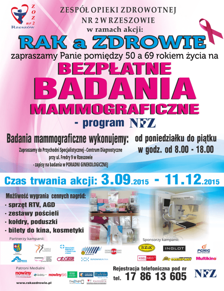 ZESPÓŁ OPIEKI ZDROWOTNEJ NR 2 W RZESZOWIE w ramach akcji: RAK a ZDROWIE zapraszamy Panie pomiędzy 50 a 69 rokiem życia na BEZPŁATNE BADANIA MAMMOGRAFICZNE - program Badania mammograficzne wykonujemy: Zapraszamy do Przychodni Specjalistycznej - Centrum Diagnostyczne przy ul. Fredry 9 w Rzeszowie - zapisy na badania w PORADNI GINEKOLOGICZNEJ Czas trwania akcji: od poniedziałku do piątku w godz. od 8.00 - 18.00 3.09.2015 - 11.12.2015 Możliwość wygrania cennych nagród: • sprzęt RTV, AGD • zestawy pościeli • kołdry, poduszki • bilety do kina, kosmetyki Partnerzy kampanii: Patroni Medialni Sponsorzy kampanii: Rejestracja telefoniczna pod nr tel. www.rakazdrowie.pl 17 86 13 605