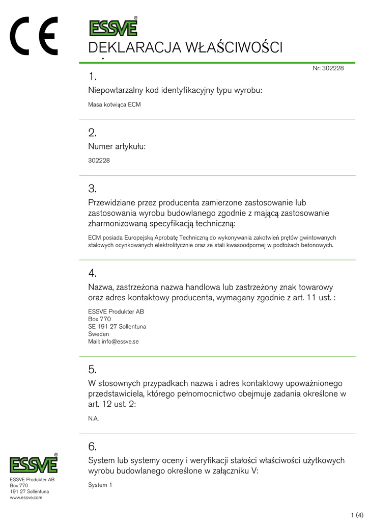 DEKLARACJA WŁAŚCIWOŚCI UŻYTKOWYCH 1. Nr: 302228 Niepowtarzalny kod identyfikacyjny typu wyrobu: Masa kotwiąca ECM 2. Numer artykułu: 302228 3. Przewidziane przez producenta zamierzone zastosowanie lub zastosowania wyrobu budowlanego zgodnie z mającą zastosowanie zharmonizowaną specyfikacją techniczną: ECM posiada Europejską Aprobatę Techniczną do wykonywania zakotwień prętów gwintowanych stalowych ocynkowanych elektrolitycznie oraz ze stali kwasoodpornej w podłożach betonowych. 4. Nazwa, zastrzeżona nazwa handlowa lub zastrzeżony znak towarowy oraz adres kontaktowy producenta, wymagany zgodnie z art. 11 ust. : ESSVE Produkter AB Box 770 SE 191 27 Sollentuna Sweden Mail: [email protected] 5. W stosownych przypadkach nazwa i adres kontaktowy upoważnionego przedstawiciela, którego pełnomocnictwo obejmuje zadania określone w art. 12 ust. 2: N.A. 6. System lub systemy oceny i weryfikacji stałości właściwości użytkowych wyrobu budowlanego określone w załączniku V: ESSVE Produkter AB Box 770 191 27 Sollentuna www.essve.com System 1 1 (4) DEKLARACJA WŁAŚCIWOŚCI UŻYTKOWYCH Nr: 302228 7. W przypadku deklaracji właściwości użytkowych dotyczącej wyrobu budowlanego objętego normą zharmonizowaną: N.A. przeprowadził(-a/-o): w systemie: i wydał(-a/-o): 8. W przypadku deklaracji właściwości użytkowych dotyczącej wyrobu budowlanego, dla którego wydana została europejska ocena techniczna: TZUS s.p. NB 1020 wydał(-a/-o): ETA-12/0252 na podstawie: ETAG 001 Part 1 and part 5, option 7 przeprowadził(-a/-o):i) ustalenia typu wyrobu na podstawie badań typu (w tym pobierania próbek), obliczeń typu, tabelarycznych wartości lub opisowej dokumentacji wyrobu; ii) wstępnej inspekcji zakładu produkcyjnego i zakładowej kontroli produkcji; iii) stałego nadzoru, oceny i ewaluacji zakładowej kontroli produkcji. w systemie: System 1 i wydał(-a/-o): certificate of conformity of the factory production control, test/calculation reports ESSVE Produkter AB Box 770 191 27 Sollentuna www.essve.com 2 (4) DEKLARACJA WŁAŚCIWOŚCI UŻYTKOWYCH Nr: 302228 9. Deklarowane właściwości użytkowe: Zasadnicze charakterystyki Właściwości użytkowe Zharmonizowana specyfikacja techniczna NRk,p,ucr (M8) [kN] 16 ETA-12/0252 NRk,p,ucr (M10) [kN] 35 ETA-12/0252 NRk,p,ucr (M12) [kN] 35 ETA-12/0252 NRk,p,ucr (M16) [kN] 50 ETA-12/0252 NRk,p,ucr (M20) [kN] 75 ETA-12/0252 NRk,p,ucr (M24) [kN] 95 ETA-12/0252 γMc, γMp, γMsp 1.8 ETA-12/0252 hef (M8) [mm] 80 ETA-12/0252 hef (M10) [mm] 90 ETA-12/0252 hef (M12) [mm] 110 ETA-12/0252 hef (M16) [mm] 125 ETA-12/0252 hef (M20) [mm] 170 ETA-12/0252 hef (M24) [mm] 210 ETA-12/0252 scr,Np [mm] 2xhef ETA-12/0252 ccr,Np [mm] hef ETA-12/0252 scr,sp [mm] 3xhef ETA-12/0252 ccr,sp [mm] 1,5xhef ETA-12/0252 ESSVE Produkter AB Box 770 191 27 Sollentuna www.essve.com 3 (4) DEKLARACJA WŁAŚCIWOŚCI UŻYTKOWYCH Nr: 302228 10. Właściwości użytkowe wyrobu określone w pkt 1 i 2 są zgodne z właściwościami użytkowymi deklarowanymi w pkt 9. Niniejsza deklaracja właściwości użytkowych wydana zostaje na wyłączną odpowiedzialność producenta określonego w pkt 4. W imieniu producenta podpisał(-a): Sebastian Athler, Product Developer/Technical expert – Fasteners (nazwisko i stanowisko) Sollentuna 2013-06-28 (miejsce i data wydania) (podpis) ESSVE Produkter AB Box 770 191 27 Sollentuna www.essve.com 4 (4)