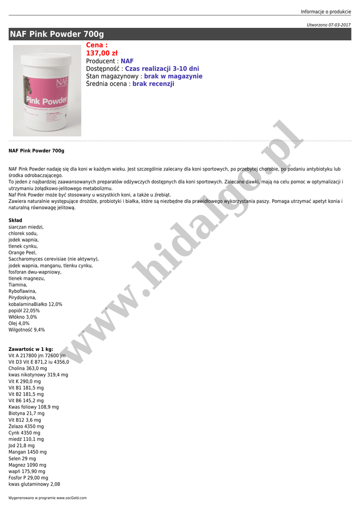Informacje o produkcie Utworzono 07-03-2017 NAF Pink Powder 700g Cena : 137,00 zł l Producent : NAF Dostępność : Czas realizacji 3-10 dni Stan magazynowy : brak w magazynie Średnia ocena : brak recenzji .p NAF Pink Powder 700g w id w .h Skład siarczan miedzi, chlorek sodu, jodek wapnia, tlenek cynku, Orange Peel, Saccharomyces cerevisiae (nie aktywny), jodek wapnia, manganu, tlenku cynku, fosforan dwu-wapniowy, tlenek magnezu, Tiamina, Ryboflawina, Pirydoskyna, kobalaminaBiałko 12,0% popiół 22,05% Włókno 3,0% Olej 4,0% Wilgotność 9,4% al go NAF Pink Powder nadaję się dla koni w każdym wieku. Jest szczególnie zalecany dla koni sportowych, po przebytej chorobie, po podaniu antybiotyku lub środka odrobaczającego. To jeden z najbardziej zaawansowanych preparatów odżywczych dostępnych dla koni sportowych. Zalecane dawki, mają na celu pomoc w optymalizacji i utrzymaniu żołądkowo-jelitowego metabolizmu. Naf Pink Powder może być stosowany u wszystkich koni, a także u źrebiąt. Zawiera naturalnie występujące drożdże, probiotyki i białka, które są niezbędne dla prawidłowego wykorzystania paszy. Pomaga utrzymać apetyt konia i naturalną równowagę jelitową. w Zawartośc w 1 kg: Vit A 217800 jm 72600 jm Vit D3 Vit E 871,2 iu 4356,0 Cholina 363,0 mg kwas nikotynowy 319,4 mg Vit K 290,0 mg Vit B1 181,5 mg Vit B2 181,5 mg Vit B6 145,2 mg Kwas foliowy 108,9 mg Biotyna 21,7 mg Vit B12 3,6 mg Żelazo 4350 mg Cynk 4350 mg miedź 110,1 mg Jod 21,8 mg Mangan 1450 mg Selen 29 mg Magnez 1090 mg wapń 175,90 mg Fosfor P 29,00 mg kwas glutaminowy 2,08 Wygenerowano w programie www.oscGold.com Kwas asparaginowy 1,26% alanina 1,12% L Lizyna 1,02% Izoleucyna 0,7% Glycine Arginina 0,65% Seryna Treonina prolina Fenyloalanina DL DL Metionina 0,17% Tryptofan 0,17% Walina 0,15% Cystyna 0,11% l Dawkowanie Podawać z paszą. Konie sportowe miarka na 3 dni konie niepracujące miarka na 2 dni źrebięta 2 miarki dziennie .p Jeden miarka zawiera = 8g proszku. al go Dostępne opcje NAF Pink Powder 700g w w w .h id » Pojemność: 700 g, 1,4 kg (+85,00 zł), 2,8 kg (+248,00 zł), 10 kg (+918,00 zł).