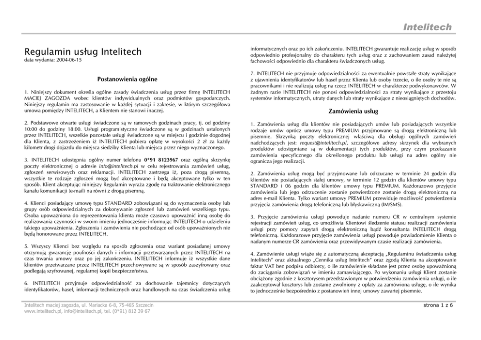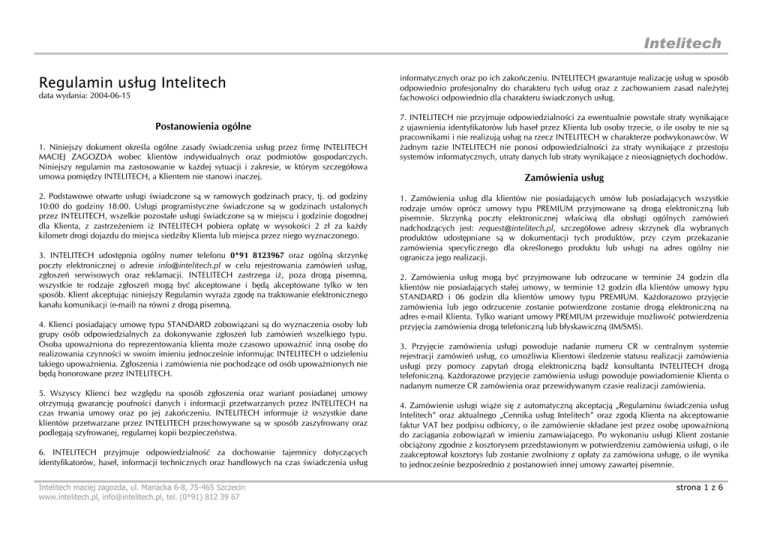 Intelitech Regulamin usług Intelitech data wydania: 2004-06-15 Postanowienia ogólne 1. Niniejszy dokument określa ogólne zasady świadczenia usług przez firmę INTELITECH MACIEJ ZAGOZDA wobec klientów indywidualnych oraz podmiotów gospodarczych. Niniejszy regulamin ma zastosowanie w każdej sytuacji i zakresie, w którym szczegółowa umowa pomiędzy INTELITECH, a Klientem nie stanowi inaczej. 2. Podstawowe otwarte usługi świadczone są w ramowych godzinach pracy, tj. od godziny 10:00 do godziny 18:00. Usługi programistyczne świadczone są w godzinach ustalonych przez INTELITECH, wszelkie pozostałe usługi świadczone są w miejscu i godzinie dogodnej dla Klienta, z zastrzeżeniem iż INTELITECH pobiera opłatę w wysokości 2 zł za każdy kilometr drogi dojazdu do miejsca siedziby Klienta lub miejsca przez niego wyznaczonego. 3. INTELITECH udostępnia ogólny numer telefonu 0*91 8123967 oraz ogólną skrzynkę poczty elektronicznej o adresie [email protected] w celu rejestrowania zamówień usług, zgłoszeń serwisowych oraz reklamacji. INTELITECH zastrzega iż, poza drogą pisemną, wszystkie te rodzaje zgłoszeń mogą być akceptowane i będą akceptowane tylko w ten sposób. Klient akceptując niniejszy Regulamin wyraża zgodę na traktowanie elektronicznego kanału komunikacji (e-mail) na równi z drogą pisemną. 4. Klienci posiadający umowę typu STANDARD zobowiązani są do wyznaczenia osoby lub grupy osób odpowiedzialnych za dokonywanie zgłoszeń lub zamówień wszelkiego typu. Osoba upoważniona do reprezentowania klienta może czasowo upoważnić inną osobę do realizowania czynności w swoim imieniu jednocześnie informując INTELITECH o udzieleniu takiego upoważnienia. Zgłoszenia i zamówienia nie pochodzące od osób upoważnionych nie będą honorowane przez INTELITECH. 5. Wszyscy Klienci bez względu na sposób zgłoszenia oraz wariant posiadanej umowy otrzymują gwarancję poufności danych i informacji przetwarzanych przez INTELITECH na czas trwania umowy oraz po jej zakończeniu. INTELITECH informuje iż wszystkie dane klientów przetwarzane przez INTELITECH przechowywane są w sposób zaszyfrowany oraz podlegają szyfrowanej, regularnej kopii bezpieczeństwa. 6. INTELITECH przyjmuje odpowiedzialność za dochowanie tajemnicy dotyczących identyfikatorów, haseł, informacji technicznych oraz handlowych na czas świadczenia usług Intelitech maciej zagozda, ul. Mariacka 6-8, 75-465 Szczecin www.intelitech.pl, [email protected], tel. (0*91) 812 39 67 informatycznych oraz po ich zakończeniu. INTELITECH gwarantuje realizację usług w sposób odpowiednio profesjonalny do charakteru tych usług oraz z zachowaniem zasad należytej fachowości odpowiednio dla charakteru świadczonych usług. 7. INTELITECH nie przyjmuje odpowiedzialności za ewentualnie powstałe straty wynikające z ujawnienia identyfikatorów lub haseł przez Klienta lub osoby trzecie, o ile osoby te nie są pracownikami i nie realizują usług na rzecz INTELITECH w charakterze podwykonawców. W żadnym razie INTELITECH nie ponosi odpowiedzialności za straty wynikające z przestoju systemów informatycznych, utraty danych lub straty wynikające z nieosiągniętych dochodów. Zamówienia usług 1. Zamówienia usług dla klientów nie posiadających umów lub posiadających wszystkie rodzaje umów oprócz umowy typu PREMIUM przyjmowane są drogą elektroniczną lub pisemnie. Skrzynką poczty elektronicznej właściwą dla obsługi ogólnych zamówień nadchodzących jest: [email protected], szczegółowe adresy skrzynek dla wybranych produktów udostępniane są w dokumentacji tych produktów, przy czym przekazanie zamówienia specyficznego dla określonego produktu lub usługi na adres ogólny nie ogranicza jego realizacji. 2. Zamówienia usług mogą być przyjmowane lub odrzucane w terminie 24 godzin dla klientów nie posiadających stałej umowy, w terminie 12 godzin dla klientów umowy typu STANDARD i 06 godzin dla klientów umowy typu PREMIUM. Każdorazowo przyjęcie zamówienia lub jego odrzucenie zostanie potwierdzone zostanie drogą elektroniczną na adres e-mail Klienta. Tylko wariant umowy PREMIUM przewiduje możliwość potwierdzenia przyjęcia zamówienia drogą telefoniczną lub błyskawiczną (IM/SMS). 3. Przyjęcie zamówienia usługi powoduje nadanie numeru CR w centralnym systemie rejestracji zamówień usług, co umożliwia Klientowi śledzenie statusu realizacji zamówienia usługi przy pomocy zapytań drogą elektroniczną bądź konsultanta INTELITECH drogą telefoniczną. Każdorazowe przyjęcie zamówienia usługi powoduje powiadomienie Klienta o nadanym numerze CR zamówienia oraz przewidywanym czasie realizacji zamówienia. 4. Zamówienie usługi wiąże się z automatyczną akceptacją „Regulaminu świadczenia usług Intelitech” oraz aktualnego „Cennika usług Intelitech” oraz zgodą Klienta na akceptowanie faktur VAT bez podpisu odbiorcy, o ile zamówienie składane jest przez osobę upoważnioną do zaciągania zobowiązań w imieniu zamawiającego. Po wykonaniu usługi Klient zostanie obciążony zgodnie z kosztorysem przedstawionym w potwierdzeniu zamówienia usługi, o ile zaakceptował kosztorys lub zostanie zwolniony z opłaty za zamówiona usługę, o ile wynika to jednocześnie bezpośrednio z postanowień innej umowy zawartej pisemnie. strona 1 z 6 Intelitech 5. Rozpoczęcie wykonywania zamówienia złożonego przez Klienta możliwe jest tylko i wyłącznie w przypadku akceptacji kosztorysu przedstawionego w odpowiedzi INTELITECH na złożone zamówienie, a czas realizacji zamówienia liczony jest od dnia dokonania takiej akceptacji i otrzymania jej przez INTELITECH w formie pisemnej. Ogólne usługi informatyczne 1. W przypadku wszystkich Klientów nie posiadających umowy stałej lub posiadających umowę inną niż umowa typu PREMIUM, usługi serwisowania sprzętu komputerowego świadczone są tylko i wyłącznie w siedzibie INTELITECH je