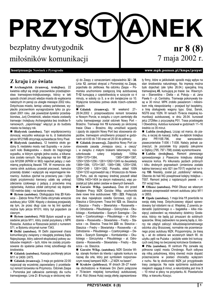 PRZYS T A NEK bezpłatny dwutygodnik miłośników komunikacji miejskiej kontynuacja Nowinek z Pyrogrodu Z kraju i ze świata Archangielsk (tramwaj, trolejbus). 22 kwietnia odbył się strajk pracowników przedsiębiorstwa tramwajowo-trolejbusowego, którzy w taki sposób chcieli zmusić władze miasta do wypłacenia należnych im pensji za ubiegłe miesiące 2002 roku. Dotychczas miasto, łamiąc ustawy państwowe, wypłaciło pracownikom wynagrodzenie tylko za grudzień 2001 roku. Jak powiedział dyrektor przedsiębiorstwa, Jurij Chmielnicki, władze miasta zostawiły tramwaje i trolejbusy Archangielska bez środków finansowych, „zapominając” włączyć je do budżetu miasta na bieżący rok. Białystok (autobus). Tajni współpracownicy donoszą: wszystko wskazuje na to, iż białostockie jelcze M121MB otrzymają wyświetlacze firmy Pixel. Białystok (autobus). 12 kwietnia około godziny 9, niedaleko mostu nad Supraślą – w Jurowcach koło Białegostoku – doszło do tragicznego wypadku, w którym zginęła jedna osoba, a kilkanaście zostało rannych. Na jadącego na linii 102 jelcza M120M (KPKM nr 983) najechał jadący z nadmierną prędkością litewski TIR. W momencie zderzenia silnik autobusu przestał pracować, hamulce przestały działać i wyłączyło się wspomaganie kierownicy. Autobus zjechał na przeciwny pas i tylko dzięki przytomności kierowcy udało się uniknąć zderzenia czołowego z jadącą z przeciwka inną ciężarówką. Autobus zdołał zatrzymać się dopiero 150 metrów dalej – na barierce mostu. Bytom (autobus). Obsługująca linię 23 Katowice – Zabrze firma PUH Delta otrzymała wreszcie autobusy jelcz 120M. Kłopoty z dostawą przejawiały się tym, że przez długi czas na tej linii spotkać można było jelcza M101I, który był pojazdem za ciasnym. Bytom (autobus). PKM Bytom wszedł w posiadanie jelcza M11, który został pozyskany z MPK Rzeszów. Autobus w Rzeszowie jeździł z numerem 571, w Bytomiu otrzymał numer 7343. Delhi (autobus). W Delhi zapanował chaos komunikacyjny związany z nieugiętą postawą Sądu Najwyższego, który zabronił eksploatacji połowy autobusów miejskich – tych, które nie zostały przystosowane do spalania paliwa mniej szkodliwego dla środowiska. Gdańsk (autobus). Kasacje pochłonęły jelcze M11 nr 2408 i 2475. Gdańsk (tramwaj). 3 maja po godzinie 22:00 rozpoczął się wcześniej zapowiadany (i przekładany) remont torowiska na Przymorzu. Odcinek Zaspa – Pomorska jest całkowicie zamknięty dla ruchu tramwajowego. Linie 2 i 8 kursują w skróconej rela- cji do Zaspy z oznaczeniami odpowiednio 32 i 38. Linia 12, zamiast skręcać z Pomorskiej na Zaspę, pojechała do Jelitkowa. Na odcinku Zaspa – Pomorska uruchomiono zastępczą linię autobusową T-12 kursującą z częstotliwością w szczycie co 4 minuty, w soboty co 5, a w dni świąteczne co 10. Wyłącznie torowiska potrwa około trzech–czterech tygodni. Gdańsk (tramwaj). W weekend 27– 28.04.2002 r. przeprowadzono remont torowiska w Nowym Porcie, w związku z czym zamknięty dla ruchu tramwajowego został odcinek Nowy Port – Brzeźno. Tramwaje linii 15 kursowały po skróconej trasie Oliwa – Brzeźno. Aby umożliwić wyjazdy i zjazdy do zajezdni Nowy Port bez stosowania objazdów, tramwajom umożliwiano przejazd w godzinach od 4:00 do 7:00 oraz od 20:30 do północy. Gdańsk (tramwaj). Zajezdnia Nowy Port zastosowała zasadę „mniejsza rzecz, a cieszy” i, w związku z małymi brakami taborowymi, rozczłonkowała cztery trójskłady 105Na 1369+1370+1384, 1385+1386+1387, 1250+1255+1256 i 1261+1262+1249 na dwuskłady 1369+1384, 1370+1387, 1385+1386, 1255+1256, 1250+1249 i 1261+1262. Ponadto, skład 105N 1234+1233 wyprowadził się z Wrzeszcza do Nowego Portu, zaś do naprawy średniej poszedł skład 105Na 1403+1404 (w starym malowaniu), więc pozostał już tylko jeden zestaw w dawnych barwach. Gorzów Wlkp. (autobus). Dwa dni przed Świętem Pracy MZK Gorzów Wlkp. uruchomiło dwie nowe linie autobusowe: 123 i 223. Połączyły one dwa największe osiedla Gorzowa, czyli os. Staszica z Górczynem. Trasa linii 123: os. Staszica – Staszica – Fredry – Słowiańska – Roosevelta – al. Odrodzenia – Piłsudskiego – Górczyńska – Okulickiego – Kombatantów – Szarych Szeregów – Dekerta – Czartoryskiego – Piłsudskiego – al. Odrodzenia – Roosevelta – Słowiańska – Fredry – Staszica – os. Staszica. Trasa linii 223: os. Staszica – Staszica – Fredry – Słowiańska – Roosevelta – al. Odrodzenia – Piłsudskiego – Czartoryskiego – Dekerta – Szarych Szeregów – Kombatantów – Okulickiego – Górczyńska – Piłsudskiego – al. Odrodzenia – Roosevelta – Słowiańska – Fredry – Staszica – os. Staszica. Gorzów Wlkp. (autobus). MZK Gorzów Wlkp. stanęło frontem do klienta i ogłosiło konkurs na nazwę dla orła, który jest symbolem rozpoznawczym nowej kampanii MZK – „Z MZK na basen”. Kraków (jubileusz). W dniach 26–27 kwietnia obchodzono w Krakowie Dni Ziemi połączone z 75-leciem miejskiej komunikacji autobusowej. W al. Róż (Nowa Huta) swoją ofertę zaprezentowa- PRZYSTANEK 8 (8) nr 8 (8) 7 maja 2002 r. www.mpk.poznan.pl/kmps/przyst ły firmy, które w jakikolwiek sposób mają wpływ na stan środowiska naturalnego. Na imprezę można było dojechać (ale tylko 26.04.) specjalną linią tramwajową 45, kursującą po trasie: św. Wawrzyńca – Starowiślna – Dietla – al. Pokoju – al. Jana Pawła II – pl. Centralny. Tramwaje pokonywały trasę w 30 minut. MPK zrobiło pasażerom i miłośnikom miłą niespodziankę – przejazd był bezpłatny, a linię obsługiwały wagony typu: Graz, Sanok, NGT6 oraz 102N. W ramach 75-lecia miejskiej komunikacji autobusowej, w dniu 26.04. kursował jelcz 272Mex z przyczepką P01. Trasa przebiegała I Obwodnicą. Autobus kursował w godzinach 11–16 średnio co 35 minut. Lublin (trolejbus). Licząc od marca