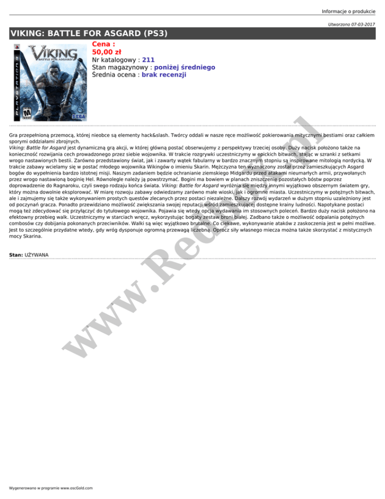 Informacje o produkcie Utworzono 07-03-2017 VIKING: BATTLE FOR ASGARD (PS3) Cena : 50,00 zł Nr katalogowy : 211 Stan magazynowy : poniżej średniego Średnia ocena : brak recenzji ed b oX .p l Gra przepełnioną przemocą, której nieobce są elementy hack&slash. Twórcy oddali w nasze ręce możliwość pokierowania mitycznymi bestiami oraz całkiem sporymi oddziałami zbrojnych. Viking: Battle for Asgard jest dynamiczną grą akcji, w której główną postać obserwujemy z perspektywy trzeciej osoby. Duży nacisk położono także na konieczność rozwijania cech prowadzonego przez siebie wojownika. W trakcie rozgrywki uczestniczymy w epickich bitwach, stając w szranki z setkami wrogo nastawionych bestii. Zarówno przedstawiony świat, jak i zawarty wątek fabularny w bardzo znacznym stopniu są inspirowane mitologią nordycką. W trakcie zabawy wcielamy się w postać młodego wojownika Wikingów o imieniu Skarin. Mężczyzna ten wyznaczony został przez zamieszkujących Asgard bogów do wypełnienia bardzo istotnej misji. Naszym zadaniem będzie ochranianie ziemskiego Midgardu przed atakami nieumarłych armii, przywołanych przez wrogo nastawioną boginię Hel. Równolegle należy ją powstrzymać. Bogini ma bowiem w planach zniszczenie pozostałych bóstw poprzez doprowadzenie do Ragnaroku, czyli swego rodzaju końca świata. Viking: Battle for Asgard wyróżnia się między innymi wyjątkowo obszernym światem gry, który można dowolnie eksplorować. W miarę rozwoju zabawy odwiedzamy zarówno małe wioski, jak i ogromne miasta. Uczestniczymy w potężnych bitwach, ale i zajmujemy się także wykonywaniem prostych questów zlecanych przez postaci niezależne. Dalszy rozwój wydarzeń w dużym stopniu uzależniony jest od poczynań gracza. Ponadto przewidziano możliwość zwiększania swojej reputacji wśród zamieszkującej dostępne krainy ludności. Napotykane postaci mogą też zdecydować się przyłączyć do tytułowego wojownika. Pojawia się wtedy opcja wydawania im stosownych poleceń. Bardzo duży nacisk położono na efektowny przebieg walk. Uczestniczymy w starciach wręcz, wykorzystując bogaty zestaw broni białej. Zadbano także o możliwość odpalania potężnych combosów czy dobijania pokonanych przeciwników. Walki są więc wyjątkowo brutalne. Co ciekawe, wykonywanie ataków z zaskoczenia jest w pełni możliwe. Jest to szczególnie przydatne wtedy, gdy wróg dysponuje ogromną przewagą liczebną. Oprócz siły własnego miecza można także skorzystać z mistycznych mocy Skarina. w w w .R Stan: UŻYWANA Wygenerowano w programie www.oscGold.com