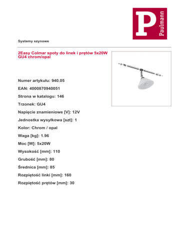 Systemy szynowe 2Easy Colmar spoty do linek i prętów 5x20W GU4 chrom/opal Numer artykułu: 940.05 EAN: 4000870940051 Strona w katalogu: 146 Trzonek: GU4 Napięcie znamieniowe [V]: 12V Jednostka wysyłkowa [szt]: 1 Kolor: Chrom / opal Waga [kg]: 1.96 Moc [W]: 5x20W Wysokość [mm]: 110 Grubość [mm]: 80 Średnica [mm]: 85 Rozpiętość linki [mm]: 160 Rozpiętość prętów [mm]: 30