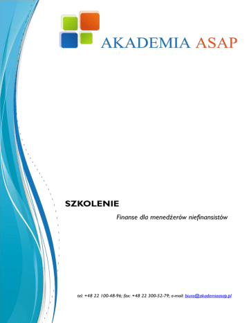 SZKOLENIE Finanse dla menedżerów niefinansistów tel: +48 22 100-48-96; fax: +48 22 300-52-79; e-mail: [email protected] TRENERZY i KONSULTANCI NASZA MISJA DOSTARCZENIE RZETELNEJ INFORMACJI POZWALAJĄCEJ NA ROZWÓJ I PODNIESIENIE POZIOMU DOJRZAŁOŚCI ORGANIZACJI. Stawiamy na kompetencje, jakość i wiarygodność. Mamy doświadczenia praktyczne i aktualną wiedzę. Działamy rzetelnie, szybko i profesjonalnie. DORADCY WIEDZA I UMIEJĘTNOŚCI TO NAJCENNIEJSZY KAPITAŁ KAŻDEJ ORGANIZACJI. to kilkadziesiąt osób z wybitnymi osiągnięciami zarówno w pracy zawodowej (kadra menadżerska, dyrektorzy, osoby zarządzające firmami) jak i przedstawiciele nauki (doktorzy, adiunkci znanych polskich uczelni, szefowie katedr finansów, ekonomii, zarządzania i strategii). W swoich szeregach mamy także osoby znające z własnego doświadczenia instytucje przyznające środki europejskie – one najlepiej wiedzą jak pisać wnioski o dotacje. TRENERZY 2 KONSULTANCI to nasz najbardziej zróżnicowany wiekowo zespół. Mamy analityków, asystentów – ludzi młodych i pełnych energii, całkowicie poświęcających się pracy, która jest ich pasją. Budują oni wciąż swoje kompetencje pod opieką naszych ekspertów czerpiących inspirację z dziesiątek projektów i firm, którym pomagali zrozumieć zachodzące procesy i wdrożyć pożądane zmiany. Cieszymy się także doświadczonym zespołem Kierowników Projektu oraz osób zarządzających Portfelami Projektów – wszyscy mają certyfikaty PRINCE2 lub PMI. największą radość sprawiają nam te chwile, kiedy Klient mówi, że chce nasze szkolenie, ale „koniecznie z tym, wybranym trenerem” – to znacznie więcej niż dobre oceny w ankietach. My z takimi ludźmi właśnie współpracujemy, a osobowości wybitne zatrudniamy na stałe. Atmosfera w Akademii sprzyja wymianie wiedzy, czerpiemy inspiracje z projektów do szkoleń, zaś ze szkoleń przenosimy wiedzę do projektów. To naprawdę działa i nasi Klienci to dostrzegają i z tego korzystają. OFERTA SZKOLENIA PROBLEMY I POTRZEBY ZASPOKAJANE PRZEZ SZKOLENIE Szkolenie omawia problemy z zakresu finansów przedsiębiorstw, a przekazanie tych wiadomości odbywa się w sposób, który zaowocuje zrozumieniem przez uczestników podstawowych zagadnień z zakresu zarządzania finansami przedsiębiorstwa i mechanizmów ich funkcjonowania. Szkolenie zwraca uwagę na wpływ decyzji podejmowanych przez pracowników pionów niefinansowych na wyniki uzyskiwane przez przedsiębiorstwo INFORMACJE PODSTAWOWE Forma treningu: Wykład prowadzony w oparciu o liczne przykłady z praktyki (prezentacja multimedialna). Wymiar czasowy: 2 dni (16 godzin lekcyjnych) Cena za grupę: (dotyczy szkoleń zamkniętych do 10 osób): 5.900* zł Cena za Uczestnika: (dotyczy szkoleń otwartych): 900* zł Cena dotyczy przeprowadzenia szkolenia, zapewnienia materiałów szkoleniowych, certyfikatów dla uczestników oraz cateringu. Nocleg, obiad, parking za dodatkową opłatą. www.akademiaasap.pl 3 PROGRAM TRENINGU Zakres szkolenia Podstawowe pojęcia rachunkowości i finansów Bilans Rachunek Zysków i Strat Szacowanie wolnych przepływów pieniężnych generowanych przez firmę Rachunek z przepływów pieniężnych (cash flow) Amortyzacja Analiza wskaźnikowa przedsiębiorstwa - ocena wiarygodności przedsiębiorstwa 4 Cel działalności przedsiębiorstwa i rola finansów w zarządzaniu, Cele finansowe i niefinansowe, Cele finansowe długo i krótkoterminowe, Kto podlega ustawie o rachunkowości, Badanie i ogłaszanie sprawozdań finansowych, Metody i zasady rachunkowości, Rachunkowość finansowa a rachunkowość podatkowa. Aktywa trwałe i obrotowe, Źródła finansowania – kapitał własny i zobowiązania. Przychody, Koszty, Wynik finansowy. Siedem zasad dobrego szacowania wolnych przepływów pieniężnych, Czego nie wolno brać pod uwagę przy szacowaniu przepływów pieniężnych, Różnica między NCF (przepływy pieniężne netto), OCF (operacyjne przepływy pieniężne) i FCF (wolne przepływy pieniężne), jak je rozróżnić i jak właściwie wybrać. Warunki zastosowania rachunków wielowymiarowych (zarządzanie scentralizowane i zdecentralizowane – zalety i wady oraz wymogi informacyjne), Wydzielanie i ocena działania ośrodków odpowiedzialności (centra kosztowe, centra zysku, centra inwestycyjne, ocena działalności), Budowa i wykorzystanie rachunków wielowymiarowych (koszty stałe indywidualne i wspólne). Pojęcie i cele amortyzacji, Metody amortyzacji, Wpływ stosowania amortyzacji na wyniki finansowe przedsiębiorstwa , Efekt podatkowy amortyzacji, mechanizm korzyści podatkowej. Wskaźniki rentowności, płynności, efektywności, zadłużenia, Analiza metodą Du Ponta, Proste metody oceny wiarygodności kontrahenta. Zakres szkolenia - cd Jak powstaje zysk? Podejmowanie decyzji krótkoterminowych Ocena wartości przedsiębiorstwa Zmiana wartości pieniądza w czasie – elementy matematyki finansowej Rodzaje kosztów w przedsiębiorstwie, Próg rentowności, Pojęcie jednostkowej marży brutto, Wpływ działań podejmowanych w przedsiębiorstwie na wyniki w zależności od struktury kosztów, Analiza opłacalności podejmowanych decyzji na podstawie analizy marży, Wrażliwość przedsiębiorstwa na wahania koniunktury na rynku dźwignia operacyjna, Wrażliwość przedsiębiorstwa na zaciąganie zobowiązań - dźwignia finansowa . Kapitał obrotowy i cykl konwersji gotówki, Pułapka płynności, czyli jak bankrutują przedsiębiorstwa przynoszące zyski? Polityka kredytowania odbiorców – zarządzanie należnościami, Koszt kredytu kupieckiego – zarządzanie zobowiązaniami, Utrzymywanie płynności finansowej, Jakość zarządzania płynnością a wynik finansowy firmy. W jaki sposób przedsiębiorstwo zarabia pieniądze? - Ekonomiczna wartość dodana, Czynniki wpływające na wartość przedsiębiorstwa, Narzędzia zarządzania wartością przedsiębiorstwa, Wartość niematerialna