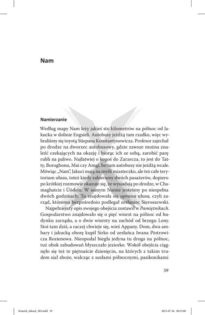Nam Namierzanie Według mapy Nam leży jakieś sto kilometrów na północ od Jakucka w dolinie Engsieli. Autobusy jeżdżą tam rzadko, więc wybraliśmy się toyotą Stiepana Konstantynowicza. Profesor zajechał po drodze na dworzec autobusowy, gdzie zawsze można znaleźć czekających na okazję i biorąc ich ze sobą, zarobić parę rubli na paliwo. Najłatwiej o kogoś do Zarzecza, to jest do Tatty, Boroghonu, Mai czy Amgi, bo tam autobusy nie jeżdżą wcale. Mówiąc „Nam”, Jakuci mają na myśli miasteczko, ale też całe terytorium ułusu, toteż kiedy zabieramy dwóch pasażerów, dopiero po krótkiej rozmowie okazuje się, że wysiadają po drodze, w Chamaghatcie i Üödeju. W samym Namie jesteśmy po n iespełna dwóch godzinach. Tu znajdowała się uprawa ułusu, czyli zarząd, któremu bezpośrednio podlegał zesłaniec Sieroszewski. Najpełniejszy opis swojego obejścia zostawił w Pamiętnikach. Gospodarstwo znajdowało się o pięć wiorst na północ od budynku zarządu, a o dwie wiorsty na zachód od brzegu Leny. Stoi tam dziś, a raczej chwieje się, wieś Appany. Dom, dwa ambary i jakucką oborę kupił Sirko od zesłańca Iwana Piotrowicza Rozienowa. Nieopodal biegła jedyna tu droga na północ, tuż obok zabudowań błyszczało jeziorko. Wokół obejścia ciągnęło się też te piętnaście dziesięcin, na których z takim trudem siał zboże, walcząc z susłami północnymi, pasikonikami 59 Ksiazek_Jakuck_3kS.indd 59 2013-07-26 08:53:08 i Jakutami. Były też ogród, płoty i serge, czyli drewniany słup do wiązania koni. Dom Sirki wyróżniał się, bo w przeciwieństwie do jakuckich siedzib miał spadzisty dach i dwa oszklone okna. O północną ścianę wspierał się skromny balaghan, który pan Wacław nazywał kuchnią. Do kuchni zaś przylegał jeszcze ażurowy okólnik dla bydła. Sirko mieszkał z Marysią, ale miał też gospodynię Okulinę, która żyła w kuchni wraz ze ślepą przyjaciółką Ketris, jej synkiem i kurami. A że ściągnął znad Ałdanu Kornela Bagrynowskiego i często gościł innych zesłańców, zbudował „w kącie podwórza” nowy balaghan. Poza Bagrynowskim przemieszkiwali tam jeszcze Franc Cobel z Łodzi i Leonard Frenkel z Warszawy. Czasem wpadał Feliks Kon, też warszawiak, jeszcze częściej znany w okolicy lekarz Aleksander Sipowicz, wilnianin. Polaków i polskich Żydów było tu tak wielu, że nawet Mania i Okulina zaczynały rozumieć po polsku. – Nikt taki tu nie mieszka – na pytanie o Sieroszewskiego odpowiada spotkany na skraju Appany jeździec. O takim nazwisku nie słyszał też Prokop, który prowadzi kobyłę po inseminacji i ostrzega, że „jeszcze bryka”. Pomóc nie mogą również Siemion, pracujący przy ogacaniu domu, ani sklepowa i bibliotekarka, choć dobrze wiedzą, kim był pan Wacław. Wieś Appany, jak większość wiosek w Jakucji, powstała dopiero po kolektywizacji, czyli w latach trzydziestych. A i to bardziej na papierze niż w przestrzeni. Sacha żyli wówczas tak jak za Bekietowa, w ogromnym rozproszeniu – dwie, trzy jurty na nadrzecznych łąkach kytył bądź jeziornych, okrągłych jak patelnia alaasach. Spotykali się rzadko, na weselach czy dla wypitki, czasem, żeby posłuchać olongcho. Sieroszewski nie miał więc raczej sąsiadów. Rodzina, która mieszkała najbliżej, zmarła na wąglik w 1888 roku, a ich balaghan spalono. W gminie na nasz widok wzruszyli ramionami (wójta nie ma) i odesłali nas do Mikołaja Siemionowicza Gawrilewa, najstarszego mieszkańca Appany. Staruszek Mikołaj Siemionowicz jest chyba z drewna, z kruchych patyków i suchej kory modrzewia. Oczy ma nie swoje, raczej sowy (puszczyk mszarny, Strix nebulosa), a i słowa wypuszcza jak ptaki. Całe stada spłoszonych piskląt, jakieś rzadkie 60 Ksiazek_Jakuck_3kS.indd 60 2013-07-26 08:53:08 gatunki, o których nie ma zdania w żadnych książkach. Nie nadążam za tą ornitologią i proszę go, żeby powtórzył po rosyjsku, a on zapewnia: „Choroszo” i znowu wraca do swoich ptaków. Sirko pisał, że elokwentnego rozmówcę Jakuci nazywali „człowiekiem o skrzydlatych słowach”. Jeśli zatem chcesz się czegokolwiek dowiedzieć o zesłanych tu Polakach, musisz chwytać po kilka naraz i zaglądać przy tym do słownika! Na szczęście w sukurs przychodzi profesor. Pan Mikołaj urodził się w 1921 roku, dwadzieścia dziewięć lat po wyjeździe Sieroszewskiego. Wychowywał się pośród ludzi, którzy znali polskiego zesłańca, ba, pomagali mu zbierać materiały do Dwunastu lat w kraju Jakutów. Rozdziały poświęcone rolnictwu, rodzinie i wierzeniom pełne są wypowiedzi mieszkańców Namu. Staruszek otwiera raz po raz tę najbardziej znaną w Jakucji książkę (obok Dzieł Lenina) i coś tam z niej wydrapuje ptasim pazurem. Jakby to była zdrapka. Obejścia carskich osiedleńców się nie zachowały, ale to pewne, że Sieroszewski tu żył. Nikt nie wie jednak gdzie. Jakuci wymawiali jego nazwisko Czaraczyaskaj. Jeszcze przed wojną, kiedy projektowano kołchoz imienia Karola Marksa i wioskę Appany, staruszek słyszał historię o pochodzeniu nazwy jeziora za wsią: Woda Sieroszewskiego. Ponoć kiedyś przejeżdżał tamtędy prawosławny batiuszka na bani, spadł z konia i utonął. Mieszkający na okolicznych łąkach i w lasach Jakuci myśleli, że to sam Sieroszewski. Stąd się wzięła Czaraczyaskaj uuta, Woda Sieroszewskiego, nazywana też Wodą Rosjanina. Ale czy nad tą wodą stał jego dom? Tego nie wie Mikołaj Siemionowicz. Pamięta natomiast, że nieżyjący już Piotr Siwcew, założyciel muzeum w Namie, wspominał mu, że Polak mieszkał gdzieś od zachodniej strony Kyhył Dieriebine, to jest sąsiedniej wioski. Leży ona jednak tak blisko Appany, że nawet gdyby Sirko mieszkał nad bajorkiem swojego imienia, można by uznać, że to od zachodniej strony Kyhył Dieriebine. Nie zgadza się jednak nasleg, czyli gmina: Woda Sieroszewskiego leży na terenie dawnego nasle