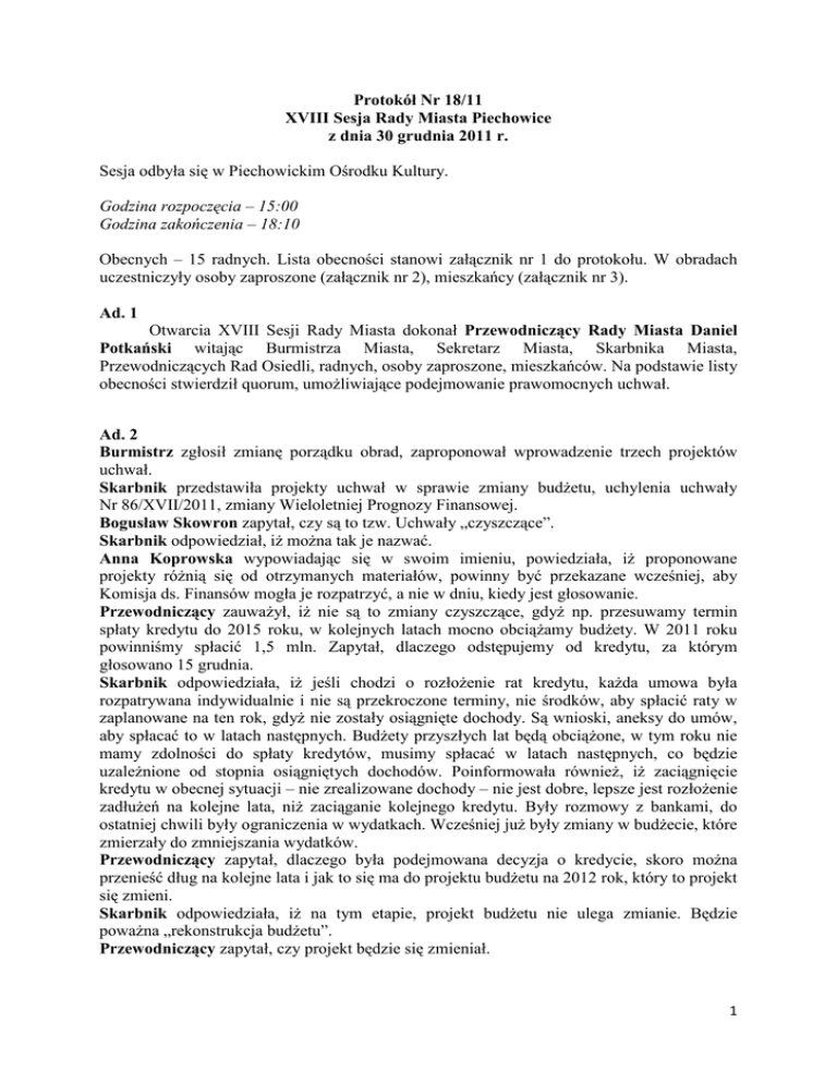 Protokół Nr 18/11 XVIII Sesja Rady Miasta Piechowice z dnia 30 grudnia 2011 r. Sesja odbyła się w Piechowickim Ośrodku Kultury. Godzina rozpoczęcia – 15:00 Godzina zakończenia – 18:10 Obecnych – 15 radnych. Lista obecności stanowi załącznik nr 1 do protokołu. W obradach uczestniczyły osoby zaproszone (załącznik nr 2), mieszkańcy (załącznik nr 3). Ad. 1 Otwarcia XVIII Sesji Rady Miasta dokonał Przewodniczący Rady Miasta Daniel Potkański witając Burmistrza Miasta, Sekretarz Miasta, Skarbnika Miasta, Przewodniczących Rad Osiedli, radnych, osoby zaproszone, mieszkańców. Na podstawie listy obecności stwierdził quorum, umoŜliwiające podejmowanie prawomocnych uchwał. Ad. 2 Burmistrz zgłosił zmianę porządku obrad, zaproponował wprowadzenie trzech projektów uchwał. Skarbnik przedstawiła projekty uchwał w sprawie zmiany budŜetu, uchylenia uchwały Nr 86/XVII/2011, zmiany Wieloletniej Prognozy Finansowej. Bogusław Skowron zapytał, czy są to tzw. Uchwały „czyszczące”. Skarbnik odpowiedział, iŜ moŜna tak je nazwać. Anna Koprowska wypowiadając się w swoim imieniu, powiedziała, iŜ proponowane projekty róŜnią się od otrzymanych materiałów, powinny być przekazane wcześniej, aby Komisja ds. Finansów mogła je rozpatrzyć, a nie w dniu, kiedy jest głosowanie. Przewodniczący zauwaŜył, iŜ nie są to zmiany czyszczące, gdyŜ np. przesuwamy termin spłaty kredytu do 2015 roku, w kolejnych latach mocno obciąŜamy budŜety. W 2011 roku powinniśmy spłacić 1,5 mln. Zapytał, dlaczego odstępujemy od kredytu, za którym głosowano 15 grudnia. Skarbnik odpowiedziała, iŜ jeśli chodzi o rozłoŜenie rat kredytu, kaŜda umowa była rozpatrywana indywidualnie i nie są przekroczone terminy, nie środków, aby spłacić raty w zaplanowane na ten rok, gdyŜ nie zostały osiągnięte dochody. Są wnioski, aneksy do umów, aby spłacać to w latach następnych. BudŜety przyszłych lat będą obciąŜone, w tym roku nie mamy zdolności do spłaty kredytów, musimy spłacać w latach następnych, co będzie uzaleŜnione od stopnia osiągniętych dochodów. Poinformowała równieŜ, iŜ zaciągnięcie kredytu w obecnej sytuacji – nie zrealizowane dochody – nie jest dobre, lepsze jest rozłoŜenie zadłuŜeń na kolejne lata, niŜ zaciąganie kolejnego kredytu. Były rozmowy z bankami, do ostatniej chwili były ograniczenia w wydatkach. Wcześniej juŜ były zmiany w budŜecie, które zmierzały do zmniejszania wydatków. Przewodniczący zapytał, dlaczego była podejmowana decyzja o kredycie, skoro moŜna przenieść dług na kolejne lata i jak to się ma do projektu budŜetu na 2012 rok, który to projekt się zmieni. Skarbnik odpowiedziała, iŜ na tym etapie, projekt budŜetu nie ulega zmianie. Będzie powaŜna „rekonstrukcja budŜetu”. Przewodniczący zapytał, czy projekt będzie się zmieniał. 1 Skarbnik w tej chwili nie będzie zmian. Do projektu uwagi wniesie Regionalna Izba Obrachunkowa i dalej będą prowadzone prace, gdyŜ do projektu moŜna wnosić zmiany, które na pewno się pojawią. Przewodniczący zapytał, dlaczego zrezygnujemy z kredytu. Skarbnik powiedziała, iŜ w tej chwili kredyt nie uratowałby nas, a jeszcze bardziej powiększyłby zadłuŜenie. Przewodniczący zapytał, dlaczego nie było takiej informacji 15 grudnia. Skarbnik odpowiedziała, iŜ zostały ograniczone jeszcze wydatki, niŜ było to na dzień 15 grudnia. Przewodniczący zapytał, czy o 300 tysięcy, z kredytu jest 700, pozostaje jeszcze 500 tys. Anna Koprowska zapytała, czy kredyt jest spłacony, czy nie. Skarbnik odpowiedziała, iŜ kredyt nie jest spłacony, jest rozłoŜony na następne lata. Anna Koprowska powiedziała, iŜ w projekcie budŜetu na 2012 rok są juŜ złe dane, projekt jest nieaktualny. Skarbnik odpowiedziała, iŜ dane były aktualne na moment składania projektu. Anna Koprowska powiedziała, iŜ dzisiaj jest juŜ świadomość, Ŝe są złe dane i jak mają się ustosunkować Komisje do projektu, który jest nie aktualny, następnie Komisja ds. Finansów ma wydać opinię, jak to rozwiązać technicznie. Marcin Słomski (radca prawny) odpowiedział, Ŝe projekt został złoŜony do RIO, naleŜy poczekać na opinię, a do tego czasu pracować nad obecnym projektem. Następnie po opinii RIO nanieść poprawki. Powiedział, Ŝe do czasu kiedy będzie podjęta uchwała, poprawki będą naniesione, na bieŜąco aktualizować dane i uchwałę przyjąć w wersji, która będzie odpowiadała rzeczywistości. Anna Koprowska zapytała, czy RIO wyda drugą opinię. Skarbnik odpowiedziała, iŜ nie składa się drugiego projektu, autopoprawki się składa dopiero po otrzymaniu opinii. Przewodniczący zapytał, jak jest faktycznie, poniewaŜ na BIP-ie jest napisane, Ŝe nie wpłynęła Ŝadna oferta, kredyt chcieliśmy, ale nie dostaliśmy. Przesuwamy spłatę zadłuŜenie na kolejne lata, obciąŜając następne budŜety. Burmistrz powiedział, Ŝe nie ma środków, którymi moŜna by spłacić zaciągnięty kredyt, więc spłata jest przesunięta na lata następne, jeślibyśmy uzyskali kredyt, to równieŜ spłacalibyśmy go w latach następnych. Skarbnik powiedziała, przetarg „wisi” na BIP-ie przez kilka dni, jeśli jest zainteresowanie ze strony banków – są telefony, dodatkowe pytania. JeŜeli nie ma zainteresowania, to podejmuje się inne działania, aby nie okazało się, Ŝe jesteśmy bez wyjścia. Stąd dodatkowe analizy, rozkładanie na raty, gdyby były pieniądze, to byśmy spłacili i nie byłoby problemu. Kolejny kredyt – dalsze dodłuŜanie Gminy. Irena Chromik powiedziała, iŜ na logikę, nie zadłuŜamy bardziej, gdyŜ nie wzięliśmy dodatkowego kredytu, sam dług jest pomniejszony, wzrosną koszty obsługi długu. Skarbnik odpowiedziała, iŜ wysokość kredytu nie uległa zmianie, jest tak jak na początku roku. Zmiany wynikają z tego, Ŝe nie mamy wykonania dochodu, który wynika z sytuacji finansowo 
