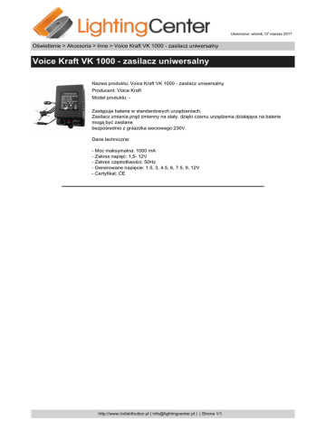 Utworzono: wtorek, 07 marzec 2017 Oświetlenie > Akcesoria > Inne > Voice Kraft VK 1000 - zasilacz uniwersalny Voice Kraft VK 1000 - zasilacz uniwersalny Nazwa produktu: Voice Kraft VK 1000 - zasilacz uniwersalny Producent: Voice Kraft Model produktu: Zastępuje baterie w standardowych urządzeniach. Zasilacz zmienia prąd zmienny na stały, dzięki czemu urządzenia działające na baterie mogą być zasilane bezpośrednio z gniazdka sieciowego 230V. Dane techniczne: - Moc maksymalna: 1000 mA - Zakrss napięć: 1,5- 12V - Zakres częstotliwości: 50Hz - Generowane napięcie: 1.5, 3, 4.5, 6, 7.5, 9, 12V - Certyfikat: CE http://www.lcdistribution.pl | [email protected] | | Strona 1/1