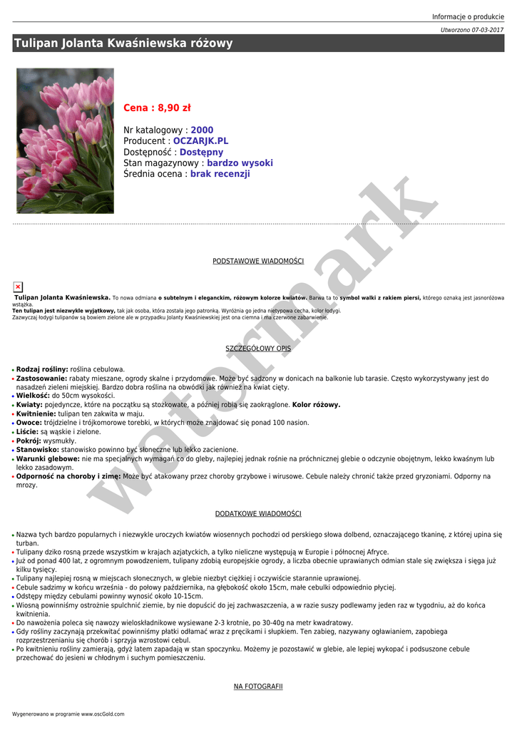 Informacje o produkcie Utworzono 07-03-2017 Tulipan Jolanta Kwaśniewska różowy Cena : 8,90 zł er m ar k Nr katalogowy : 2000 Producent : OCZARJK.PL Dostępność : Dostępny Stan magazynowy : bardzo wysoki Średnia ocena : brak recenzji PODSTAWOWE WIADOMOŚCI Tulipan Jolanta Kwaśniewska. To nowa odmiana o subtelnym i eleganckim, różowym kolorze kwiatów. Barwa ta to symbol walki z rakiem piersi, którego oznaką jest jasnoróżowa wstążka. Ten tulipan jest niezwykle wyjątkowy, tak jak osoba, która została jego patronką. Wyróżnia go jedna nietypowa cecha, kolor łodygi. Zazwyczaj łodygi tulipanów są bowiem zielone ale w przypadku Jolanty Kwaśniewskiej jest ona ciemna i ma czerwone zabarwienie. SZCZEGÓŁOWY OPIS ● ● ● ● ● ● ● ● ● w ● Rodzaj rośliny: roślina cebulowa. Zastosowanie: rabaty mieszane, ogrody skalne i przydomowe. Może być sadzony w donicach na balkonie lub tarasie. Często wykorzystywany jest do nasadzeń zieleni miejskiej. Bardzo dobra roślina na obwódki jak również na kwiat cięty. Wielkość: do 50cm wysokości. Kwiaty: pojedyncze, które na początku są stożkowate, a później robią się zaokrąglone. Kolor różowy. Kwitnienie: tulipan ten zakwita w maju. Owoce: trójdzielne i trójkomorowe torebki, w których może znajdować się ponad 100 nasion. Liście: są wąskie i zielone. Pokrój: wysmukły. Stanowisko: stanowisko powinno być słoneczne lub lekko zacienione. Warunki glebowe: nie ma specjalnych wymagań co do gleby, najlepiej jednak rośnie na próchnicznej glebie o odczynie obojętnym, lekko kwaśnym lub lekko zasadowym. Odporność na choroby i zimę: Może być atakowany przez choroby grzybowe i wirusowe. Cebule należy chronić także przed gryzoniami. Odporny na mrozy. at ● ● ● ● ● ● ● ● ● ● ● DODATKOWE WIADOMOŚCI Nazwa tych bardzo popularnych i niezwykle uroczych kwiatów wiosennych pochodzi od perskiego słowa dolbend, oznaczającego tkaninę, z której upina się turban. Tulipany dziko rosną przede wszystkim w krajach azjatyckich, a tylko nieliczne występują w Europie i północnej Afryce. Już od ponad 400 lat, z ogromnym powodzeniem, tulipany zdobią europejskie ogrody, a liczba obecnie uprawianych odmian stale się zwiększa i sięga już kilku tysięcy. Tulipany najlepiej rosną w miejscach słonecznych, w glebie niezbyt ciężkiej i oczywiście starannie uprawionej. Cebule sadzimy w końcu września - do połowy października, na głębokość około 15cm, małe cebulki odpowiednio płyciej. Odstępy między cebulami powinny wynosić około 10-15cm. Wiosną powinniśmy ostrożnie spulchnić ziemie, by nie dopuścić do jej zachwaszczenia, a w razie suszy podlewamy jeden raz w tygodniu, aż do końca kwitnienia. Do nawożenia poleca się nawozy wieloskładnikowe wysiewane 2-3 krotnie, po 30-40g na metr kwadratowy. Gdy rośliny zaczynają przekwitać powinniśmy płatki odłamać wraz z pręcikami i słupkiem. Ten zabieg, nazywany ogławianiem, zapobiega rozprzestrzenianiu się chorób i sprzyja wzrostowi cebul. Po kwitnieniu rośliny zamierają, gdyż latem zapadają w stan spoczynku. Możemy je pozostawić w glebie, ale lepiej wykopać i podsuszone cebule przechować do jesieni w chłodnym i suchym pomieszczeniu. NA FOTOGRAFII Wygenerowano w programie www.oscGold.com Tulipan Jolanta Kwaśniewska er m ar k Tulipa Triumph DLACZEGO WARTO KUPIĆ ROŚLINY U NAS ● ● ● ● Wszystkie cebule i kłącza staramy się dostarczać w bardzo dobrym stanie, zdrowe i zadbane. Dokładamy wszelkich starań, aby wygląd materiału sadzeniowego spełniał Państwa oczekiwania. Poza tym na większości stron naszych ofert na ostatnim zdjęciu poniżej przedstawiamy wygląd przykładowych rzeczywistych cebul oraz kłączy, aby każdy mógł zobaczyć co kupuje. W okresie zimowym, wczesnowiosennym lub późnojesiennym możliwe są braki poszczególnych gatunków, co naturalnie związane jest z sezonem wegetacyjnym roślin. Cebule, kłącza w ilościach jednostkowych przeważnie wysyłane są w kopertach bąbelkowych lub pudełkach kartonowych jako listy dla zminimalizowania kosztu wysyłki. W większych ilościach wysłane są jako paczki. Cebule tulipanów sprzedawane są po 1 szt. w at KONIECZNIE ZOBACZ