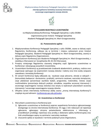 Międzynarodowa Konferencja Pedagogiki Specjalnej z cyklu OSOBA Interdyscyplinarne konteksty wczesnej interwencji, wczesnego wspomagania rozwoju dziecka REGULAMIN REJESTRACJI UCZESTNIKÓW na Międzynarodową Konferencję Pedagogiki Specjalnej z cyklu OSOBA organizowaną przez Instytut Pedagogii Specjalnej Akademii Pedagogiki Specjalnej im. Marii Grzegorzewskiej §1. Postanowienia ogólne 1. Międzynarodowa Konferencja Pedagogiki Specjalnej z cyklu OSOBA, zwana w dalszej części Regulaminu Konferencją, odbywa się w terminie i miejscu wskazanym przez Instytut Pedagogiki Specjalnej Akademii Pedagogiki Specjalnej im. Marii Grzegorzewskiej, zwanej w dalszej części Regulaminu Organizatorem. 2. Organizatorem Konferencji jest Akademia Pedagogiki Specjalnej im. Marii Grzegorzewskiej, z siedzibą w Warszawie (ul. Szczęśliwicka 40, 02-353 Warszawa). 3. Przepisy niniejszego Regulaminu stanowią integralną część Zgłoszenia uczestnictwa w Konferencji i obowiązują wszystkich Uczestników. 4. Uczestnikami Konferencji są przedstawiciele środowisk akademickich, praktycy, rodzice oraz organizacje zajmujące się wspieraniem rozwoju dziecka i rodziny oraz inne osoby związane zawodowo z tematyką Konferencji. 5. W ramach Konferencji będą odbywały się naukowe sesje plenarne, obrady w sekcjach – (komunikaty badawcze i doniesienia z praktyki), seminaria naukowe, warsztaty tematyczne, sesje plakatowe (prezentacje wyników badań, programów, materiałów, metod, sesje) multimedialne (prezentacja dobrych praktyk, ośrodków, zespołów wczesnej interwencji / wczesnego wspomagania rozwoju dziecka) oraz wizyty w wybranych placówkach wczesnej interwencji / wczesnego wspomagania rozwoju dziecka 6. Oficjalna serwis internetowy Konferencji (dalej zwana „stroną internetową Konferencji”) znajduje się pod adresem: konferencje.aps.edu.pl/osoba. §2. Uczestnictwo w Konferencji 1. Warunkami uczestnictwa w Konferencji jest: 1) Zgłoszenie uczestnictwa w Konferencji poprzez wypełnienie formularza zgłoszeniowego dostępnego na stronie internetowej Konferencji. W ciągu 2 dni roboczych od rejestracji zgłoszenia, zgłaszający otrzyma potwierdzenie elektroniczne z informacją o prawidłowym przebiegu rejestracji oraz prośbą o dokonane opłaty konferencyjnej oraz linki umożliwiające zapisy na seminaria i warsztaty naukowe. 2) Uiszczenie opłaty w wysokości i terminie podanych przez Organizatora. Osobowość – Samorealizacja – Odpowiedzialność – Bezpieczeństwo - Autonomia- FENOMEN NIEPEŁNOSPRAWNOŚCI Międzynarodowa Konferencja Pedagogiki Specjalnej z cyklu OSOBA Interdyscyplinarne konteksty wczesnej interwencji, wczesnego wspomagania rozwoju dziecka 2. Opłatę za udział w Konferencji należy przesłać zgodnie z informacjami na konto wskazane przez Organizatora w informacji zwrotnej potwierdzającej prawidłowy przebieg rejestracji przesłanej przez Organizatora na adres elektroniczny podany w zgłoszeniu. Informacje o opłatach znajdują się na stronie internetowej Konferencji. 3. Organizator wystawi fakturę VAT po dokonaniu wpłaty. 4. Prelegentem, który wygłasza prezentacje na dany temat, jest osoba, która uczestniczy we wskazanych formach konferencji z własną prezentacją, zgłosiła swoje uczestnictwo za pośrednictwem strony internetowej Konferencji oraz dokona stosownej opłaty za udział w Konferencji. 5. Słuchaczem jest osoba, która uczestniczy we wskazanych formach konferencji bez własnej prezentacji oraz w terminie wskazanym przez Organizatora zgłosiła swoje uczestnictwo za pośrednictwem serwisu konferencyjnego konferencje.aps.edu.pl/osoba oraz dokona stosownej opłaty za udział w Konferencji. 6. Każdy Uczestnik otrzyma certyfikat uczestnictwa w Konferencji. 7. Zamiast zgłoszonej osoby w Konferencji może wziąć udział inny pracownik instytucji (należy o tym fakcie poinformować organizatora Konferencji). 8. Koszt udziału w Konferencji, pobytu i przejazdu Uczestnik pokrywa we własnym zakresie. 9. Termin nadsyłania zgłoszenia uczestnictwa w Konferencji upływa w dniu wskazanym przez Organizatora na stronie internetowej Konferencji. §3. Rezygnacja z udziału w Konferencji 1. Uczestnik może zrezygnować z uczestnictwa w Konferencji. Rezygnacja Uczestnika z udziału w Konferencji powinna być dokonana w formie pisemnej. 2. W przypadku rezygnacji Uczestnika z udziału w Konferencji: 1) gdy Organizator otrzyma od Uczestnika oświadczenie o rezygnacji do 30. dnia przed rozpoczęciem Konferencji, Organizator zwróci Uczestnikowi wpłaconą kwotę, zatrzymując odstępne w wysokości 25% wartości całości opłaty, pod warunkiem wcześniejszego otrzymania wpłaty za udział; 2) gdy Organizator otrzyma od Uczestnika oświadczenie o rezygnacji pomiędzy 29. a 15. dniem przed rozpoczęciem Konferencji, Organizator ma prawo zatrzymać odstępne w wysokości 50% wartości całości opłaty, pod warunkiem wcześniejszego otrzymania wpłaty za udział; 3) gdy Organizator otrzyma od Uczestnika oświadczenie o rezygnacji w 14. dniu przed rozpoczęciem Konferencji lub później, Organizator ma prawo zatrzymać całą otrzymaną wpłatę. §4. Opłaty 1. Opłaty za uczestnictwo w Konferencji są zamieszczone na stronie internetowej Konferencji. Opłatę konferencyjną należy wnieść na rachunek bankowy: Akademia Pedagogiki Specjalnej im. Marii Grzegorzewskiej Osobowość – Samorealizacja – Odpowiedzialność – Bezpieczeństwo - Autonomia- FENOMEN NIEPEŁNOSPRAWNOŚCI Międzynarodowa Konferencja Pedagogiki Specjalnej z cyklu OSOBA Interdyscyplinarne konteksty wczesnej interwencji, wczesnego wspomagania rozwoju dziecka ul. Szczęśliwicka 40, 02-353 Warszawa nr konta: 03 1060 0076 0000 3210 0017 5993 tytułem: Konferencja- OSOBA + Imię i Nazwisko, adres e-mail (uczestnika lub płatnika) 2. Płatnikiem (adresatem faktury) jest podmiot zamawiający poszczególne usługi związane z uczestnictwem w Konferencji. 3. Dokonanie opłaty konferencyjnej uprawnia do r