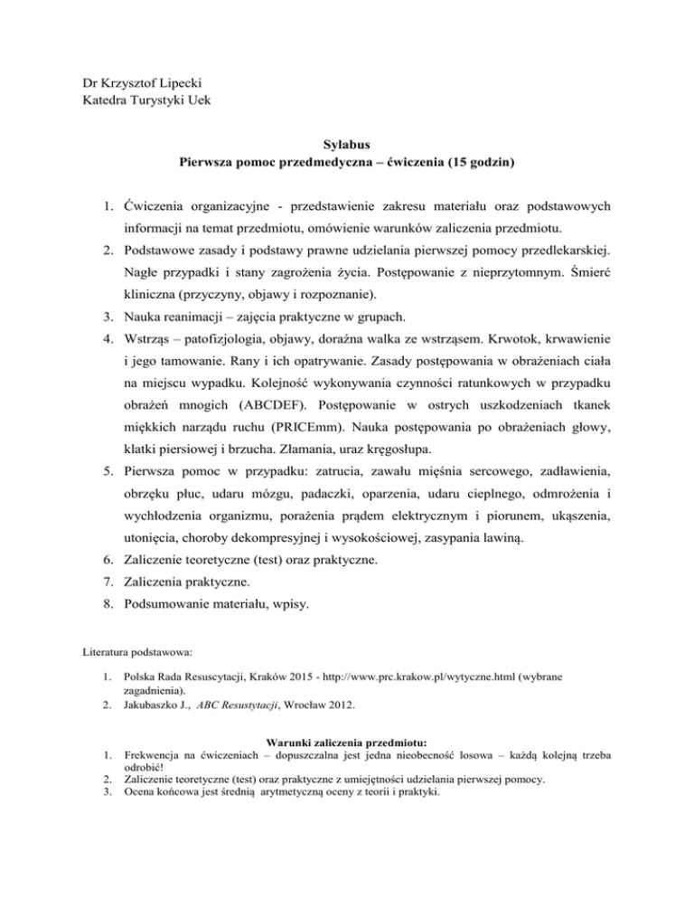 Dr Krzysztof Lipecki Katedra Turystyki Uek Sylabus Pierwsza pomoc przedmedyczna – ćwiczenia (15 godzin) 1. Ćwiczenia organizacyjne - przedstawienie zakresu materiału oraz podstawowych informacji na temat przedmiotu, omówienie warunków zaliczenia przedmiotu. 2. Podstawowe zasady i podstawy prawne udzielania pierwszej pomocy przedlekarskiej. Nagłe przypadki i stany zagrożenia życia. Postępowanie z nieprzytomnym. Śmierć kliniczna (przyczyny, objawy i rozpoznanie). 3. Nauka reanimacji – zajęcia praktyczne w grupach. 4. Wstrząs – patofizjologia, objawy, doraźna walka ze wstrząsem. Krwotok, krwawienie i jego tamowanie. Rany i ich opatrywanie. Zasady postępowania w obrażeniach ciała na miejscu wypadku. Kolejność wykonywania czynności ratunkowych w przypadku obrażeń mnogich (ABCDEF). Postępowanie w ostrych uszkodzeniach tkanek miękkich narządu ruchu (PRICEmm). Nauka postępowania po obrażeniach głowy, klatki piersiowej i brzucha. Złamania, uraz kręgosłupa. 5. Pierwsza pomoc w przypadku: zatrucia, zawału mięśnia sercowego, zadławienia, obrzęku płuc, udaru mózgu, padaczki, oparzenia, udaru cieplnego, odmrożenia i wychłodzenia organizmu, porażenia prądem elektrycznym i piorunem, ukąszenia, utonięcia, choroby dekompresyjnej i wysokościowej, zasypania lawiną. 6. Zaliczenie teoretyczne (test) oraz praktyczne. 7. Zaliczenia praktyczne. 8. Podsumowanie materiału, wpisy. Literatura podstawowa: 1. 2. 1. 2. 3. Polska Rada Resuscytacji, Kraków 2015 - http://www.prc.krakow.pl/wytyczne.html (wybrane zagadnienia). Jakubaszko J., ABC Resustytacji, Wrocław 2012. Warunki zaliczenia przedmiotu: Frekwencja na ćwiczeniach – dopuszczalna jest jedna nieobecność losowa – każdą kolejną trzeba odrobić! Zaliczenie teoretyczne (test) oraz praktyczne z umiejętności udzielania pierwszej pomocy. Ocena końcowa jest średnią arytmetyczną oceny z teorii i praktyki.