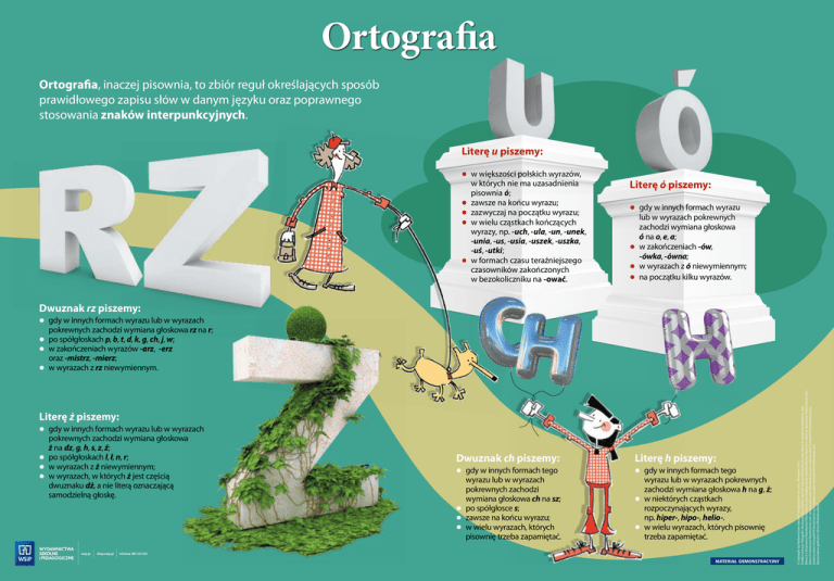Ortografia Ortografia, inaczej pisownia, to zbiór reguł określających sposób prawidłowego zapisu słów w danym języku oraz poprawnego stosowania znaków interpunkcyjnych. Literę u piszemy: ● w większości polskich wyrazów, w których nie ma uzasadnienia pisownia ó; ● zawsze na końcu wyrazu; ● zazwyczaj na początku wyrazu; ● w wielu cząstkach kończących wyrazy, np. -uch, -ula, -un, -unek, -unia, -us, -usia, -uszek, -uszka, -uś, -utki; ● w formach czasu teraźniejszego czasowników zakończonych w bezokoliczniku na -ować. Literę ó piszemy: ● gdy w innych formach wyrazu lub w wyrazach pokrewnych zachodzi wymiana głoskowa ó na o, e, a; ● w zakończeniach -ów, -ówka, -ówna; ● w wyrazach z ó niewymiennym; ● na początku kilku wyrazów. Dwuznak rz piszemy: Literę ż piszemy: ● gdy w innych formach wyrazu lub w wyrazach pokrewnych zachodzi wymiana głoskowa ż na dz, g, h, s, z, ź; ● po spółgłoskach l, ł, n, r; ● w wyrazach z ż niewymiennym; ● w wyrazach, w których ż jest częścią dwuznaku dż, a nie literą oznaczającą samodzielną głoskę. Dwuznak ch piszemy: Literę h piszemy: ● gdy w innych formach tego wyrazu lub w wyrazach pokrewnych zachodzi wymiana głoskowa ch na sz; ● po spółgłosce s; ● zawsze na końcu wyrazu; ● w wielu wyrazach, których pisownię trzeba zapamiętać. ● gdy w innych formach tego wyrazu lub w wyrazach pokrewnych zachodzi wymiana głoskowa h na g, ż; ● w niektórych cząstkach rozpoczynających wyrazy, np. hiper-, hipo-, helio-. ● w wielu wyrazach, których pisownię trzeba zapamiętać. MATERIAŁ DEMONSTRACYJNY © Copyright by Wydawnictwa Szkolne i Pedagogiczne sp. z o.o., Warszawa 2015 Źródła ilustracji i fotografii: (ilustracje) Ewa Olejnik, (litera R) martan/Shutterstock.com, (litera Z) martan/Shutterstock. com, (litera Z z bluszczem) Masekesam/Shutterstock.com, (kropka) Jacek Fulawka/Shutterstock.com, (litera U) Sylverarts/ Shutterstock. com, (litera Ó) Sylverarts/Shutterstock.com, (postument) avian/Shutterstock.com, (srebrny balon C) koya979/Shutterstock.com, (srebrny balon H) koya979/Shutterstock.com, (kolorowy balon H) koya979/Shutterstock.com Opracowanie graficzne: Hanna Michalska-Baran ● gdy w innych formach wyrazu lub w wyrazach pokrewnych zachodzi wymiana głoskowa rz na r; ● po spółgłoskach p, b, t, d, k, g, ch, j, w; ● w zakończeniach wyrazów -arz, -erz oraz -mistrz, -mierz; ● w wyrazach z rz niewymiennym.