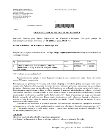 Komornik Sądowy (dawniej Rew.I) przy Sądzie Rejonowym we Włocławku Grzegorz Perczyński Kancelaria Komornicza we Włocławku 87-800 Włocławek P.O.W. 21 A tel. 54-231-29-10, fax 54-232-03-32 www.komornikwloclawek.pl GP Km 296/15 Włocławek, dnia 27-05-2015 #AM *0020001141002*/0419/ *0020001141002* i inne OBWIESZCZENIE O LICYTACJI RUCHOMOŚCI Komornik Sądowy przy Sądzie Rejonowym we Włocławku Grzegorz Perczyński podaje do publicznej wiadomości, że w dniu 24-06-2015r. o godz. 10:00 w : 87-800 Włocławek, Al. Kazimierza Wielkiego 6 B odbędzie się w trybie ustalonym w art. 867 kpc druga licytacja ruchomości należących do dłużnika i składających się z: Lp. Nazwa ruchomości Ilość 1 udział 51/100 w sam. osob. Seat Ibiza 1,4 85 KM REFERENCE, nr rej. CW60775, rok prod. 2009 r., kol. czarny 1 [szt.] Wartość szacunkowa 11 730,00 **) Cena wywołania 5 865,00 **) kwota brutto zawiera podatek VAT Ruchomości można oglądać w dzień licytacji w miejscu i czasie oznaczonym wyżej. Suma wywołania wynosi 50% sumy oszacowania. Przystępujący do przetargu obowiązany jest złożyć rękojmię w wysokości jednej dziesiątej części sumy oszacowania. Rękojmię złożoną przez licytanta, któremu udzielono przybicia, zatrzymuje się; pozostałym licytantom rękojmię zwraca się niezwłocznie. Jeżeli nabywca nie wykonał w terminie warunków licytacji co do zapłaty ceny, traci rękojmię, a skutki przybicia wygasają. Z utraconej rękojmi pokrywa się koszty egzekucji związanej ze sprzedażą, a reszta wchodzi w skład sumy uzyskanej w egzekucji albo jeżeli egzekucja została umorzona jest przelewana na dochód Skarbu Państwa (art. 8671 kpc). W przetargu nie mogą uczestniczyć: dłużnik, komornik, ich małżonkowie, dzieci, rodzice i rodzeństwo, osoby obecne na licytacji w charakterze urzędowym oraz licytant, który nie wykonał warunków poprzedniej licytacji. Stawienie się jednego licytanta wystarcza do odbycia przetargu. Pełnomocnictwo do udziału w przetargu powinno być stwierdzone dokumentem z podpisem urzędowo poświadczonym, chyba że chodzi o pełnomocnictwo udzielone adwokatowi lub radcy prawnemu (art. 8672 kpc) Komornik w oparciu o art.18 ustawy z dnia 11 marca 2004r o podatku od towarów i usług (Dz.U. Nr 54, poz.535) wystawia faktury VAT. UWAGA: Licytacja może się nie odbyć bez podania przyczyny. Jeżeli drzwi będą zamknięte, będą otwierane na koszt i odpowiedzialność dłużnika. Komornik Sądowy Grzegorz Perczyński wz. as. kom. Michał Walas Do wiadomości: 1. a/a