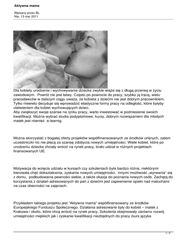 Aktywna mama Wpisany przez BL Nie, 13 mar 2011 Dla kobiety urodzenie i wychowywanie dziecka zwykle wiąże się z długą przerwą w życiu zawodowym. Powrót nie jest łatwy. Często po powrocie do pracy, szybko ją tracą, wielu pracodawców w dalszym ciągu uważa, że kobieta z dziećmi nie jest dobrym pracownikiem. Tylko niewielu decyduje się wprowadzić elastyczne formy pracy na odległość, które byłyby ułatwieniem dla kobiet wychowujących dzieci. Aby zwiększyć swoje szanse na rynku pracy, warto inwestować w podniesienie swoich kwalifikacji. Można wybrać studia podyplomowe, kursy, dobrym rozwiązaniem dla młodych matek jest również e-learnig. Można skorzystać z bogatej oferty projektów współfinansowanych ze środków unijnych, zatem uczestniczki nic nie płacą za szansę zdobycia nowych umiejętności. Wiele kobiet, które po urodzeniu dziecka chciały wrócić na rynek pracy, brało udział w różnych projektach finansowanych UE. Motywacja do wzięcia udziału w kursach czy szkoleniach była bardzo różna, niektórymi kierowała chęć dokształcenia, zyskanie nowych umiejętności, innymi możliwość „wyrwania” się z domu, podbudowania pewności siebie, a także okazja do poznania nowych osób. Zachętą do korzystania z działań adresowanych do pań z dziećmi jest zapewnienie opieki nad maluchami na czas obecności na zajęciach. Przykładem takiego projektu jest ”Aktywna mama” współfinansowany ze środków Europejskiego Funduszu Społecznego. Działania adresowane były do kobiet – matek z Krakowa i okolic, które chcą wrócić na rynek pracy. Szkolenia obejmowały zarówno rozwój umiejętności miękkich jak i zyskanie kwalifikacji niezbędnych do pracy (kurs języka 1/2 Aktywna mama Wpisany przez BL Nie, 13 mar 2011 angielskiego, prawo jazdy, kurs komputerowy). Uczestniczki brały udział w warsztatach integracji zawodowej, aktywnego poszukiwania pracy oraz indywidualnych spotkaniach z doradcą zawodowym. Na czas zajęć zorganizowana była opieka nad dziećmi. Na Mazowszu realizowano projekt „Krok do przodu – kompleksowe szkolenia dla matek powracających na rynek pracy” skierowany do 100 kobiet podejmujących pracę po urlopach wychowawczych i macierzyńskich. Organizowano kursy języka angielskiego i użytkowania technologii komputerowych. Projekt „Mam dzieci i mam pracę” realizowany przez Fundację MANZANA i Warszawskiego Centrum Kobiet, aktywizował kobiety do wejścia na rynek pracy. Aby pomóc matkom w rozwoju i umożliwić budowę kariery zawodowej, zapewniono warsztaty psychologiczne, doradztwo zawodowe, szkolenia z Aktywnego Poszukiwania Pracy, szkolenia z autokreacji i wizażu, a także rozwiązania nowatorskie jak grupa wsparcia, psychoterapia oraz warsztaty dla partnerów, aby łatwiej zaakceptowali sytuację zmiany w domu. Inicjatywa „Dla zdrowia i urody życia” podjęta przez Lubelskie Forum Organizacji Osób Niepełnosprawnych - Sejmik Wojewódzki, była adresowana do matek wychowujących dzieci niepełnosprawne. 40 kobiet wzięło udział w szkoleniach ogólnych (obsługa komputera i Internetu, kurs z zakresu działalności NGO i pozyskiwania środków finansowych na działalność gospodarczą, warsztaty psychologiczne) i zawodowych (sprzedawca-księgowy, kosmetyczka-wizażystka, masażystka i kucharz małej gastronomii). W ramach projektu zwrócono koszty dojazdu, a samotnym matkom zapewniono opiekę nad dzieckiem. Aktualnej oferty szkoleniowej można szukać na stronie www.inwestycjawkadry.info.pl fot. sxc.hu 2/2