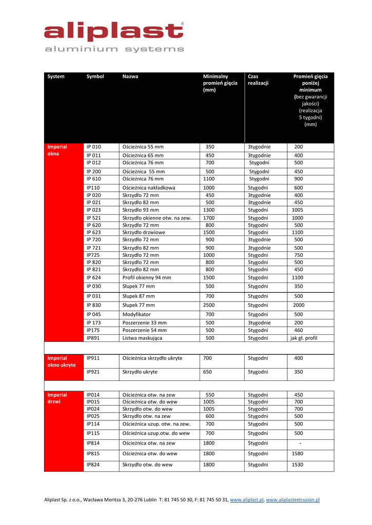 System Symbol Nazwa Imperial okna IP 010 Ościeżnica 55 mm IP 011 IP 012 Minimalny promień gięcia (mm) Czas realizacji Promień gięcia poniżej minimum (bez gwarancji jakości) (realizacja 5 tygodni) (mm) 350 3tygodnie 200 Ościeżnica 65 mm Ościeżnica 76 mm 450 700 3tygodnie 5tygodni 400 500 IP 200 IP 610 Ościeżnica 55 mm Ościeżnica 76 mm 500 1100 5tygodni 5tygodni 450 900 IP110 IP 020 IP 021 IP 023 IP 521 IP 620 IP 623 IP 720 Ościeżnica nakładkowa Skrzydło 72 mm Skrzydło 82 mm Skrzydło 93 mm Skrzydło okienne otw. na zew. Skrzydło 72 mm Skrzydło drzwiowe Skrzydło 72 mm 1000 450 500 1300 1700 800 1500 900 5tygodni 3tygodnie 3tygodnie 5tygodni 5tygodni 5tygodni 5tygodni 3tygodnie 600 400 450 1005 1000 500 1100 500 IP 721 IP725 IP 820 IP 821 IP 624 Skrzydło 82 mm Skrzydło 72 mm Skrzydło 72 mm Skrzydło 82 mm Profil okienny 94 mm 900 1000 800 800 1500 3tygodnie 5tygodni 5tygodni 5tygodni 5tygodni 500 750 500 450 1100 IP 030 Słupek 77 mm 500 5tygodni 350 IP 031 Słupek 87 mm 700 5tygodni 500 IP 830 Słupek 77 mm 2500 5tygodni 2000 IP 045 IP 173 IP175 IP891 Modyfikator Poszerzenie 33 mm Poszerzenie 54 mm Listwa maskująca 700 500 500 500 5tygodni 3tygodnie 5tygodni 5tygodni Imperial okno ukryte IP911 Ościeżnica skrzydło ukryte 700 5tygodni 400 IP921 Skrzydło ukryte 650 5tygodni 350 Imperial drzwi IP014 IP015 IP024 IP025 IP114 Ościeżnica otw. na zew Ościeżnica otw. do wew Skrzydło otw. do wew Skrzydło otw. na zew Ościeżnica uzup. otw. na zew. 550 1005 1005 600 700 5tygodni 5tygodni 5tygodni 5tygodni 5tygodni 450 700 700 500 500 IP115 Ościeżnica uzup.otw. do wew 700 5tygodni 500 IP814 Ościeżnica otw. na zew 1800 5tygodni - IP815 Ościeżnica otw. do wew 1800 5tygodni 1580 IP824 Skrzydło otw. do wew 1800 5tygodni 1530 500 200 460 jak gł. profil Aliplast Sp. z o.o., Wacława Moritza 3, 20-276 Lublin T: 81 745 50 30, F: 81 745 50 31, www.aliplast.pl, www.aliplastextrusion.pl Superial okna Superial drzwi Star okna Triline Econoline IP825 Skrzydło otw. na zew 1500 5tygodni - IP854 IP855 SP010 Profil odwracający Profil odwracający Ościeżnica 55 mm 1500 500 450 5tygodni 5tygodni 3tygodnie 400 SP011 SP012 SP110 SP910 SP020 SP021 SP720 SP721 SP726 SP820 SP175 SP030 Ościeżnica 65 mm Ościeżnica 76 mm Ościeżnica 77mm Ościeżnica 46 mm Skrzydło 72 mm Skrzydło 82 mm Skrzydło 72 mm Skrzydło 82 mm Skrzydło 82 mm Skrzydło 72 mm Poszerzenie 54 mm Słupek 77 mm 450 700 600 500 500 500 900 900 1780 1000 500 600 3tygodnie 5tygodni 5tygodni 5tygodni 3tygodnie 3tygodnie 3tygodnie 3tygodnie 5tygodni 5tygodni 5tygodni 5tygodni 420 500 550 350 470 470 500 500 1000 700 460 550 SP031 Słupek 87 mm 1000 5tygodni 900 SP014 Ościeżnica otw. na zew 1400 5tygodni 1300 SP015 Ościeżnica otw. do wew 2500 5tygodni 1600 SP024 Skrzydło otw. do wew. 2500 5tygodni 1700 SP025 SP814 Skrzydło otw. na zew Ościeżnica otw na zew. 1400 2500 5tygodni 5tygodni 1300 2400 SP815 SP824 SP825 Ościeżnica otw. do wew Skrzydło otw. do wew. Skrzydło otw na zew. 2500 2500 2500 5tygodni 5tygodni 5tygodni 1600 1700 2400 GT010 Ościeżnica 55 mm 550 5tygodni 450 GT011 Ościeżnica 65 mm 700 5tygodni 500 GT020 Skrzydło 77,5 mm 800 5tygodni 520 GT070 Poszerzenie 30 mm 500 5tygodni 400 TL010 Ościeżnica 50 mm 350 3tygodnie 200 TL011 TL012 TL020 TL021 TL022 TL030 TL031 TL032 TL111 TL175 Ościeżnica 65 mm Ościeżnica 76 mm Skrzydło 67 mm Skrzydło 82 mm Skrzydło 93 mm Słupek 72 mm Słupek 87 mm Słupek 98 mm Ościeżnica ok. 87 mm Poszerzenie 54 mm 500 700 500 500 1300 500 700 1000 700 700 3tygodnie 5tygodni 3tygodnie 3tygodnie 5tygodni 5tygodni 5tygodni 5tygodni 5tygodni 5tygodni 400 500 450 450 1005 450 500 800 500 500 TL720 TL721 Skrzydło 72 mm Skrzydło 82 mm 900 900 5tygodni 5tygodni 500 500 EL010 Ościeżnica 50 mm 500 3 tygodnie 450 EL011 Ościeżnica 65 mm 600 3 tygodnie 480 EL024 EL215 Skrzydło drzwi otw. wew. Ościeżnica drzwi 5tygodni 5tygodni 900 950 1850 1900 Aliplast Sp. z o.o., Wacława Moritza 3, 20-276 Lublin T: 81 745 50 30, F: 81 745 50 31, www.aliplast.pl, www.aliplastextrusion.pl Ecofutural Mc Wall Listwy szklące EL224 Skrzydło drzwi 1850 5tygodni 900 ELVL010 ELVL020 Ościeżnica okienna 500 5tygodni 300 Skrzydło okienne 600 5tygodni 400 VL820 Skrzydło 67 mm 1400 5tygodni 1300 EF010 Ościeżnica 55 mm 450 5tygodni 300 EF011 Ościeżnica 65 mm 550 5tygodni 450 EF020 EF210 Skrzydło 72 mm Ościeżnica 50 mm 1200 450 5tygodni 5tygodni 800 400 EF212 Ościeżnica 50 mm 450 5tygodni 400 EF2120 Profil wykańczający 800 5tygodni 650 EF7209 Skrzydło okienne 73 mm 2500 5tygodni 2000 MC010 MC011 MC410 MC413 MC530 MC531 MC532 Słup 40 mm Słup 69 mm Słup 17 mm Słup 79 mm Rygiel 35 mm Rygiel 78 mm Rygiel 49 mm 500 550 500 650 500 1600 650 5tygodni 5tygodni 5tygodni 5tygodni 5tygodni 5tygodni 5tygodni 450 500 450 600 450 1100 600 MC533 Rygiel 88 mm 1500 5tygodni 1450 MC535 Rygiel 49 mm 600 5tygodni 550 VR2030 Rygiel połaciowy 500 5tygodni 400 DK052N Listwa maskująca 16 mm jak gł. profil - - DK053 Listwa maskująca 21 mm jak gł. profil - - DK153 Listwa maskująca 2000 5tygodni 1700 MC055 Listwa dociskowa jak gł. profil - - MC056 MC150 Listwa dociskowa Listwa dociskowa Jak gł. profil jak gł. profil - - MC151 MC156 Listwa dociskowa Listwa maskująca jak gł. profil jak gł. profil - - VL61 Listwa szkląca 4 mm 700 Vl610 Listwa szkląca 8 mm 700 VL611 Listwa szkląca 12 mm 700 VL612 Listwa szkląca 14 mm 700 VL62 Listwa szkląca 16 mm jak gł. profil VL162 Listwa szkląca 17 mm jak gł. profil - - VL63 Listwa szkląca 20 mm jak gł. profil - - VL630 VL64 Listwa szkląca 23 mm Listwa szkląca 26 mm jak gł. profil jak gł. profil - - jak gł. profil jak gł. profil jak gł. profil jak gł. profil - 600 600 600 600 - Aliplast Sp. z o.o., Wacława Moritza 3, 20-276 Lublin T: 81 745 50 30, F: 81 745 50 31, www.aliplast.pl, www.aliplastextrusion.pl VL640 VL65 IP063 Listwa szkląca 30 mm Listwa szkląca 34 mm Listwa szkląca 28 mm jak gł. profil jak gł. profil jak gł