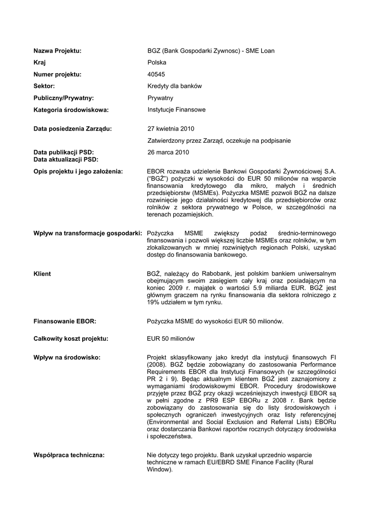 Nazwa Projektu: BGZ (Bank Gospodarki Zywnosc) - SME Loan Kraj Polska Numer projektu: 40545 Sektor: Kredyty dla banków Publiczny/Prywatny: Prywatny Kategoria środowiskowa: Instytucje Finansowe Data posiedzenia Zarządu: 27 kwietnia 2010 Zatwierdzony przez Zarząd, oczekuje na podpisanie Data publikacji PSD: Data aktualizacji PSD: 26 marca 2010 Opis projektu i jego założenia: EBOR rozważa udzielenie Bankowi Gospodarki Żywnościowej S.A. (“BGŻ”) pożyczki w wysokości do EUR 50 milionów na wsparcie finansowania kredytowego dla mikro, małych i średnich przedsiębiorstw (MSMEs). Pożyczka MSME pozwoli BGŻ na dalsze rozwinięcie jego działalności kredytowej dla przedsiębiorców oraz rolników z sektora prywatnego w Polsce, w szczególności na terenach pozamiejskich. MSME zwiększy podaż średnio-terminowego Wpływ na transformacje gospodarki: Pożyczka finansowania i pozwoli większej liczbie MSMEs oraz rolników, w tym zlokalizowanych w mniej rozwiniętych regionach Polski, uzyskać dostęp do finansowania bankowego. Klient BGŻ, należący do Rabobank, jest polskim bankiem uniwersalnym obejmującym swoim zasięgiem cały kraj oraz posiadającym na koniec 2009 r. majątek o wartości 5.9 miliarda EUR. BGŻ jest głównym graczem na rynku finansowania dla sektora rolniczego z 19% udziałem w tym rynku. Finansowanie EBOR: Pożyczka MSME do wysokości EUR 50 milionów. Całkowity koszt projektu: EUR 50 milionów Wpływ na środowisko: Projekt sklasyfikowany jako kredyt dla instytucji finansowych FI (2008). BGŻ będzie zobowiązany do zastosowania Performance Requirements EBOR dla Instytucji Finansowych (w szczególności PR 2 i 9). Będąc aktualnym klientem BGŻ jest zaznajomiony z wymaganiami środowiskowymi EBOR. Procedury środowiskowe przyjęte przez BGŻ przy okazji wcześniejszych inwestycji EBOR są w pełni zgodne z PR9 ESP EBORu z 2008 r. Bank będzie zobowiązany do zastosowania się do listy środowiskowych i społecznych ograniczeń inwestycyjnych oraz listy referencyjnej (Environmental and Social Exclusion and Referral Lists) EBORu oraz dostarczania Bankowi raportów rocznych dotyczący środowiska i społeczeństwa. Współpraca techniczna: Nie dotyczy tego projektu. Bank uzyskał uprzednio wsparcie techniczne w ramach EU/EBRD SME Finance Facility (Rural Window). W celu uzyskania informacji o współpracy z konsultantami przy projektach finansowanych z funduszy współpracy technicznej zapraszamy na stronę procurement of consultants. Kontakt do Banku BGŻ Bank Gospodarki Żywnościowej S.A. ul. Kasprzaka 10/16, 01-211 Warszawa Tel. +48 22 860 40 00; Fax + 48 22 860 50 00 Strona internetowa: www.bgz.pl Kontakt do EBOR: Lilit Davoyan, Operation Leader: [email protected] Możliwości współpracy: W celu otrzymania informacji o możliwościach współpracy lub przetargach prosimy o kontakt z Bankiem BGŻ. Zapytania ogólne: Pytania do EBOR w kwestiach dotyczących projektu niezwiązane z przetargami należy kierować pod: Tel: +44 20 7338 7168; Fax: +44 20 7338 7380 Email: [email protected] Polityka Informacji Publicznej (PIP): PIP określa, w jaki sposób, EBOR ujawnia informacje oraz konsultuje się ze swoimi udziałowcami w celu promowania szerszego zrozumienia jego strategii, polityki oraz działalności. Pełny tekst PIP dostępny jest na stronie: Text of the PIP Mechanizm Składania Skarg (PCM): EBOR stworzył Mechanizm Składania Skarg (PCM), aby umożliwić niezależną ocenę skarg składanych indywidualnie lub przez grupę osób lub organizacji a dotyczących projektów finansowanych przez Bank, które to projekty przypuszczalnie lub prawdopodobnie spowodowały jakiekolwiek szkody. Zasady i procedury zarządzające PCM można znaleźć na stronie: http://www.ebrd.com/about/integrity/irm/about/pcm.pdf , Wersja w jęz. rosyjskim jest dostępna na stronie: http://www.ebrd.com/about/integrity/irm/about/PCMRulesRussian.pdf Każda ze skarg w ramach PCM musi zostać złożona nie później niż 12 miesięcy od daty ostatniej wypłaty funduszy z EBOR. Jeśli nie będziecie Państwo pewni, co do okresu, w którym można składać skargi prosimy kontaktować się z Urzędnikiem PCM (adres email: [email protected]) lub odpowiednim Biurem Regionalnym EBOR.
