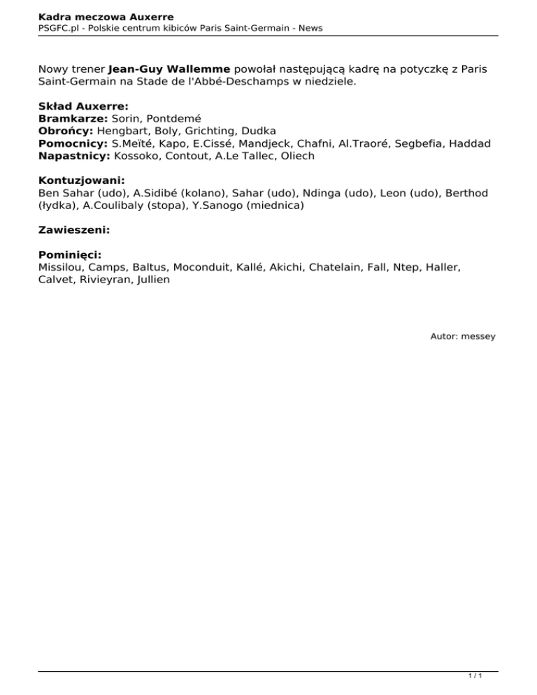 Kadra meczowa Auxerre PSGFC.pl - Polskie centrum kibiców Paris Saint-Germain - News Nowy trener Jean-Guy Wallemme powołał następującą kadrę na potyczkę z Paris Saint-Germain na Stade de l'Abbé-Deschamps w niedziele. Skład Auxerre: Bramkarze: Sorin, Pontdemé Obrońcy: Hengbart, Boly, Grichting, Dudka Pomocnicy: S.Meïté, Kapo, E.Cissé, Mandjeck, Chafni, Al.Traoré, Segbefia, Haddad Napastnicy: Kossoko, Contout, A.Le Tallec, Oliech Kontuzjowani: Ben Sahar (udo), A.Sidibé (kolano), Sahar (udo), Ndinga (udo), Leon (udo), Berthod (łydka), A.Coulibaly (stopa), Y.Sanogo (miednica) Zawieszeni: Pominięci: Missilou, Camps, Baltus, Moconduit, Kallé, Akichi, Chatelain, Fall, Ntep, Haller, Calvet, Rivieyran, Jullien Autor: messey 1/1 Powered by TCPDF (www.tcpdf.org)