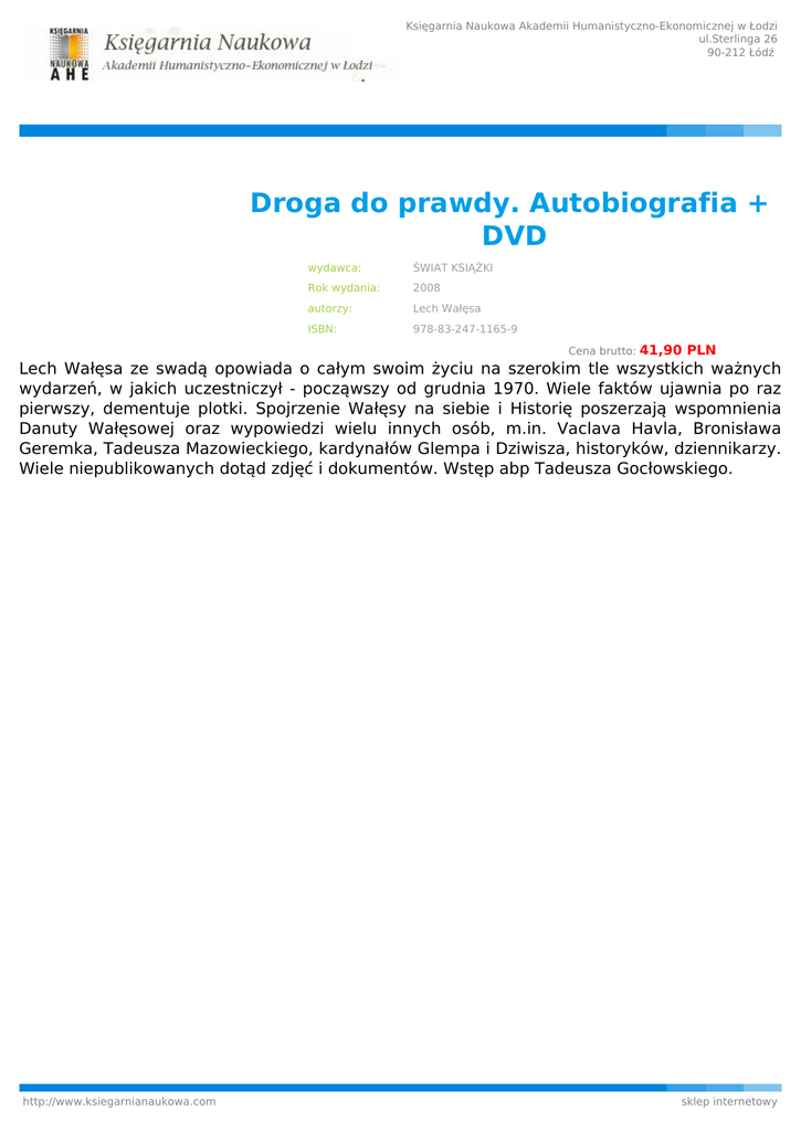 Księgarnia Naukowa Akademii Humanistyczno-Ekonomicznej w Łodzi ul.Sterlinga 26 90-212 Łódź Droga do prawdy. Autobiografia + DVD wydawca: ŚWIAT KSIĄŻKI Rok wydania: 2008 autorzy: Lech Wałęsa ISBN: 978-83-247-1165-9 Cena brutto: 41,90 PLN Lech Wałęsa ze swadą opowiada o całym swoim życiu na szerokim tle wszystkich ważnych wydarzeń, w jakich uczestniczył - począwszy od grudnia 1970. Wiele faktów ujawnia po raz pierwszy, dementuje plotki. Spojrzenie Wałęsy na siebie i Historię poszerzają wspomnienia Danuty Wałęsowej oraz wypowiedzi wielu innych osób, m.in. Vaclava Havla, Bronisława Geremka, Tadeusza Mazowieckiego, kardynałów Glempa i Dziwisza, historyków, dziennikarzy. Wiele niepublikowanych dotąd zdjęć i dokumentów. Wstęp abp Tadeusza Gocłowskiego. http://www.ksiegarnianaukowa.com sklep internetowy
