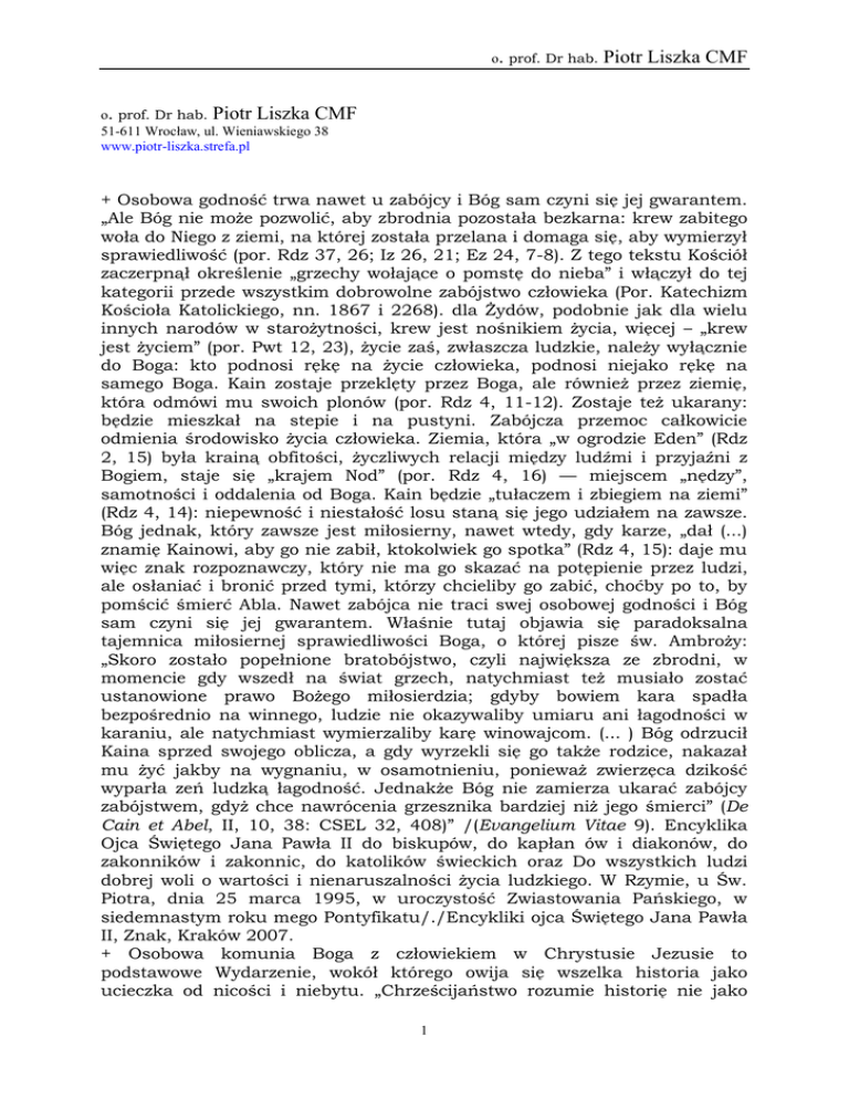 o. prof. Dr hab. Piotr Liszka CMF o. prof. Dr hab. Piotr Liszka CMF 51-611 Wrocław, ul. Wieniawskiego 38 www.piotr-liszka.strefa.pl + Osobowa godność trwa nawet u zabójcy i Bóg sam czyni się jej gwarantem. „Ale Bóg nie może pozwolić, aby zbrodnia pozostała bezkarna: krew zabitego woła do Niego z ziemi, na której została przelana i domaga się, aby wymierzył sprawiedliwość (por. Rdz 37, 26; Iz 26, 21; Ez 24, 7-8). Z tego tekstu Kościół zaczerpnął określenie „grzechy wołające o pomstę do nieba” i włączył do tej kategorii przede wszystkim dobrowolne zabójstwo człowieka (Por. Katechizm Kościoła Katolickiego, nn. 1867 i 2268). dla Żydów, podobnie jak dla wielu innych narodów w starożytności, krew jest nośnikiem życia, więcej – „krew jest życiem” (por. Pwt 12, 23), życie zaś, zwłaszcza ludzkie, należy wyłącznie do Boga: kto podnosi rękę na życie człowieka, podnosi niejako rękę na samego Boga. Kain zostaje przeklęty przez Boga, ale również przez ziemię, która odmówi mu swoich plonów (por. Rdz 4, 11-12). Zostaje też ukarany: będzie mieszkał na stepie i na pustyni. Zabójcza przemoc całkowicie odmienia środowisko życia człowieka. Ziemia, która „w ogrodzie Eden” (Rdz 2, 15) była krainą obfitości, życzliwych relacji między ludźmi i przyjaźni z Bogiem, staje się „krajem Nod” (por. Rdz 4, 16) — miejscem „nędzy”, samotności i oddalenia od Boga. Kain będzie „tułaczem i zbiegiem na ziemi” (Rdz 4, 14): niepewność i niestałość losu staną się jego udziałem na zawsze. Bóg jednak, który zawsze jest miłosierny, nawet wtedy, gdy karze, „dał (...) znamię Kainowi, aby go nie zabił, ktokolwiek go spotka” (Rdz 4, 15): daje mu więc znak rozpoznawczy, który nie ma go skazać na potępienie przez ludzi, ale osłaniać i bronić przed tymi, którzy chcieliby go zabić, choćby po to, by pomścić śmierć Abla. Nawet zabójca nie traci swej osobowej godności i Bóg sam czyni się jej gwarantem. Właśnie tutaj objawia się paradoksalna tajemnica miłosiernej sprawiedliwości Boga, o której pisze św. Ambroży: „Skoro zostało popełnione bratobójstwo, czyli największa ze zbrodni, w momencie gdy wszedł na świat grzech, natychmiast też musiało zostać ustanowione prawo Bożego miłosierdzia; gdyby bowiem kara spadła bezpośrednio na winnego, ludzie nie okazywaliby umiaru ani łagodności w karaniu, ale natychmiast wymierzaliby karę winowajcom. (... ) Bóg odrzucił Kaina sprzed swojego oblicza, a gdy wyrzekli się go także rodzice, nakazał mu żyć jakby na wygnaniu, w osamotnieniu, ponieważ zwierzęca dzikość wyparła zeń ludzką łagodność. Jednakże Bóg nie zamierza ukarać zabójcy zabójstwem, gdyż chce nawrócenia grzesznika bardziej niż jego śmierci” (De Cain et Abel, II, 10, 38: CSEL 32, 408)” /(Evangelium Vitae 9). Encyklika Ojca Świętego Jana Pawła II do biskupów, do kapłan ów i diakonów, do zakonników i zakonnic, do katolików świeckich oraz Do wszystkich ludzi dobrej woli o wartości i nienaruszalności życia ludzkiego. W Rzymie, u Św. Piotra, dnia 25 marca 1995, w uroczystość Zwiastowania Pańskiego, w siedemnastym roku mego Pontyfikatu/./Encykliki ojca Świętego Jana Pawła II, Znak, Kraków 2007. + Osobowa komunia Boga z człowiekiem w Chrystusie Jezusie to podstawowe Wydarzenie, wokół którego owija się wszelka historia jako ucieczka od nicości i niebytu. „Chrześcijaństwo rozumie historię nie jako 1 o. prof. Dr hab. Piotr Liszka CMF samą tylko przeszłość, zwłaszcza bezpowrotną ani jako nie związany niczym rozsyp zdarzeń, lecz jako ruch stworzenia od jego początku do finału i jako kształtowanie się światów osobowych w łonie wszechbytu. Oto wszechświat, ziemia, ludzkość i „ogród materii” nie tylko trwają dla samego trwania i mieczami Cherubów strzegą swojej niezmienności lub przyglądają się sobie w lustrach nicości, lecz okazują się ruchem naprzód, jednokierunkowym, nieodwracalnym czasowo, słowem: są historią. Historyczność należy do fundamentalnych struktur bytu stworzonego, czyli świat jest zawieszony między bytem a nicością, życiem a śmiercią. I tu Jezus Chrystus funkcjonuje również jako Transformator od nicości ku bytowi, od śmierci do życia, od czasu ku wieczności. Sam jest Historią par excellence, Historią historii, Historią zbawczą, Czasowiecznością. Jest On zasadą najbardziej wewnętrznego ruchu rzeczywistości: zwornikiem zdarzeń, ośrodkiem, kodem, rozumieniem, alfabetem hermeneutycznym od alfy do omegi. Stanowi właśnie podstawowy paradygmat „drogi rzeczywistości stworzonej”, czyli archetypu dziejowego: od Boga do „dolnej” granicy świata i od świata ku Bogu. Ze względu na osobową Komunię i tożsamość Boga z człowiekiem w Chrystusie Jezusie mamy Podstawowe Wydarzenie, wokół którego owija się wszelka historia jako ucieczka od nicości i niebytu. Jest to wydarzenie wszelkich wydarzeń. Sam Bóg z istoty swej niehistoryczny staje się historią ludzką i przedłuża się o Historię Kosmiczną. Jednocześnie Historia Jezusa z Nazaretu staje się współrozciągła względem historii każdego człowieka, nawet tego, któremu nie pozwolono się narodzić, względem historii całej ludzkości oraz całej historii świata, gdzieś od Pierwotnego Atomu po Ostatni” /Cz. S. Bartnik, Dogmatyka Katolicka, t. 1, Redakcja Wydawnictw KUL, Lublin 1999, s. 805. + Osobowa relacja Boga do stworzenia utworzona we Wcieleniu, wewnętrzna, nie reistyczna. „Bywają zarzuty, że zdanie teologiczne o Chrystusie jako ośrodku świata ma charakter gnostycki, poetycki, czysto fantazyjny. Wydaje się jednak, że zarzuty te można odeprzeć na podstawie racji teologicznej. Jest nią sama struktura Fenomenu Jezusa Chrystusa. Św. Tomasz z Akwinu – a za nim wielu teologów – uczył, że owym ośrodkiem wszechświata jest Bóstwo Chrystusa bez względu na Jego lu