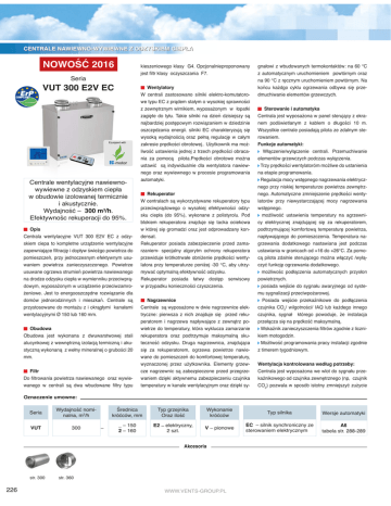 CENTRALE NAWIEWNO-WYWIEWNE Z ODZYSKIEM CIEPŁA NOWOŚĆ 2016 kieszeniowego klasy G4. Opcjonalnieproponowany jest filtr klasy oczyszczania F7. Seria VUT 300 E2V EC Centrale wentylacyjne nawiewnowywiewne z odzyskiem ciepła w obudowie izolowanej termicznie i akustycznie. Wydajność – 300 m3/h. Efektywnośc rekuperacji do 95%. Opis Centrala wentylacyjne VUT 300 E2V EC z odzyskiem ciepa to kompletne urządzenie wentylacyjne zapewniające filtrację i dopływ świeżgo powietrza do pomieszczeń, przy jednoczesnym efektywnym usuwaniem powietrza zanieczyszczonego. Powietrze usuwane ogrzewa strumień powietrza nawiewanego na drodze odzysku ciepła w wymienniku przeciwprądowym, wyposażonym w urządzenie przeciwzamrożeniowe. Jest to energooszczędne rozwiązanie dla domów jednorodzinnych i mieszkań. Centrale są przystosowane do montażu z i okrągłymi kanałami wentylacyjnymi Ø 150 lub 160 mm. Obudowa Obudowa jest wykonana z dwuwarstwowej stali alucynkowej z wewnętrzną izolacją termiczną i akustyczną wykonaną z wełny mineralnej o grubości 20 mm. Filtr Do filtrowania powietrza nawiewanego oraz wywiewanego w centrali są dwa wbudowane filtry typu Wentylatory W centrali zastosowano silniki elektro-komutatorowe typu EC z prądem stałym o wysokiej sprawności z zewnętrznym wirnikiem, wyposażonym w łopatki zagięte do tyłu. Takie silniki na dzień dzisiejszy są najbardziej postępowym rozwiązaniem w dziedzinie oszczędzania energii. silniki EC charakteryzują się wysoką wydajnością oraz pełną regulację w całym zakresie prędkości obrotowej.. Użytkownik ma możliwość ustawienia jednej z trzech prędkości obracania za pomocą pilota.Prędkości obrotowe można ustawić są indywidualnie dla wentylatora nawiewnego oraz wywiewnego w procesie programowania automatyki. Rekuperator W centralach są wykorzystywane rekuperatory typu przeciwprądowego o wysokiej efektywności odzysku ciepła (do 95%), wykonane z polistyrolu. Pod blokiem rekuperatora znajduje się tacka ociekowa w której się gromadzi oraz jest odprowadzany kondensat. Rekuperator posiada zabezpieczenie przed zamarzaniem- specjalny algorytm ochrony rekuperatora przewiduje krótkotrwałe obniżenie prędkości wentylatora przy temperaturze poniżej -30 °C, aby utrzymywać optymalną efektywność odzysku. Rekuperator posiada łatwy dostęp serwisowy w przypadku konieczności czyszczenia. Nagrzewnice Centrale są wyposażone w dwie nagrzewnice elektryczne: pierwsza z nich znajduje się przed rekuperatorem i nagrzewa napływające z zewnątrz powietrze do temperatury, która wyklucza zamarzanie rekuperatora oraz podtrzymuje maksymalną skuteczność odzysku. Druga nagrzewnica, znajdująca się za rekuperatorem, ogrzewa powietrze nawiewane do pomieszczeń do komfortowej temperatury, wyznaczonej przez użytkownika. Elementy grzewcze nagrzewnic są zabezpieczone przed przegrzewaniem dzięki aktywnemu zabezpieczeniu czujnika temperatury w kanale wentylacyjnym oraz dzięki sy- gnałowi z wbudowanych termokontaktów: na 60 °C z automatycznym uruchomieniem powtórnym oraz na 90 °C z ręcznym uruchomieniem powtórnym. Na końcu każdgo cyklu ogrzewania odbywa się przedmuchiwanie elementów grzewczych. Sterowanie i automatyka Centrala jest wyposażona w panel sterujący z ekranem podświetlanym z kablem o długości 10 m. Wszystkie centrale posiadają pilota ze zdalnym sterowaniem. Funkcje automatyki: Włączenie/wyłączenie centrali. Przemuchiwanie elementów grzewczych podczas wyłączenia. Trzy prędkości wentylatoróm możliwe do ustanienia na etapie programowania. Regulacja mocy wstępnego nagrzewania elektrycznego przy niskiej temperaturze powietrza zewnętrznego. Automatyczne zmniejszenie prędkości wentylatorów przy niewystarczającej mocy nagrzewania wstępnego. możliwość ustawienia temperatury na agrzewnicy elektrycznej znajdującej się za rekuperatorem, podtrzymującej komfortową temperaturę powietrza, napływającego do pomieszczenia. Temperatura nagrzewania dodatkowego nastawiana jest podczas ustawiania w granicach od +16 do +26°C. Za pomocą pilota zdalnie sterującego można włączyć /wyłączyć funkcję ogrzewania dodatkowego. możliwośc podłączenia automatycznych przysłon powietrznych. posiada wejście do sygnału awaryjnego od systemu sygnalizacji przeciwpożarowej. Posiada wejście przekaźnikowe do podłączenia czujnika CO2/ wilgotności/ IAQ lub każdego innego czujnika, sygnał którego powoduje, że instalacja przełącza się na prędkość maksymalną. Wskaźnik zanieczyszczenia filtrów zgodnie z licznikiem motogodzin. Możliwość programowania pracy instalacji zgodnie z timerem tygodniowym. Wentylacja kontrolowana według potrzeby: Centrala jest wyposażona we wlot do sygnału przekaźnikowego od czujnika zewnętrznego (np, czujnik CO2) pozwala w sposób istotny zmniejszyć zużycie Oznaczenie umowne: Seria Wydajność nominalna, m3/h VUT 300 – Średnica króćców, mm Typ grzejnika Oraz ilość Wykonanie króćców Typ silnika Wersje automatyki _ – 150 2 – 160 E2 – elektryczny, 2 szt. V – pionowe EC – silnik synchroniczny ze sterowaniem elektrycznym A6 tabela str. 288-289 Akcesoria str. 300 226 str. 360 WWW.VENTS-GROUP.PL WWW.VENTS-GROUP.PL energii. Algorytm pracy można rozpatrzeć na przykładzie pracy z czujnikiem CO2: Kiedy w mieszkaniu nikogo nie ma, poziom CO2 jest niski, i nie ma konieczności w zbyt intensywnej wentylacji. Centrala pracuje z prędkością minimalną dla „ciągłego przewietrzania” pomieszczeń. Kiedy w pomieszczeniu pojawiają się ludzie, poziom CO2 zwiększa się i czujnik przekazuje sygnał o tym do instalacji, zamykając styk przekaźnikowy. Centrala zgodnie z tym sygnałem automatycznie przełącza sie na prędkość maksymalną i pracuje z nią do tej pory, póki poziom CO2 nie zmniejszy się i styk się otworzy. Następnie centrala wraca do prędkości minimalnej. Aby stworzyć taki system pracy wystarczy nabyć jakikolwie