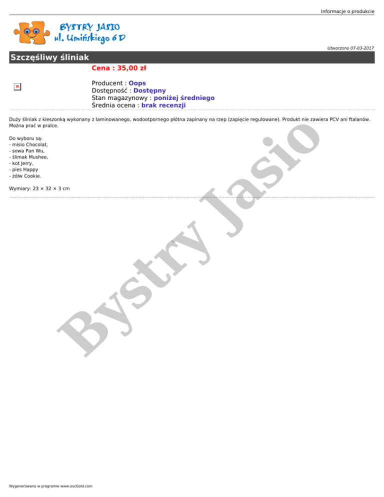 Informacje o produkcie Utworzono 07-03-2017 Szczęśliwy śliniak Cena : 35,00 zł Producent : Oops Dostępność : Dostępny Stan magazynowy : poniżej średniego Średnia ocena : brak recenzji Duży śliniak z kieszonką wykonany z laminowanego, wodootpornego płótna zapinany na rzep (zapięcie regulowane). Produkt nie zawiera PCV ani ftalanów. Można prać w pralce. si o Do wyboru są: - misio Chocolat, - sowa Pan Wu, - ślimak Mushee, - kot Jerry, - pies Happy - żółw Cookie. B ys tr y Ja Wymiary: 23 × 32 × 3 cm Wygenerowano w programie www.oscGold.com