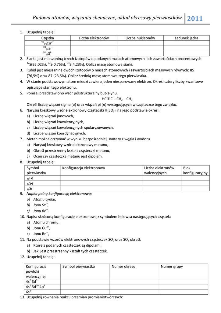 I. Budowa atomów, wiązania chemiczne, układ okresowy