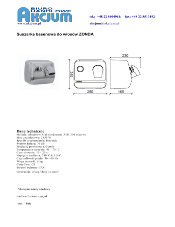 tel.: +48 22 8404961; www.akcjum.pl fax: +48 22 8513192 [email protected] Suszarka basenowa do włosów ZONDA Model ten przeznaczony jest do montażu na ścianie. Specjalne uchwyty można zamocować w kilku miejscach, aby używać podnośnio takich funkcji jak przeniesienie osoby: n a łóżko i z łóżka na wózek do wanny i z wanny z toalety i na toaletę z materaca do ćwiczeń i na materac inne szczególne zastosowania wg potrzeb Dane techniczne przeznaczony jest do montażu na ścianie. Materiał obudowy: Stal nierdzewna AISI 304 matowa Moc znamionowa: 2450 W Sposób uruchamiania: Przycisk Poziom hałasu: 70 dB Prędkość powietrza:133km/h Temperatura suszenia: 45 - 70 °C Czas suszenia: 15 - 20 s Napięcie zasilania: 230 V & 110V Częstotliwość prądu: 50 - 60 Hz Waga suszarki: 6 kg Certyfikat: CE Stopień ochrony: IPXI Gwarancja: 2 lata "door-to-door”o łazienkiskonale przejezdnego i **dostępne kolory obudowy - stal nierdzewna – połysk - stal – bały wysokiej ruchu i ciągłej pracy . spełnia funkcje podnośnika