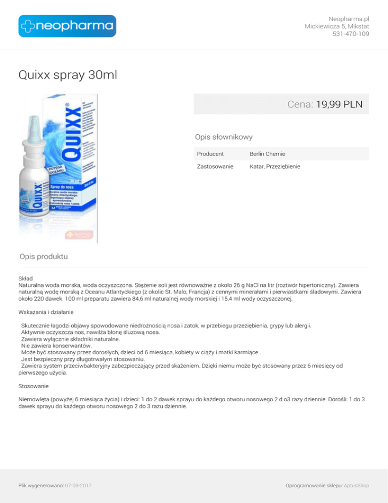 Neopharma.pl Mickiewicza 5, Mikstat 531-470-109 Quixx spray 30ml Cena: 19,99 PLN Opis słownikowy Producent Berlin Chemie Zastosowanie Katar, Przeziębienie Opis produktu Skład Naturalna woda morska, woda oczyszczona. Stężenie soli jest równoważne z około 26 g NaCl na litr (roztwór hipertoniczny). Zawiera naturalną wodę morską z Oceanu Atlantyckiego (z okolic St. Malo, Francja) z cennymi minerałami i pierwiastkami śladowymi. Zawiera około 220 dawek. 100 ml preparatu zawiera 84,6 ml naturalnej wody morskiej i 15,4 ml wody oczyszczonej. Wskazania i działanie Skutecznie łagodzi objawy spowodowane niedrożnością nosa i zatok, w przebiegu przeziębienia, grypy lub alergii. Aktywnie oczyszcza nos, nawilża błonę śluzową nosa. Zawiera wyłącznie składniki naturalne. Nie zawiera konserwantów. Może być stosowany przez dorosłych, dzieci od 6 miesiąca, kobiety w ciąży i matki karmiące . Jest bezpieczny przy długotrwałym stosowaniu. Zawiera system przeciwbakteryjny zabezpieczający przed skażeniem. Dzięki niemu może być stosowany przez 6 miesięcy od pierwszego użycia. Stosowanie Niemowlęta (powyżej 6 miesiąca życia) i dzieci: 1 do 2 dawek sprayu do każdego otworu nosowego 2 d o3 razy dziennie. Dorośli: 1 do 3 dawek sprayu do każdego otworu nosowego 2 do 3 razu dziennie. Plik wygenerowano: 07-03-2017 Powered by TCPDF (www.tcpdf.org) Oprogramowanie sklepu: AptusShop