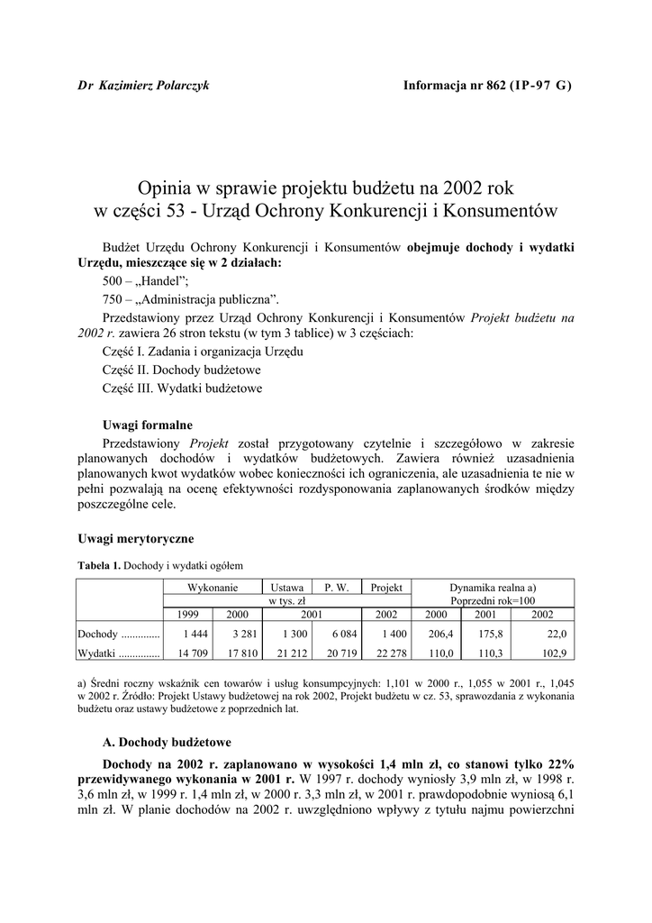 Dr Kazimierz Polarczyk Informacja nr 862 (IP-97 G) Opinia w sprawie projektu budżetu na 2002 rok w części 53 - Urząd Ochrony Konkurencji i Konsumentów Budżet Urzędu Ochrony Konkurencji i Konsumentów obejmuje dochody i wydatki Urzędu, mieszczące się w 2 działach: 500 – „Handel”; 750 – „Administracja publiczna”. Przedstawiony przez Urząd Ochrony Konkurencji i Konsumentów Projekt budżetu na 2002 r. zawiera 26 stron tekstu (w tym 3 tablice) w 3 częściach: Część I. Zadania i organizacja Urzędu Część II. Dochody budżetowe Część III. Wydatki budżetowe Uwagi formalne Przedstawiony Projekt został przygotowany czytelnie i szczegółowo w zakresie planowanych dochodów i wydatków budżetowych. Zawiera również uzasadnienia planowanych kwot wydatków wobec konieczności ich ograniczenia, ale uzasadnienia te nie w pełni pozwalają na ocenę efektywności rozdysponowania zaplanowanych środków między poszczególne cele. Uwagi merytoryczne Tabela 1. Dochody i wydatki ogółem Wykonanie 1999 2000 Ustawa P. W. w tys. zł 2001 Projekt 2002 Dynamika realna a) Poprzedni rok=100 2000 2001 2002 Dochody .............. 1 444 3 281 1 300 6 084 1 400 206,4 175,8 22,0 Wydatki ............... 14 709 17 810 21 212 20 719 22 278 110,0 110,3 102,9 a) Średni roczny wskaźnik cen towarów i usług konsumpcyjnych: 1,101 w 2000 r., 1,055 w 2001 r., 1,045 w 2002 r. Źródło: Projekt Ustawy budżetowej na rok 2002, Projekt budżetu w cz. 53, sprawozdania z wykonania budżetu oraz ustawy budżetowe z poprzednich lat. A. Dochody budżetowe Dochody na 2002 r. zaplanowano w wysokości 1,4 mln zł, co stanowi tylko 22% przewidywanego wykonania w 2001 r. W 1997 r. dochody wyniosły 3,9 mln zł, w 1998 r. 3,6 mln zł, w 1999 r. 1,4 mln zł, w 2000 r. 3,3 mln zł, w 2001 r. prawdopodobnie wyniosą 6,1 mln zł. W planie dochodów na 2002 r. uwzględniono wpływy z tytułu najmu powierzchni biurowej w wysokości 1 mln zł i wpływy z kar pieniężnych za stosowanie praktyk monopolistycznych w wysokości 400 tys. zł. Plan dochodów w poprzednich latach był wykonywany z reguły z dużą nadwyżką. Wynikało to stąd, że Urząd planował wpływy z kar pieniężnych za stwierdzone praktyki monopolistyczne na poziomie niższym niż wykonywany w poprzednich latach, zakładając tendencję spadkową tych wpływów, co nie potwierdzało się. Ograniczenie tych wpływów wystąpiło tylko w 2000 r. Plan dochodów na 2002 r. został kolejny raz ustalony bardzo ostrożnie, na poziomie możliwego minimum. B. Wydatki budżetowe Wydatki na 2002 r. w cz. 53 zaplanowano w wysokości 22,3 mln zł. W stosunku do przewidywanego wykonania w 2001 r. jest to wzrost realny o 3%. Wzrost ten wynika z zaplanowanego wzrostu nakładów na inwestycje oraz z przejęcia przez cz. 53 z budżetu wojewodów kosztów działalności laboratoriów kontrolno-analitycznych. Przy ich pominięciu, plan na 2002 r. w zakresie pozostałych wydatków wskazuje realny spadek wydatków o ok. 10% w stosunku do przewidywanego wykonania w 2001 r. Po kilku latach dość dynamicznego wzrostu wydatków pozainwestycyjnych w cz. 53, w 2002 r. przewidziany jest ich spadek. W dziale 500 (Handel) zaplanowano wydatki na sumę 9,1 mln zł, co oznacza w stosunku do przewidywanego wykonania w 2001 r. realny wzrost o 11%. Jednak przy pominięciu inwestycji oraz przejętych z budżetów wojewodów laboratoriów kontrolno-analitycznych przewidziany jest spadek wydatków o ok. 18%. W dziale 750 (Administracja publiczna) zaplanowano wydatki w kwocie 13,2 mln zł, co oznacza spadek realny o 2,3% w stosunku do przewidywanego wykonania w 2001 r., a przy pominięciu inwestycji spadek realny o 7%. Tablela 2. Wydatki w tys. zł Dział Rozdział 1997 Wykonanie 1998 1999 2000 PW 2001 Projekt 2002 OGÓŁEM .................................. Dotacje ....................................... Świadczenia na rzecz osób fiz. Wydatki bieżące j. b. ............... Wydatki majątkowe ................. 10 619 1 259 27 8 793 540 12 772 1 842 1 10 241 688 14 709 2 265 0 10 457 1 987 17 810 2 232 0 13 631 1 946 20 719 2 165 20 17 789 745 22 278 1 900 20 18 535 1 823 500 - Handel................................ 50001 - Inspekcja Handlowa ....... 50095 - Pozostała działalność ..... 3 098 1 839 1 259 4 105 2 263 1 842 5 212 2 947 2 265 6 153 3 921 2 232 7 801 5 636 2 165 9 085 7 185 1 900 750 - Administracja publiczna 75000 – Integracja z UE .............. 75001 - Urzędy naczelne ............. Źródło: jak pod tabl. 1. 7 521 0 7 283 8 667 6 8 523 9 497 0 9 343 11 657 156 11 382 12 918 296 12 468 13 193 100 12 993 Tablela 3. Dynamika realna i struktura wydatków ogólnych i według działów Dział Rozdział 1999 Dynamika realna a) 2000 2001 2002 rok poprzedni = 100 1999 Struktura 2000 2001 w procentach 2002 OGÓŁEM ................................... 107,3 Dotacje ...................................... 114,6 Wydatki bieżące j. b. ................ 95,2 Wydatki majątkowe .................. 269,2 110,0 89,5 118,4 89,0 110,3 91,9 123,7 36,3 102,9 84,0 99,7 234,2 100,0 15,4 71,1 13,5 100,0 12,5 76,5 10,9 100,0 10,4 85,9 3,6 100,0 8,5 83,2 8,2 500 - Handel................................. 118,3 50001 - Inspekcja Handlowa 121,4 50095 - Pozostała działalność 114,6 107,2 120,8 89,5 120,2 136,2 91,9 111,4 122,0 84,0 35,4 20,0 15,4 34,5 22,0 12,5 37,7 27,2 10,4 40,8 32,3 8,5 750 - Administracja publiczna .. 102,1 75001 - Urzędy naczelne ............... 102,2 111,5 110,6 105,0 103,8 97,7 99,7 64,6 63,5 65,5 63,9 62,3 60,2 59,2 58,3 a) Średni roczny wskaźnik cen towarów i usług konsumpcyjnych: 1,118% w 1998 r.; 1,073 w 1999 r.; 1,101 w 2000 r., 1,055 w 2001 r., 1,045 w 2002 r. Źródło: Obliczenia własne na podstawie danych tabl. 2. W strukturze planowanych wydatków na 2002 r. najwyższy udział mają mieć wynagrodzenia łącznie z pochodnymi (68,2%), nieznacznie większy niż w 2001 r. (67,5%), ale znacznie większy niż w 2000 r. (59,5%). Wydatki na zakup
