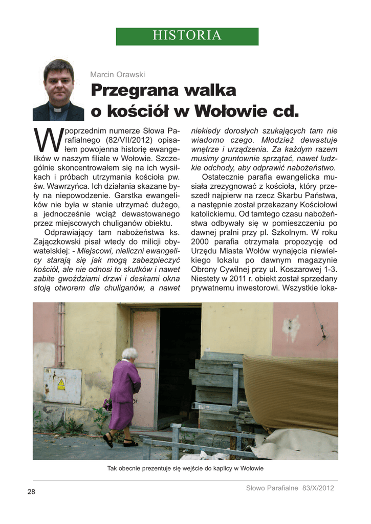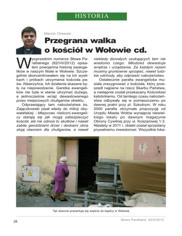 HISTORIA Przegrana walka o kościół w Wołowie cd. Marcin Orawski W poprzednim numerze Słowa Parafialnego (82/VII/2012) opisałem powojenna historię ewangelików w naszym filiale w Wołowie. Szczególnie skoncentrowałem się na ich wysiłkach i próbach utrzymania kościoła pw. św. Wawrzyńca. Ich działania skazane były na niepowodzenie. Garstka ewangelików nie była w stanie utrzymać dużego, a jednocześnie wciąż dewastowanego przez miejscowych chuliganów obiektu. Odprawiający tam nabożeństwa ks. Zajączkowski pisał wtedy do milicji obywatelskiej: - Miejscowi, nieliczni ewangelicy starają się jak mogą zabezpieczyć kościół, ale nie odnosi to skutków i nawet zabite gwoździami drzwi i deskami okna stoją otworem dla chuliganów, a nawet niekiedy dorosłych szukających tam nie wiadomo czego. Młodzież dewastuje wnętrze i urządzenia. Za każdym razem musimy gruntownie sprzątać, nawet ludzkie odchody, aby odprawić nabożeństwo. Ostatecznie parafia ewangelicka musiała zrezygnować z kościoła, który przeszedł najpierw na rzecz Skarbu Państwa, a następnie został przekazany Kościołowi katolickiemu. Od tamtego czasu nabożeństwa odbywały się w pomieszczeniu po dawnej pralni przy pl. Szkolnym. W roku 2000 parafia otrzymała propozycję od Urzędu Miasta Wołów wynajęcia niewielkiego lokalu po dawnym magazynie Obrony Cywilnej przy ul. Koszarowej 1-3. Niestety w 2011 r. obiekt został sprzedany prywatnemu inwestorowi. Wszystkie loka- Tak obecnie prezentuje się wejście do kaplicy w Wołowie 28 Słowo Parafialne 83/X/2012 Historia le zostały opuszczone, z wyjątkiem kaplicy, której nie ma gdzie przenieść. Nowy właściciel chciałby, aby pomieszczenie zostało zwolnione jak najszybciej. Sytuacja jest więc bardzo niepewna, a będzie jeszcze trudniejsza 1 stycznia 2014 r. kiedy, jako ewangelicy, możemy zostać bez lokalu, w którym będzie możliwe odprawianie nabożeństw. Od chwili sprzedaży kamienicy prywatnemu podmiotowi parafia prowadzi rozmowy z władzami Wołowa na temat wynajęcia lub zakupu innego lokalu, w którym mogłaby się mieścić kaplica. Władze miasta deklarują rozwiązanie problemu, ale mimo naszych wysiłków do dziś nie zostały podjęte żadne decyzje. Mamy nadzieję, że ta - co tu ukrywać Wnętrze kaplicy - bardzo przykra dla nas sytuacja, szybko znajdzie pozytywny finał. W reakcji na artykuł do naszej redakcji przydszedł list parafianki Izabeli Szubert, który publikujemy poniżej: Poruszona artykułem p.t.: „Przegrana walka o kościół w Wołowie“ autorstwa księdza Marcina Orawskiego, chciałabym wesprzeć i dodać otuchy naszym współwyznawcom z Wołowa, którzy odczuwają niechęć i odrzucenie ze strony otaczającego ich społeczeństwa wyznania katolickiego i są, a dzieje się tak nie od dziś, tylko przez lata, przerzucani na boczny tor, lekceważeni, nie brani pod uwagę w tej „grze”, zwanej „być albo nie być”! To strasznie przykre i trudne dla Was , że może nadejść chwila, w której nie będziecie mieli gdzie spotykać się na niedzielnych nabożeństwach w Wołowie i budować tam swojej wiary w sercach i umysłach. Zawsze trzeba być przygotowanym na najgorsze, by móc pokonać to, co złe, ale pamiętać o tym, że nasza wiara jest w naszych sercach, tak jak w sercu naszego Pana Jezusa Chrystusa ukrzyżowanego, poniżonego i wyszydzonego przez złych ludzi bez czci i wiary w Boga, ale później zmartwychwstałego w ludzkich duszach i umysłach, by przetrwać. Kochani Wołowianie i Ścinawianie, KOŚCIÓŁ to nie tylko budynek. KOŚCIÓŁ to przede wszystkim ludzie, bo to właśnie WY jesteście tym KOŚCIOŁEM, tworzycie KOŚCIÓŁ! Zawsze możecie się spotykać u kogoś życzliwego na wspólnej modlitwie. Chętnie zapraszamy Was również do naszego kościoła p.w. Opatrzności Bożej przy ul. Kazimierza Wielkiego 29 we Wrocławiu. Bardzo by mi było miło, gdyby ktoś z Wołowa lub Ścinawy nawiązał ze mną kontakt listowy i podzielił się swoimi wiadomościami i odczuciami, dotyczącymi dalszych losów zboru w Wołowie. Szczególnie ważna jest dla mnie opinia młodych ludzi, którzy wiążą swe dalsze życie z naszym Kościołem. Od redakcji: W celu uzyskania adresu do autorki listu prosimy o kontakt z redakcją, tel. +4871 343 47 30, e-mail [email protected] Słowo Parafialne 83/X/2012 Izabela Szubert 29