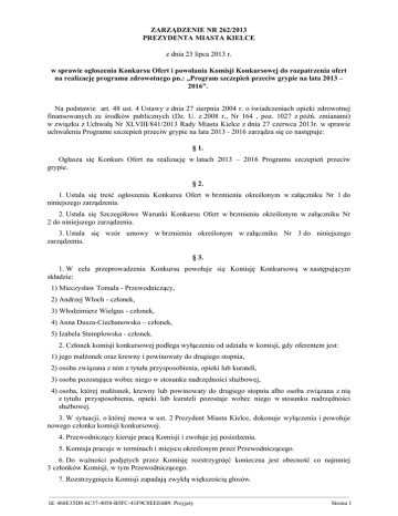 ZARZĄDZENIE NR 262/2013 PREZYDENTA MIASTA KIELCE z dnia 23 lipca 2013 r. w sprawie ogłoszenia Konkursu Ofert i powołania Komisji Konkursowej do rozpatrzenia ofert na realizację programu zdrowotnego pn.: „Program szczepień przeciw grypie na lata 2013 – 2016”. Na podstawie art. 48 ust. 4 Ustawy z dnia 27 sierpnia 2004 r. o świadczeniach opieki zdrowotnej finansowanych ze środków publicznych (Dz. U. z 2008 r., Nr 164 , poz. 1027 z późń. zmianami) w związku z Uchwałą Nr XLVIII/841/2013 Rady Miasta Kielce z dnia 27 czerwca 2013r. w sprawie uchwalenia Programu szczepień przeciw grypie na lata 2013 - 2016 zarządza się co następuje: § 1. Ogłasza się Konkurs Ofert na realizację w latach 2013 – 2016 Programu szczepień przeciw grypie. § 2. 1. Ustala się treść ogłoszenia Konkursu Ofert w brzmieniu określonym w załączniku Nr 1 do niniejszego zarządzenia. 2. Ustala się Szczegółowe Warunki Konkursu Ofert w brzmieniu określonym w załączniku Nr 2 do niniejszego zarządzenia. 3. Ustala się wzór umowy w brzmieniu określonym w załączniku Nr 3 do niniejszego zarządzenia. § 3. 1. W celu przeprowadzenia Konkursu powołuje się Komisję Konkursową w następującym składzie: 1) Mieczysław Tomala - Przewodniczący, 2) Andrzej Włoch - członek, 3) Włodzimierz Wielgus - członek, 4) Anna Dusza-Ciechanowska – członek, 5) Izabela Stemplowska - członek. 2. Członek komisji konkursowej podlega wyłączeniu od udziału w komisji, gdy oferentem jest: 1) jego małżonek oraz krewny i powinowaty do drugiego stopnia, 2) osoba związana z nim z tytułu przysposobienia, opieki lub kurateli, 3) osoba pozostająca wobec niego w stosunku nadrzędności służbowej, 4) osoba, której małżonek, krewny lub powinowaty do drugiego stopnia albo osoba związana z nią z tytułu przysposobienia, opieki lub kurateli pozostaje wobec niego w stosunku nadrzędności służbowej. 3. W sytuacji, o której mowa w ust. 2 Prezydent Miasta Kielce, dokonuje wyłączenia i powołuje nowego członka komisji konkursowej. 4. Przewodniczący kieruje pracą Komisji i zwołuje jej posiedzenia. 5. Komisja pracuje w terminach i miejscu określonym przez Przewodniczącego. 6. Do ważności podjętych przez Komisję rozstrzygnięć konieczna jest obecność co najmniej 3 członków Komisji, w tym Przewodniczącego. 7. Rozstrzygnięcia Komisji zapadają zwykłą większością głosów. —————————————————————————————————————————————————— Id: 468E35D8-6C37-4058-B5FC-41F9C0EEE6B9. Przyjety Strona 1 8. Komisja Konkursowa obraduje na posiedzeniach zamkniętych bez udziału Oferentów. 9. Z przebiegu konkursu Komisja Konkursowa sporządza protokół, który powinien zawierać: 1) oznaczenie miejsca i czasu konkursu, 2) imiona i nazwiska członków Komisji Konkursowej 3) wskazanie liczby zgłoszonych ofert, 4) wskazanie ofert odpowiadających warunkom określonym w szczegółowych warunkach konkursu ofert, 5) wskazanie ofert nie odpowiadających warunkom określonym w szczegółowych warunkach konkursu ofert lub zgłoszonych po terminie (wraz z uzasadnieniem), 6) wskazanie oferty/ofert najkorzystniejszej dla przyjmującego zamówienie albo stwierdzenie, iż żadna z ofert nie spełnia warunków określonych w Szczegółowych Warunkach Konkursu Ofert (wraz z uzasadnieniem) 7) wzmiankę o odczytaniu protokołu 8) podpisy członków Komisji Konkursowej 10. Konkurs zostanie rozstrzygnięty w ciągu 7 dni od daty, w której upływa termin składania ofert. 11. Rozstrzygnięcia konkursu dokona Prezydent Miasta Kielce na podstawie wniosku Komisji Konkursowej. 12. Prezydent Miasta Kielce może zamknąć Konkurs bez dokonywania wyboru żadnej oferty. 13. Prezydent Miasta Kielce niezwłocznie zawiadomi Oferentów o zakończeniu konkursu i jego wyniku . 14. Komisja Konkursowa rozwiązuje się z chwilą rozstrzygnięcia konkursu ofert. § 4. Wykonanie Zarządzenia powierza się Dyrektorowi Wydziału Edukacji, Kultury i Sportu. § 5. Zarządzenie podlega ogłoszeniu w siedzibie oraz na stronie internetowej Urzędu Miasta Kielce. § 6. Zarządzenie wchodzi w życie z dniem podpisania. Prezydent Miasta Kielce Wojciech Lubawski —————————————————————————————————————————————————— Id: 468E35D8-6C37-4058-B5FC-41F9C0EEE6B9. Przyjety Strona 2 Załącznik Nr 1 do Zarządzenia w sprawie ogłoszenia Konkursu Ofert i powołania Komisji Konkursowej do rozpatrzenia ofert na realizację programu zdrowotnego pn.: „Program szczepień przeciw grypie na lata 2013 -2016”. Ogłoszenie o konkursie ofert, którego przedmiotem jest realizacja programu zdrowotnego pn.: „Program szczepień przeciw grypie na lata 2013 – 2016” Na podstawie art. 48 ust. 4 Ustawy z dnia 27 sierpnia 2004r. o świadczeniach opieki zdrowotnej finansowanych ze środków publicznych (Dz. U z 2008 r., Nr. 164 , poz. 1027 z późń. zmianami) Prezydent Miasta Kielce ogłasza konkurs na realizację programu zdrowotnego pn.: Program szczepień przeciw grypie na lata 2013 – 2016. 1.Udzielającym zamówienie jest Gmina Kielce z siedzibą przy ul. Rynek 1, 25-303 Kielce. 2. Przedmiotem konkursu ofert i realizacji programu jest: przyjęcie obowiązków udzielenia świadczeń zdrowotnych u osób w wieku od 55 lat zamieszkałych na terenie gminy Kielce, na które składa się: 1) zakup szczepionek przeciw grypie (zakup materiałów niezbędnych do realizacji zadania), każda z osób otrzyma 1 dawkę szczepionki, 2) wykonanie usługi szczepień u osób od 55 lat zamieszkałych na terenie gminy Kielce, w tym przeprowadzenie badania lekarskiego kwalifikującego do szczepienia, 3) edukację osób kwalifikujących się do szczepienia poprzez przekazanie informacji o zasadności i istocie szczepienia przeciw grypie, 4) przeprowadzenie kampanii informacyjno-edukacyjnej obejmuj