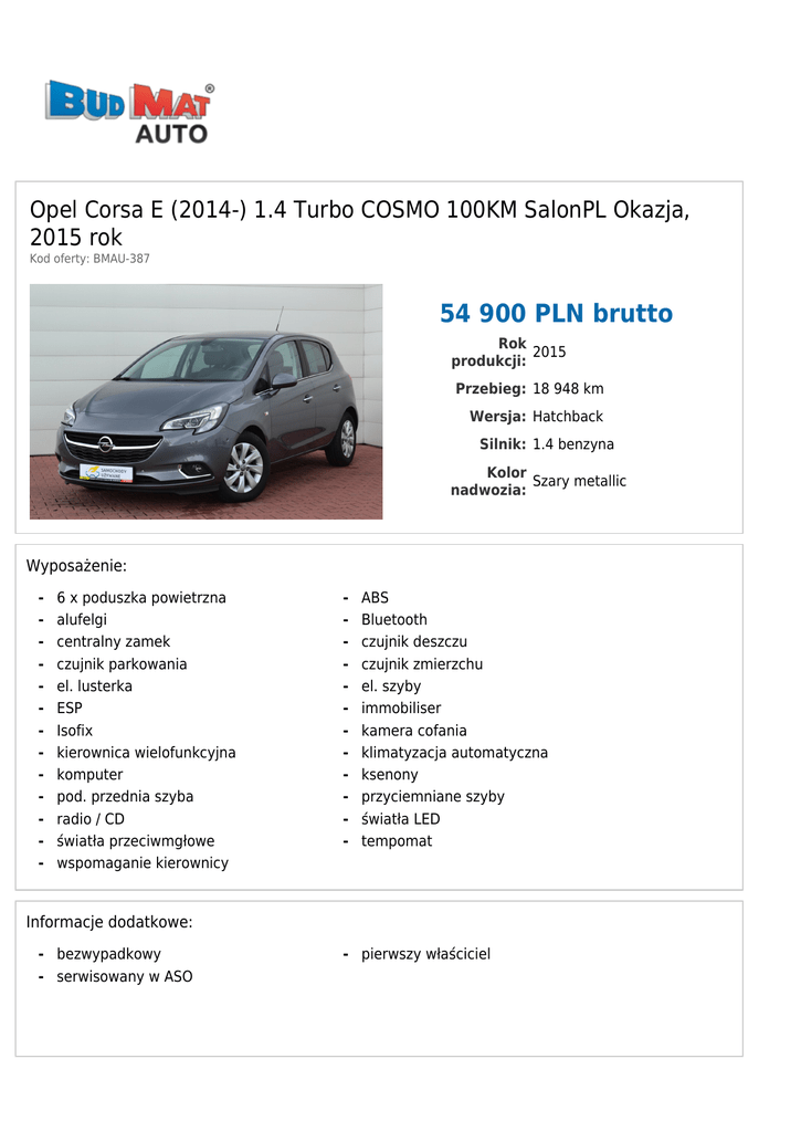 Opel Corsa E (2014-) 1.4 Turbo COSMO 100KM SalonPL Okazja, 2015 rok Kod oferty: BMAU-387 54 900 PLN brutto Rok 2015 produkcji: Przebieg: 18 948 km Wersja: Hatchback Silnik: 1.4 benzyna Kolor Szary metallic nadwozia: Wyposażenie: - 6 x poduszka powietrzna alufelgi centralny zamek czujnik parkowania el. lusterka ESP Isofix kierownica wielofunkcyjna komputer pod. przednia szyba radio / CD światła przeciwmgłowe wspomaganie kierownicy - ABS Bluetooth czujnik deszczu czujnik zmierzchu el. szyby immobiliser kamera cofania klimatyzacja automatyczna ksenony przyciemniane szyby światła LED tempomat Informacje dodatkowe: - bezwypadkowy - serwisowany w ASO - pierwszy właściciel BUDMAT AUTO Sp. z o.o. ul. Bielska 55 09-400 Płock Tel.: +48 501197036 Fax: