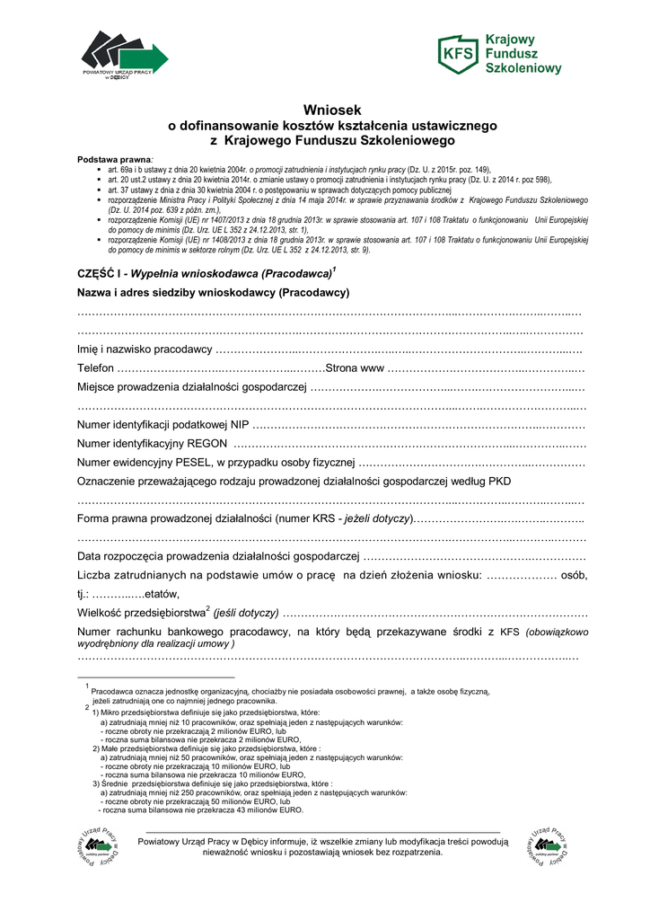 Wniosek o dofinansowanie kosztów kształcenia ustawicznego z Krajowego Funduszu Szkoleniowego Podstawa prawna: art. 69a i b ustawy z dnia 20 kwietnia 2004r. o promocji zatrudnienia i instytucjach rynku pracy (Dz. U. z 2015r. poz. 149), art. 20 ust.2 ustawy z dnia 20 kwietnia 2014r. o zmianie ustawy o promocji zatrudnienia i instytucjach rynku pracy (Dz. U. z 2014 r. poz 598), art. 37 ustawy z dnia z dnia 30 kwietnia 2004 r. o postępowaniu w sprawach dotyczących pomocy publicznej rozporządzenie Ministra Pracy i Polityki Społecznej z dnia 14 maja 2014r. w sprawie przyznawania środków z Krajowego Funduszu Szkoleniowego (Dz. U. 2014 poz. 639 z późn. zm.), rozporządzenie Komisji (UE) nr 1407/2013 z dnia 18 grudnia 2013r. w sprawie stosowania art. 107 i 108 Traktatu o funkcjonowaniu Unii Europejskiej do pomocy de minimis (Dz. Urz. UE L 352 z 24.12.2013, str. 1), rozporządzenie Komisji (UE) nr 1408/2013 z dnia 18 grudnia 2013r. w sprawie stosowania art. 107 i 108 Traktatu o funkcjonowaniu Unii Europejskiej do pomocy de minimis w sektorze rolnym (Dz. Urz. UE L 352 z 24.12.2013, str. 9). CZĘŚĆ I - Wypełnia wnioskodawca (Pracodawca)1 Nazwa i adres siedziby wnioskodawcy (Pracodawcy) …………………………………………………………………………………………...…………….……..……..… …………………………………………………….…………………………………………………..…..…………… Imię i nazwisko pracodawcy …………………..………………….…..…..…………………………..………...…. Telefon ………………………..………………..………Strona www ………………………………..…………..… Miejsce prowadzenia działalności gospodarczej ……………….………………...…….……………………...… …………………………………………………………………………………………...…….……………………..… Numer identyfikacji podatkowej NIP ……………………………………………………………………..………… Numer identyfikacyjny REGON …………………………………………………………………...…………..…… Numer ewidencyjny PESEL, w przypadku osoby fizycznej …………………………….…………..…………… Oznaczenie przeważającego rodzaju prowadzonej działalności gospodarczej według PKD …………………………………………………………………………………………...…………..………..……..… Forma prawna prowadzonej działalności (numer KRS - jeżeli dotyczy)…………………….….……..……….. ………………………………………………………………………………………….……………..….……..……… Data rozpoczęcia prowadzenia działalności gospodarczej ……………………………………….…………… Liczba zatrudnianych na podstawie umów o pracę na dzień złożenia wniosku: ………………. osób, tj.: ………..….etatów, Wielkość przedsiębiorstwa2 (jeśli dotyczy) ………………………………………………………………………… Numer rachunku bankowego pracodawcy, na który będą przekazywane środki z KFS (obowiązkowo wyodrębniony dla realizacji umowy ) ……………………………………………………………………………………………..………...……………..… 1 2 Pracodawca oznacza jednostkę organizacyjną, chociażby nie posiadała osobowości prawnej, a także osobę fizyczną, jeżeli zatrudniają one co najmniej jednego pracownika. 1) Mikro przedsiębiorstwa definiuje się jako przedsiębiorstwa, które: a) zatrudniają mniej niż 10 pracowników, oraz spełniają jeden z następujących warunków: - roczne obroty nie przekraczają 2 milionów EURO, lub - roczna suma bilansowa nie przekracza 2 milionów EURO, 2) Małe przedsiębiorstwa definiuje się jako przedsiębiorstwa, które : a) zatrudniają mniej niż 50 pracowników, oraz spełniają jeden z następujących warunków: - roczne obroty nie przekraczają 10 milionów EURO, lub - roczna suma bilansowa nie przekracza 10 milionów EURO, 3) Średnie przedsiębiorstwa definiuje się jako przedsiębiorstwa, które : a) zatrudniają mniej niż 250 pracowników, oraz spełniają jeden z następujących warunków: - roczne obroty nie przekraczają 50 milionów EURO, lub - roczna suma bilansowa nie przekracza 43 milionów EURO. Powiatowy Urząd Pracy w Dębicy informuje, iż wszelkie zmiany lub modyfikacja treści powodują nieważność wniosku i pozostawiają wniosek bez rozpatrzenia. Dane osoby upoważnionej do kontaktu: Imię i nazwisko ……………………………………………..……...………………………………………………… Telefon ……………………………….………………….…..…………………………………………………….… Fax ………………………….……………….............................................................................................. e-mail …………………………….……………………….……………………………………………………..…… Działania do sfinansowania w ramach Krajowego Funduszu Szkoleniowego oraz wysokość wydatków związanych z kształceniem – stanowi złącznik nr 1 do wniosku Uzasadnienie potrzeby odbycia kształcenia ustawicznego, przy uwzględnieniu obecnych lub przyszłych potrzeb pracodawcy. ………………………………………………………………………….………………..…………………….……… ………………………………………………………………………….……………………………..….….……….. ………………………………………………………………………….……