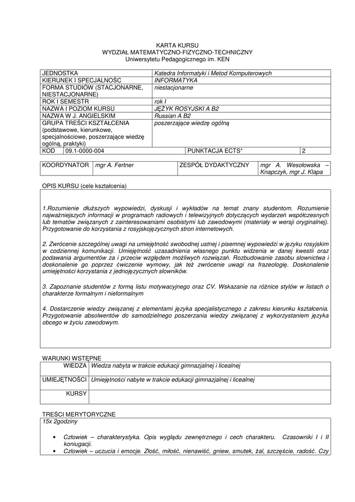 KARTA KURSU WYDZIAŁ MATEMATYCZNO-FIZYCZNO-TECHNICZNY Uniwersytetu Pedagogicznego im. KEN JEDNOSTKA KIERUNEK I SPECJALNOŚC FORMA STUDIÓW (STACJONARNE, NIESTACJONARNE) ROK I SEMESTR NAZWA I POZIOM KURSU NAZWA W J. ANGIELSKIM GRUPA TREŚCI KSZTAŁCENIA (podstawowe, kierunkowe, specjalnościowe, poszerzające wiedzę ogólną, praktyki) KOD 09.1-0000-004 KOORDYNATOR mgr A. Fertner Katedra Informatyki i Metod Komputerowych INFORMATYKA niestacjonarne rok I JĘŻYK ROSYJSKI A B2 Russian A B2 poszerzające wiedzę ogólną PUNKTACJA ECTS* ZESPÓŁ DYDAKTYCZNY 2 mgr A. Wesołowska – Knapczyk, mgr J. Klapa OPIS KURSU (cele kształcenia) 1.Rozumienie dłuższych wypowiedzi, dyskusji i wykładów na temat znany studentom. Rozumienie najważniejszych informacji w programach radiowych i telewizyjnych dotyczących wydarzeń współczesnych lub tematów związanych z zainteresowaniami osobistymi lub zawodowymi (materiały w wersji oryginalnej). Przygotowanie do korzystania z rosyjskojęzycznych stron internetowych. 2. Zwrócenie szczególnej uwagi na umiejętność swobodnej ustnej i pisemnej wypowiedzi w języku rosyjskim w codziennej komunikacji. Umiejętność uzasadnienia własnego punktu widzenia w danej kwestii oraz podawania argumentów za i przeciw względem możliwych rozwiązań. Rozbudowanie zasobu słownictwa i doskonalenie go poprzez ćwiczenie wymowy, jak też zwrócenie uwagi na frazeologię. Doskonalenie umiejętności korzystania z jednojęzycznych słowników. 3. Zapoznanie studentów z formą listu motywacyjnego oraz CV. Wskazanie na różnice stylów w listach o charakterze formalnym i nieformalnym 4. Dostarczenie wiedzy związanej z elementami języka specjalistycznego z zakresu kierunku kształcenia. Przygotowanie absolwentów do samodzielnego poszerzania wiedzy związanej z wykorzystaniem języka obcego w życiu zawodowym. WARUNKI WSTĘPNE WIEDZA Wiedza nabyta w trakcie edukacji gimnazjalnej i licealnej UMIEJĘTNOŚCI Umiejętności nabyte w trakcie edukacji gimnazjalnej i licealnej KURSY TREŚCI MERYTORYCZNE 15x 2godziny • • Człowiek – charakterystyka. Opis wyglądu zewnętrznego i cech charakteru. Czasowniki I i II koniugacji. Człowiek – uczucia i emocje. Złość, miłość, nienawiść, gniew, smutek, żal, szczęście, radość. Czy • • • • • • • • • • • • • jesteś szczęśliwym człowiekiem? Czas przeszły. Człowiek – relacje i więzy rodzinne, ważne wydarzenia i momenty w życiu osobistym. Człowiek – moja rodzina, problemy i konflikty pokoleniowe. Czas przyszły prosty i złożony. Człowiek – etapy życia, ćwiczenia leksykalne. Praca z tekstem zawierającym elementy języka specjalistycznego. Wybór zawodu, praca – popularne zawody. Czasowniki zwrotne. Wybór zawodu, praca – problem bezrobocia. Tryb rozkazujący. Wybór zawodu, praca – poszukiwanie pracy, rozmowy kwalifikacyjne, list motywacyjny. Tryb przypuszczający. Praca z tekstem zawierającym elementy języka specjalistycznego. Podróże – miasta, zabytki, atrakcje turystyczne. Podróże – środki transportu i komunikacji. Rzeczowniki I deklinacji. Podróże – czas urlopów, przygotowania do wyjazdu. Podróże – w hotelu, w pensjonacie, na campingu. Rzeczowniki II deklinacji. Podróże – w biurze turystycznym. EFEKTY KSZTAŁCENIA WIEDZA Efekt kształcenia dla kursu W 1 (dla pierwszego bloku tematycznego „Człowiek”) Student charakteryzuje inne osoby oraz ich emocje wykorzystując przy tym poznaną, adekwatną leksykę. W 2 (dla drugiego bloku tematycznego „Wybór zawodu, praca” ) Student przy użyciu odpowiedniego zasobu leksykalno- gramatycznego wskaże i opisze współczesne problemy związane z rynkiem pracy, problemem bezrobocia. W 3 (dla trzeciego bloku tematycznego ”Podróże”) Student przy użyciu odpowiedniego zasobu leksykalno- gramatycznego przedstawi i sklasyfikuje zabytki swojego miasta, przedstawi możliwości spędzania wolnego czasu/urlopu, zrelacjonuje przebyte podróże. Efekty kształcenia dla kierunku K_U19 UMIEJĘTNOŚCI Efekt kształcenia dla kursu U 1 (dla pierwszego bloku tematycznego „Człowiek”) Student opisze i zinterpretuje, korzystając z poznanego zasobu leksykalno gramatycznego języka specjalistycznego, swoje i innych uczucia, zachowania oraz emocje. Przedstawi siebie i swoją rodzinę, wskaże panujące relacje międzyludzkie. Efekty kształcenia dla kierunku U 2 (dla drugiego bloku tematycznego „Wybór zawodu, praca” ) Sklasyfikuje aktualne zawody, oceni je z punktu widzenia możliwości znalezienia pracy, prestiżu, przedstawi swój przyszły, związany z kierunkiem studiów zawód . K_U19 U 3 (dla trzeciego bloku tematycznego ”Podróże”) Student wyszuka i zamówi ofertę biura podróży, wynajmie przewodnika, zarezerwuje pokój w hotelu/przejazd pociągiem/lot samolotem. Student potrafi posługiwać się podstawowymi sformułowaniami z zakresu języka specjalistycznego KOMPETENCJE SPOŁECZNE Efekt kształcenia dla kursu K 1 Student posiada kompetencje w zakresie zastosowania wiedzy teoretycznej i praktycznej nabytej podczas kursu w komunikacji w języku rosyjskim. K 2 Student komunikuje się i potrafi pracować w zakresie języków specjalistycznych w środowisku międzynarodowym. Potrafi funkcjonować w innej kulturze. K 3 Student inicjuje i uczestniczy w rozmowach w języku rosyjskim Efekty kształcenia dla kierunku K_U19, K_K09 ORGANIZACJA ZAJĘC FORMA ZAJĘC LICZBA GODZIN 30 WYKŁAD A K 30 CWICZENIA W GRUPACH L S P E OPIS METOD PROWADZENIA ZAJĘC Konwersatorium: METODA KOMUNIKACYJNA Celem metody komunikacyjnej jest rozwinięcie umiejętności skutecznego i swobodnego porozumiewania się w języku obcym w sposób odpowiadający danym okolicznościom. Wykorzystywanie tej metody podczas zajęć ma na celu stworzenie różnorodnych sytuacji zbliżonych do komunikacji w życiu codziennym. Szczególnie istotne są ćwiczenia, w których uczestnicy odgrywają dialogi w parach, bądź prowadzą 