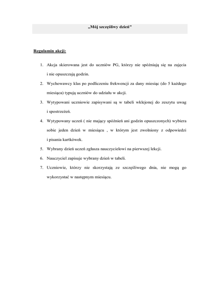„Mój szczęśliwy dzień" Regulamin akcji: 1. Akcja skierowana jest do uczniów PG, którzy nie spóźniają się na zajęcia i nie opuszczają godzin. 2. Wychowawcy klas po podliczeniu frekwencji za dany miesiąc (do 5 każdego miesiąca) typują uczniów do udziału w akcji. 3. Wytypowani uczniowie zapisywani są w tabeli wklejonej do zeszytu uwag i spostrzeżeń. 4. Wytypowany uczeń ( nie mający spóźnień ani godzin opuszczonych) wybiera sobie jeden dzień w miesiącu , w którym jest zwolniony z odpowiedzi i pisania kartkówek. 5. Wybrany dzień uczeń zgłasza nauczycielowi na pierwszej lekcji. 6. Nauczyciel zapisuje wybrany dzień w tabeli. 7. Uczniowie, którzy nie skorzystają ze szczęśliwego dnia, nie mogą go wykorzystać w następnym miesiącu.