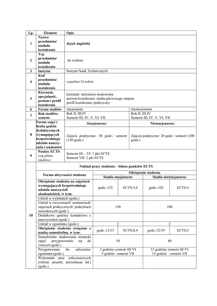 Lp. 1 2 3 4 5 6 7 8 9 Element Nazwa przedmiotu/ modułu kształcenia Typ przedmiotu/ modułu kształcenia Instytut Kod przedmiotu/ modułu kształcenia Kierunek, specjalność, poziom i profil kształcenia Forma studiów Rok studiów, semestr Forma zajęć i liczba godzin dydaktycznych wymagających bezpośredniego udziału nauczyciela i studentów Punkty ECTS (wg planu studiów) Opis Język angielski do wyboru Instytut Nauk Technicznych wypełnia Uczelnia kierunek: inżynieria środowiska poziom kształcenia: studia pierwszego stopnia profil kształcenia: praktyczny stacjonarne Rok II, III,IV Semestr III, IV, V, VI, VII niestacjonarne Rok II, III,IV Semestr III, IV, V, VI, VII Stacjonarne: Niestacjonarne: Zajęcia praktyczne: 30 godz./ semestr (150 godz.) Zajęcia praktyczne: 20 godz./ semestr (100 godz.) Semestr III – VI: 1 pkt ECTS Semestr VII: 2 pkt ECTS Nakład pracy studenta – bilans punktów ECTS Forma aktywności studenta 10 Obciążenie studenta na zajęciach wymagających bezpośredniego udziału nauczycieli akademickich, w tym: Udział w wykładach (godz.) Udział w ćwiczeniach/ seminariach/ zajęciach praktycznych/ praktykach zawodowych (godz.) Dodatkowe godziny kontaktowe z nauczycielem (godz.) Udział w egzaminie (godz.) Obciążenie studenta związane z nauką samodzielną, w tym: Samodzielne studiowanie tematyki zajęć/ przygotowanie się do ćwiczeń (godz.) Przygotowanie do zaliczenia/ egzaminu (godz.) Wykonanie prac zaliczeniowych (referat, projekt, prezentacja itd.) (godz.) Obciążenie studenta Studia stacjonarne Studia niestacjonarne godz.:152 ECTS:5,6 godz.:102 ECTS:4 150 100 2 2 godz.:12/15 ECTS:0,4 godz.:52/55 ECTS:2 10 40 2 godziny semestr III-VI 5 godzin– semestr VII 12 godziny semestr III-VI 15 godzin – semestr VII 11 12 13 14 15 Obciążenie studenta w ramach zajęć związanych z praktycznym godz.: ECTS: godz.: ECTS: przygotowaniem zawodowym Suma (obciążenie studenta na zajęciach wymagających bezpośredniego godz.:164/167 ECTS:6 godz.:164/167 ECTS:6 udziału nauczycieli akademickich oraz związane z nauką samodzielną) Nauczyciel akademicki odpowiedzialny Mgr Magdalena Noworolnik za przedmiot/ moduł (egzaminujący) Nauczyciele mgr Magdalena Noworolnik akademiccy mgr Bartosz Warzycki prowadzący przedmiot/ moduł Wymagania Znajomość języka angielskiego na poziomie B1 (kompetencje) wstępne Doskonalenie i rozwijanie kompetencji językowych w zakresie czytania ze zrozumieniem, pisania, słuchania ze zrozumieniem oraz mówienia z użyciem Założenia i cele słownictwa specjalistycznego. Poszerzanie zasobu słownictwa, włączając słownictwo przedmiotu specjalistyczne. Przygotowanie studentów do wykorzystania języka angielskiego w środowisku zawodowym. Odniesienie Odniesienie do do efektów Opis efektów kształcenia w zakresie: kierunkowyc kształcenia h efektów dla obszaru kształcenia WIEDZY K_W02; K_W03; ma podstawową wiedzę w zakresie K_W06; kierunków studiów inżyniera środowiska K_W08; W1 T1P_W02 oraz potrafi przedstawić ją w języku K_W09; angielskim K_W10; K_W11; K_W14 Efekty K_W03; kształcenia ma wiedzę ogólną obejmującą kluczowe K_W04; W2 zagadnienia z zakresu inżynierii środowiska T1P_W03 K_W19; i potrafi przedstawić ją w języku angielskim K_W20; K_W21; UMIEJĘTNOŚCI potrafi pozyskiwać informacje z literatury, baz danych oraz innych właściwie dobranych źródeł, także w języku angielskim lub innym języku obcym uznawanym za K_U10; język komunikacji międzynarodowej w K_U14; U1 T1P_U01 zakresie studiowanego kierunku studiów; K_U15; potrafi integrować uzyskane informacje, K_U22 dokonywać ich interpretacji, a także wyciągać wnioski oraz formułować i uzasadniać opinie U2 U3 K1 K2 potrafi przygotować w języku polskim i języku obcym, uznawanym za podstawowy dla dziedzin nauki i dyscyplin naukowych, właściwych dla studiowanego kierunku T1P_U03 studiów, dobrze udokumentowane opracowanie problemów z zakresu studiowanego kierunku studiów ma umiejętności językowe w zakresie dziedzin nauki i dyscyplin naukowych, właściwych dla studiowanego kierunku T1P_U06 studiów, zgodne z wymaganiami określonymi dla poziomu B2 Europejskiego Systemu Opisu Kształcenia Językowego KOMPETENCJI SPOŁECZNYCH rozumie potrzebę uczenia się przez całe życie; potrafi inspirować i organizować T1P_K01 proces uczenia się innych osób potrafi współdziałać i pracować w grupie, T1P_K03 przyjmując w niej różne role K_U19 K_U04; K_U17; K_U22, K_U23 K_K01 K_K03 Zagadnienia ogólne – struktury gramatyczne: 1. Czasy gramatyczne: Present Simple, Present Continuous, Present Perfect Simple, present Perfect Continuous, Past Simple, Past Continuous, Past Perfect, Future Simple, Future Continuous, Future Perfect, be going to 2. Forma gerundialna i bezokolicznikowa, 3. Przymiotniki zakończone na –ed, -ing 4. Okresy warunkowe 1,2, 3 5. Mowa zależna 6. Strona bierna 7. Tworzenie pytań pośrednich i bezpośrednich 8. Czasowniki modalne: must, have to, may, might, shall, should, can, could, would, need Zagadnienia specjalizacyjne: 1. Geodesy; 2. Cartography; 3. Map types; 16 Treści kształcenia 4. Map reading; 5. Global Positioning System; 6. Land Surveyor’s Equipment; 7. Planet Earth; 8. Environmental Engineering; 9. Greenhouse Effect; 10. Acid Rain; 11. Renewable Energy; 12. Civil Engineering; 13. Buildings; 14. Roads and motorways; 15. Bridges; 16. Railways; 17. Tunnels; 18. Mine Surveying 17 Stosowane metody dydaktyczne Ćwiczenia, dyskusja, zajęcia praktyczne, pokaz, rozwiązywanie zadań, praca w grupach Sposób weryfikacji efektów kształcenia np. egzamin ustny, egzamin Efekt pisemny, zaliczenie ustne, kolokwium, projekt, referat, prezentacja, kształcenia sprawozdanie, dyskusje, obserwacja w czasie zajęć itd. Zaliczenie pisemne, prace domowe, dyskusje, obserwacja w czasie zajęć, W1 egzamin pisemny Metody Zaliczenie pisemne, prace domowe, dyskusje, obserwacja w czasie zajęć, weryfikacji W2 egzam